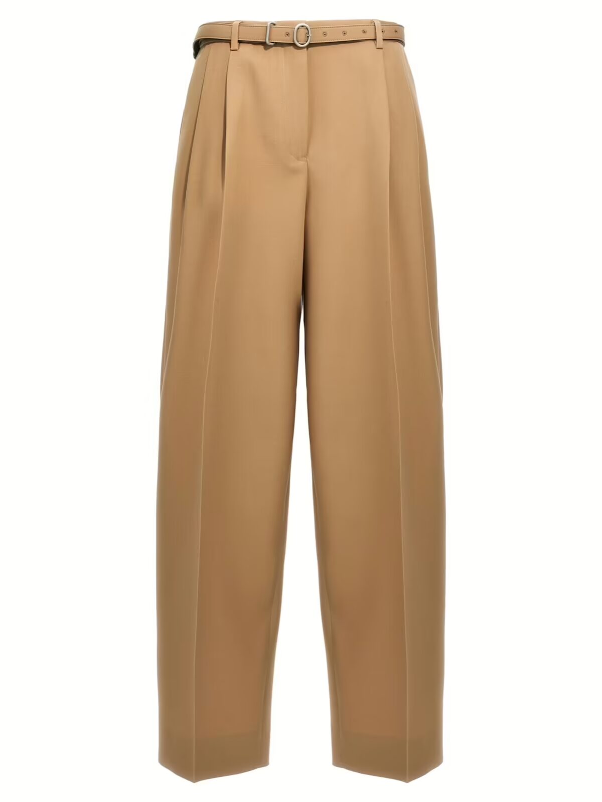 Ці бежеві жіночі штани з габардину є втіленням елегантності та сучасного стилю. Виготовлені з 100% вовни, вони забезпечують неперевершений комфорт і довговічність, а також підкреслюють увагу до деталей та якість, притаманні преміум сегменту моди. Штани мають широкий силует з витонченими стрілками та підкладковими швами, що додає елегантності та візуальної витонченості. Знімний пояс, застібка на ґудзик та блискавку, а також практичні кишені роблять їх універсальними для будь-якого випадку — від ділових зустрічей до вечірніх виходів. Цей виріб не лише підкреслює статус його власниці, але й демонструє прихильність до інноваційних підходів у моді, адже створений з матеріалів, що відповідають екологічним стандартам. Обираючи ці штани, ви обираєте розкіш, стиль і бездоганний смак.