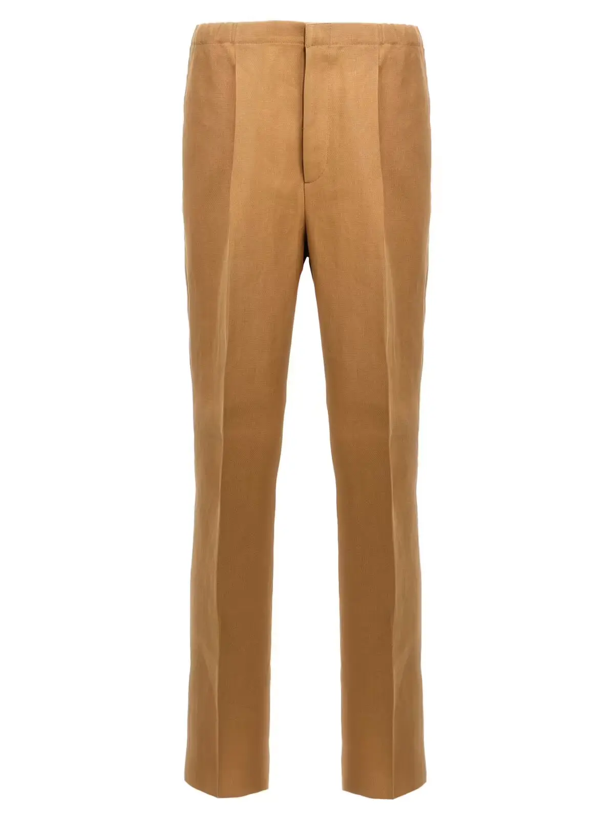 Відкрийте для себе елегантність та інноваційність із бежевими чоловічими штанами від Fendi, виготовленими з унікального паперового полотна. Ці штани поєднують в собі комфорт завдяки еластичному поясу та практичність із застібкою на гачок та кнопку. Додаткові залізні складки надають виробу витонченості, а кишені забезпечують зручність у використанні. Виготовлені на 100% з промислового паперу, ці штани є втіленням сучасного дизайну та екологічної свідомості.