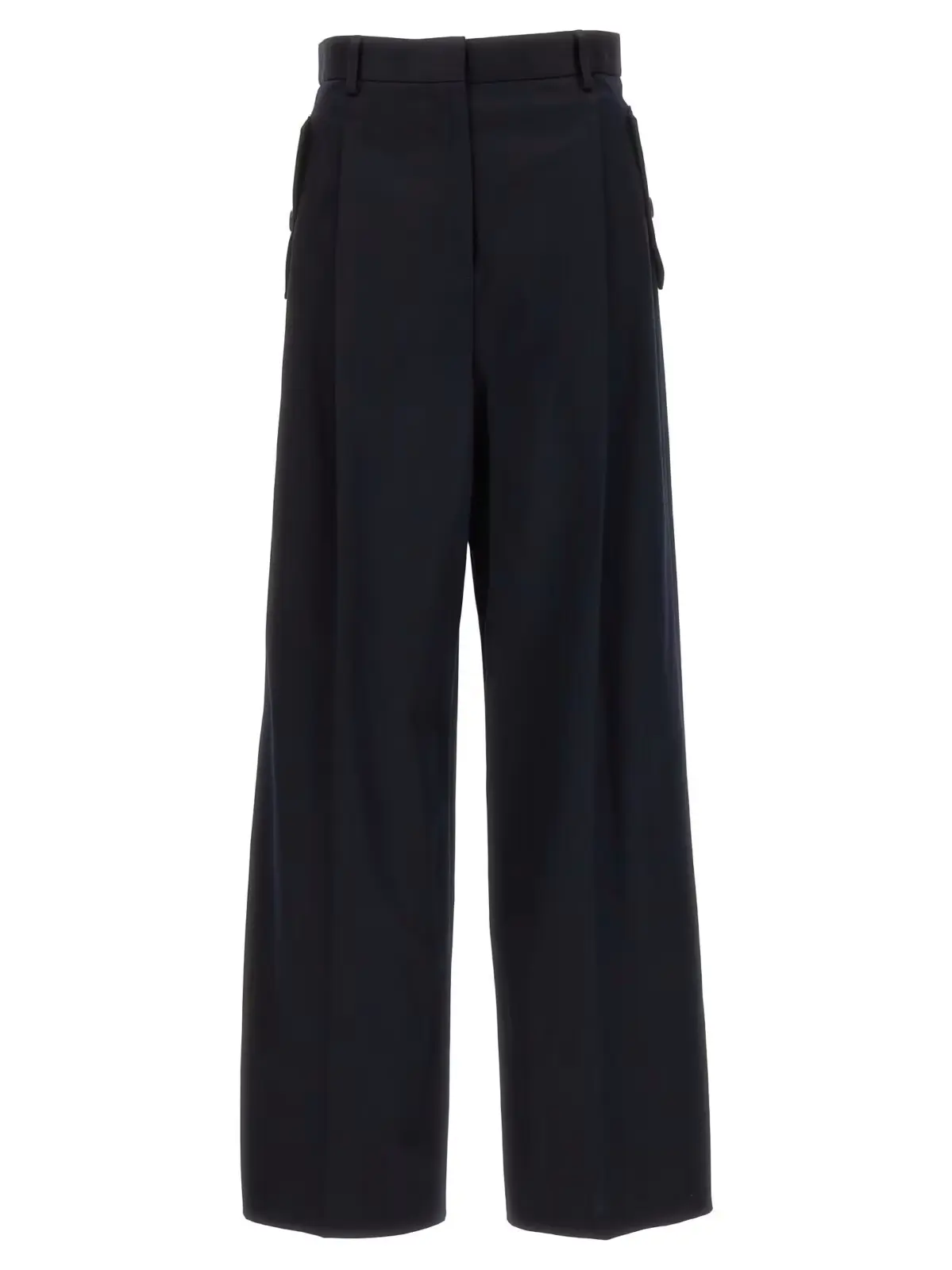 Елегантні сині жіночі штани Lanvin із 100% бавовни, оздоблені стрілками і широкими штанинами. Модель має передні складки, зручну застібку на гачок, кнопку та блискавку, а також кишені.