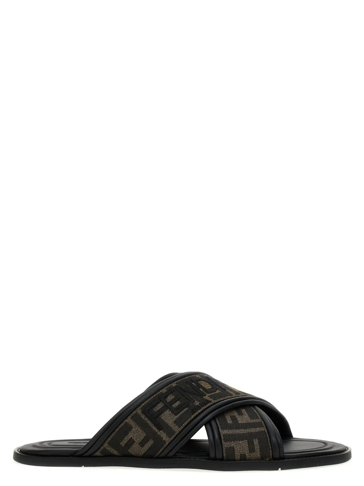 Сланці Fendi з логотипом — ідеальний вибір для стильних чоловіків. Чорні чоловічі сланці з логотипом мають подвійні перехресні ремінці, прикрашені жакардовим логотипом ‘FF’ та контрастною вишивкою ‘Fendi Roma’. Цей елегантний дизайн підкреслить ваш бездоганний смак та додасть завершеності вашому образу. Оберіть комфорт та розкіш із сланцями від Fendi.