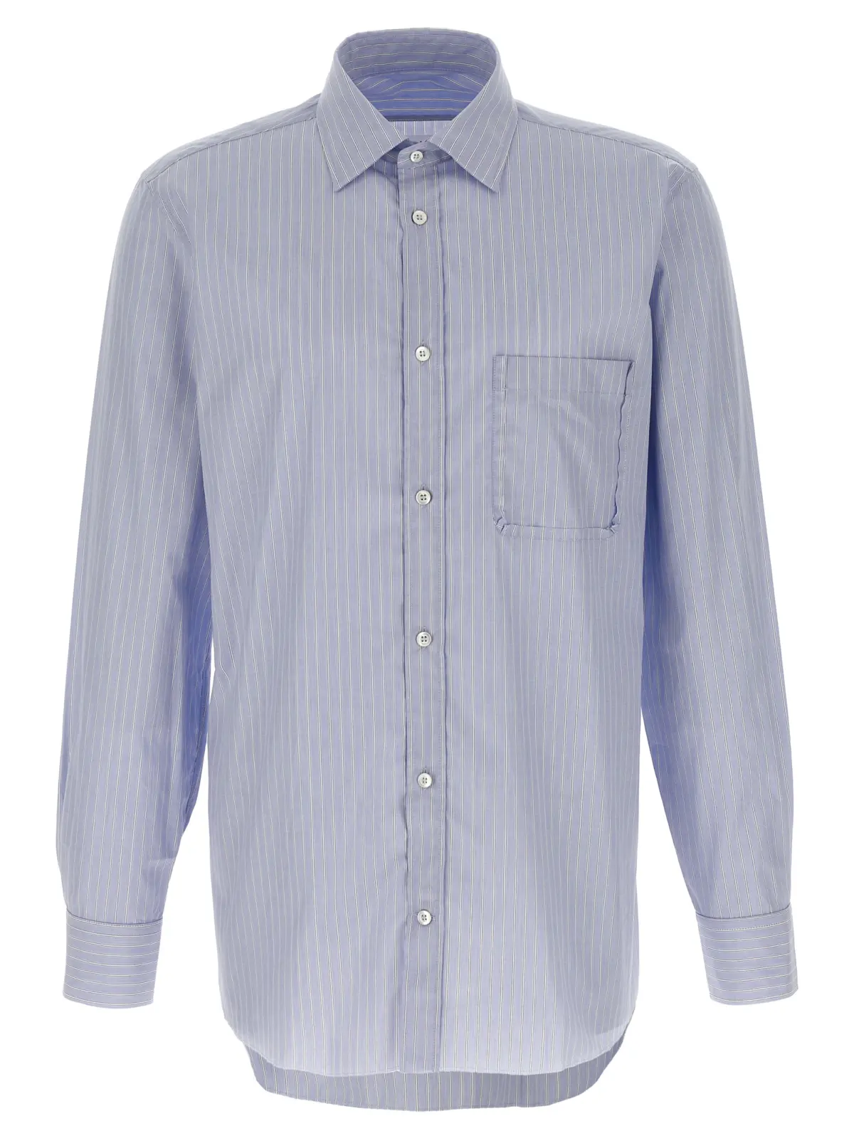 Смугастий бавовняний поплін. Нагрудна кишеня, фронтальна застібка на ґудзики та довгі рукави з манжетами. Необроблений нижній край та чотири знакові стібки на спинці.