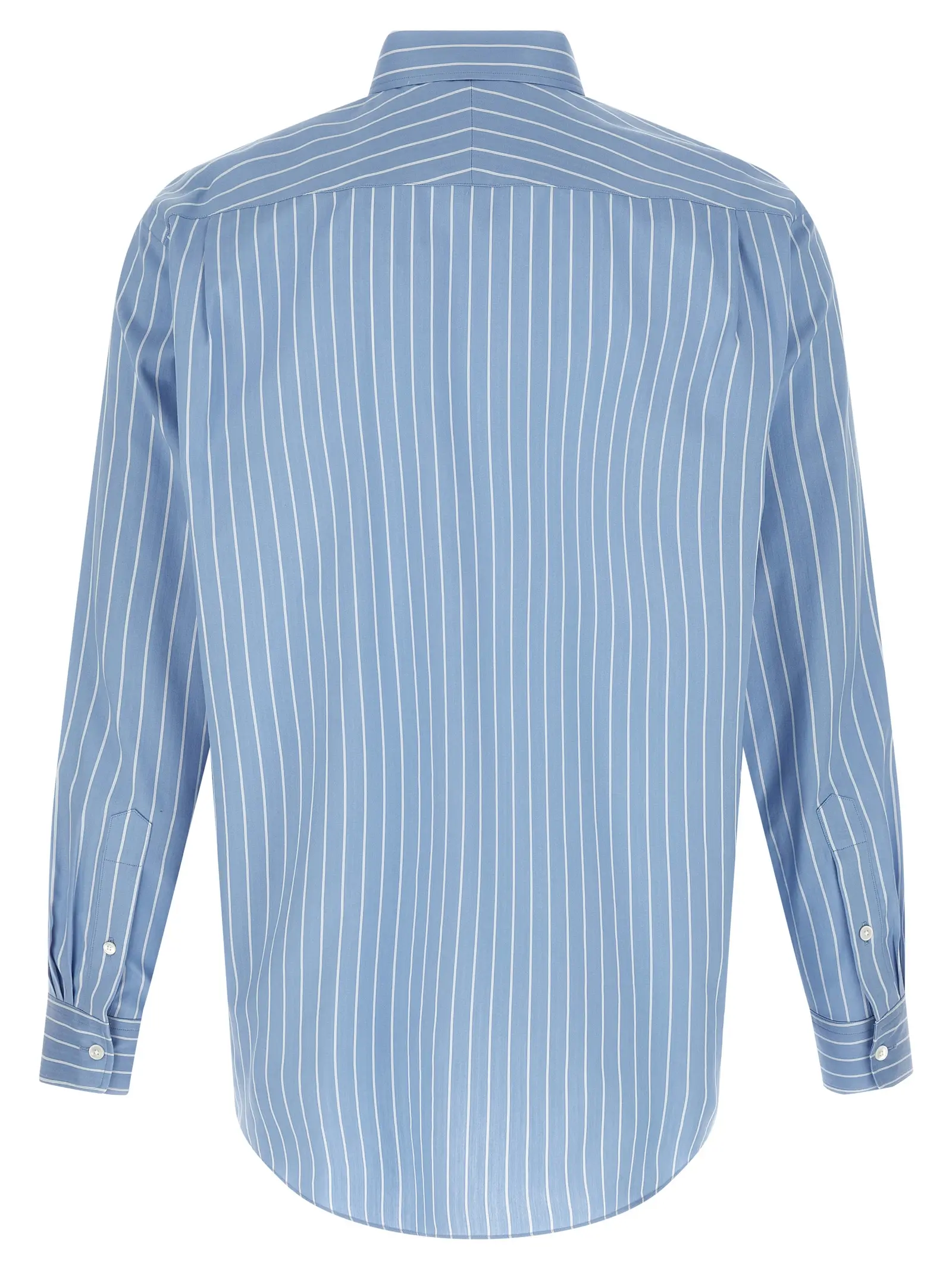 Нестандартний крій з асиметричним заокругленим краєм формує візуальну легкість, позбавлену зайвої суворості. Використання щільної тканини з довговолокнистої бавовни та натурального шовку забезпечує особливу гладкість поверхні. Вишуканість смугастого малюнка доповнюють відблиски природного перламутру на застібці. Чіткі лінії загостреного коміра та глибокі манжети додають структурованості м’якому силуету.
