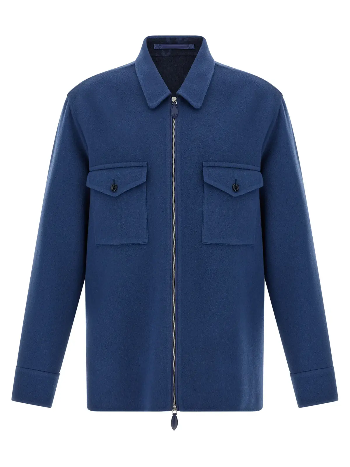 Ця чоловіча сорочка-оверчарт з подвійної тканини з вовни та кашеміру поєднує витонченість і практичність, забезпечуючи комфорт і стиль у будь-якій ситуації. Вишуканий синій відтінок, фронтальна застібка на блискавку та продумані деталі підкреслюють статус і бездоганний смак власника.