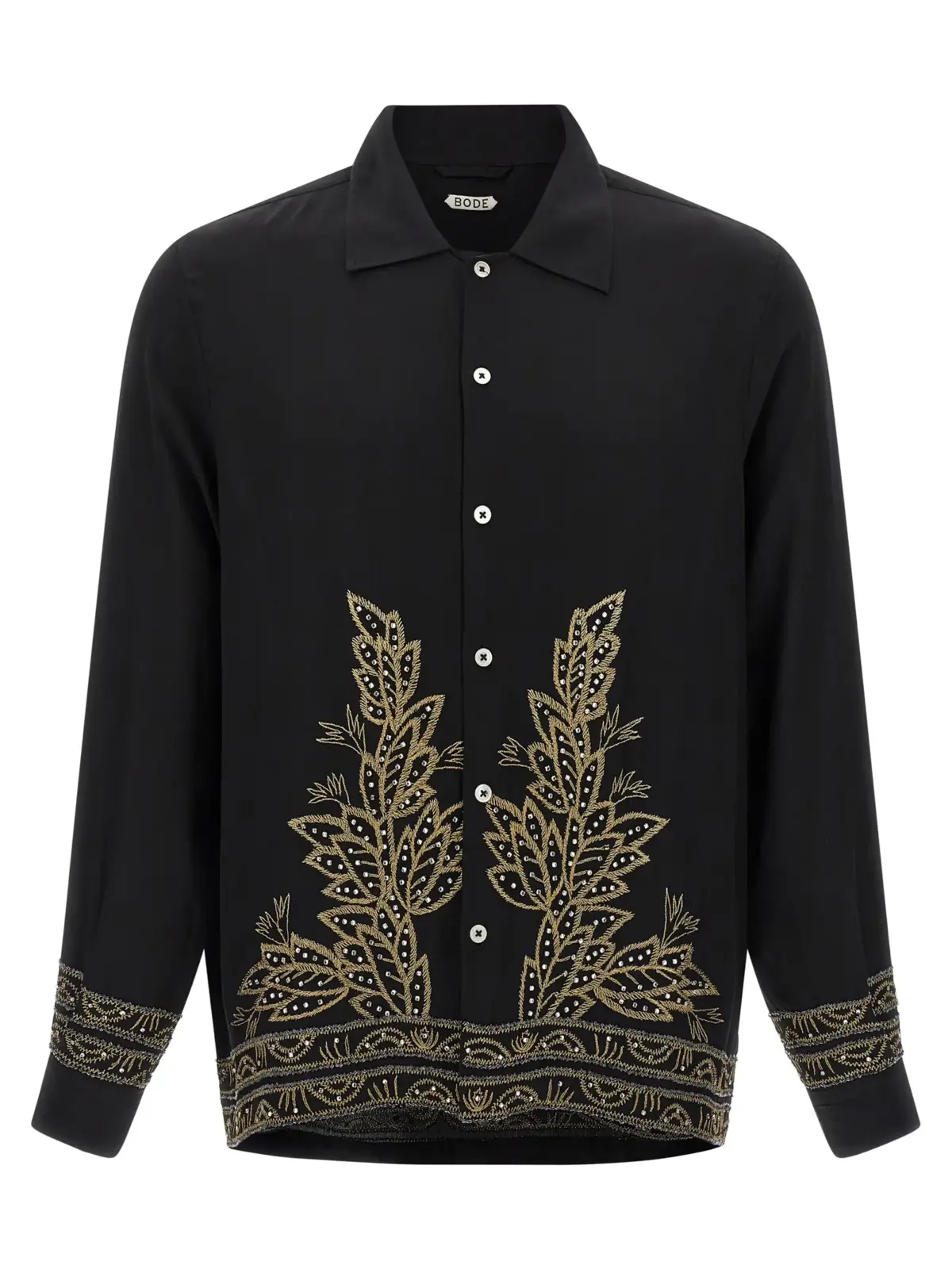 Чорна чоловіча сорочка з 100% шовку, оздоблена кришталевими стразами та вишуканою золотою вишивкою, поєднує в собі бездоганну якість та інноваційний дизайн. Вишуканий фасон із застібкою на гудзики та довгими манжетами підкреслює статус і неповторний стиль, роблячи цей виріб універсальним вибором для особливих випадків.