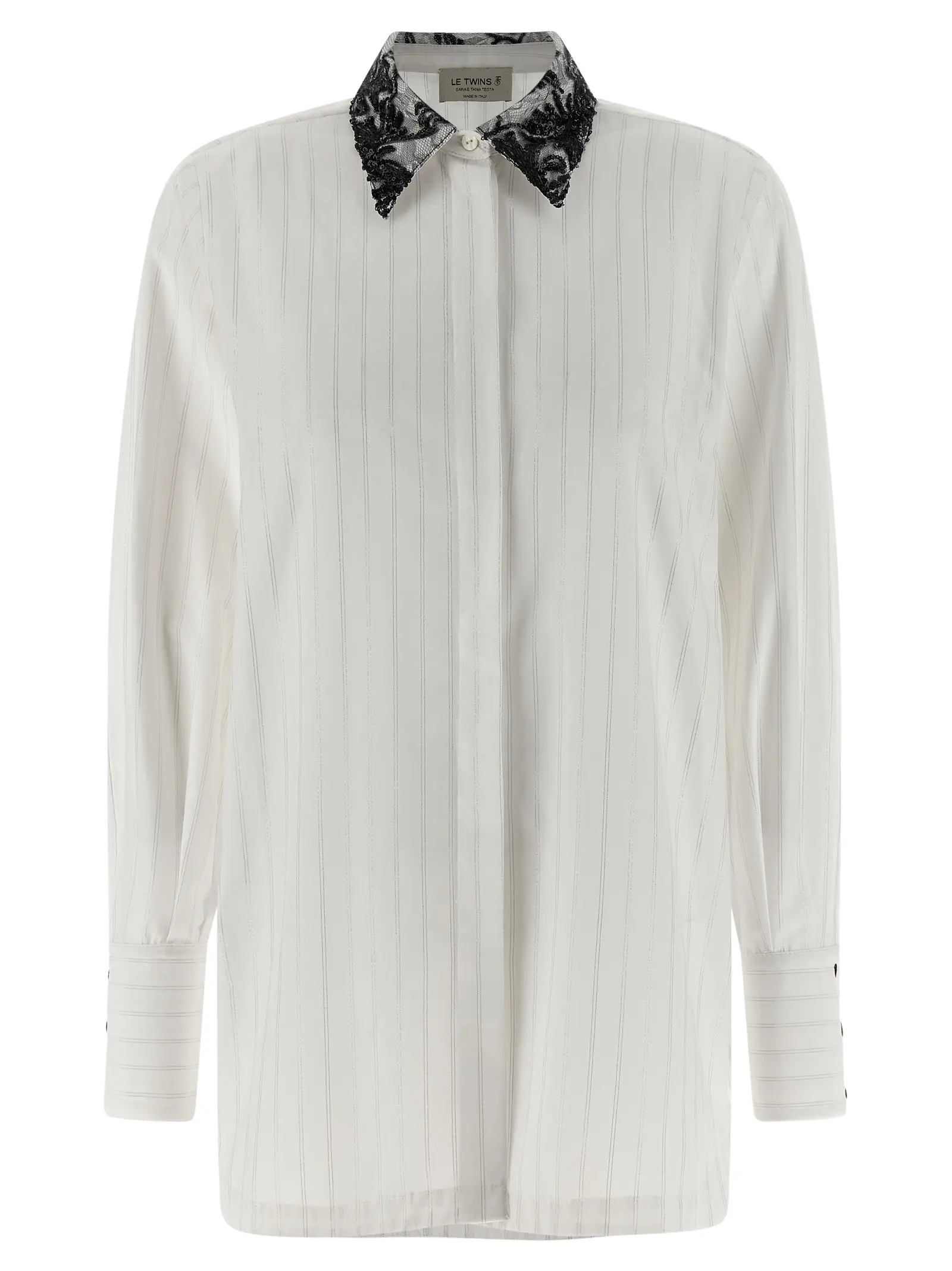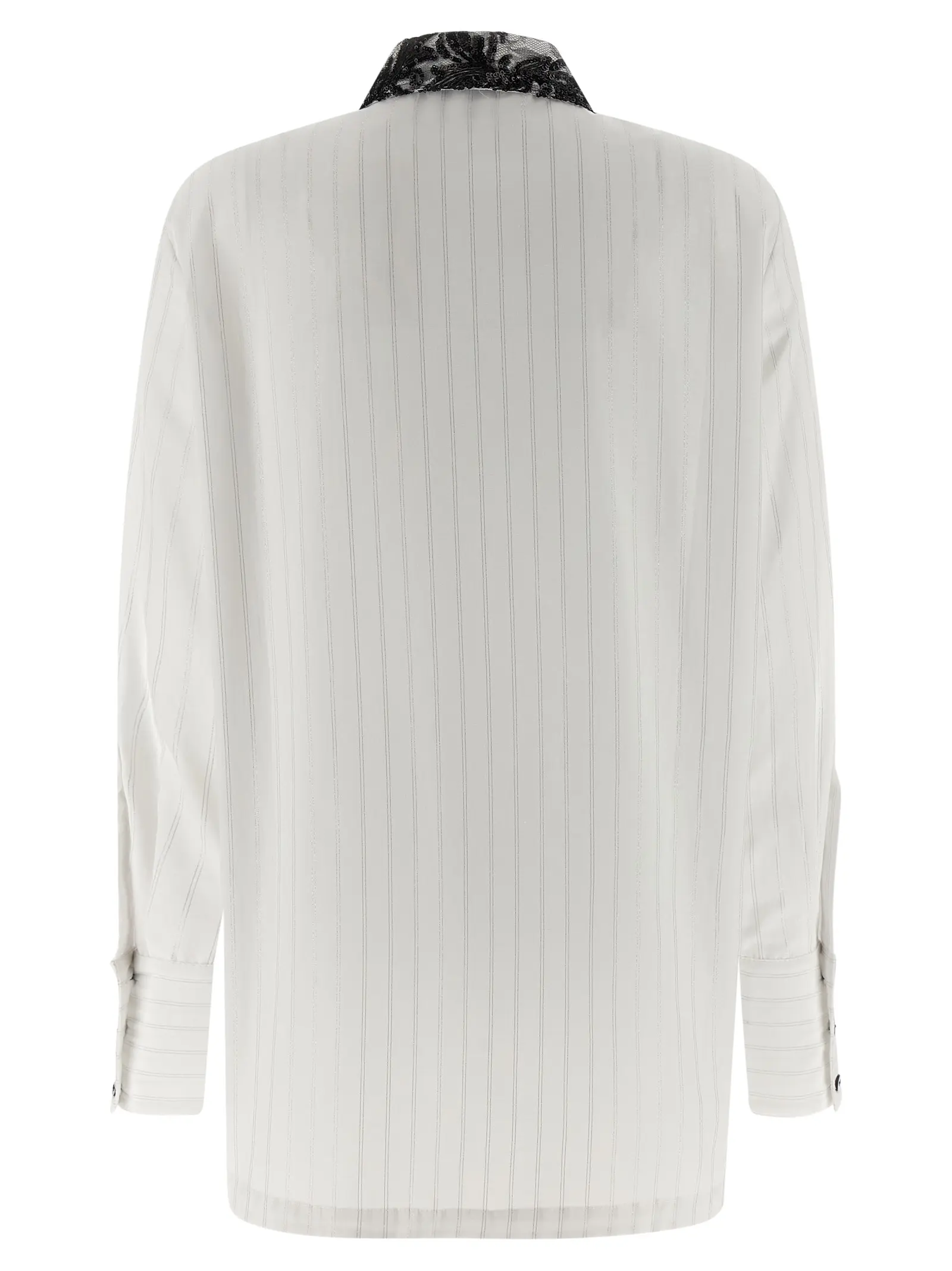 Сорочка з бавовняного попліну в смужку. Комірець з мереживом та паєтками. Застібка спереду на ґудзики. Довгі рукави з манжетами. Контрастні ґудзики на рукавах.