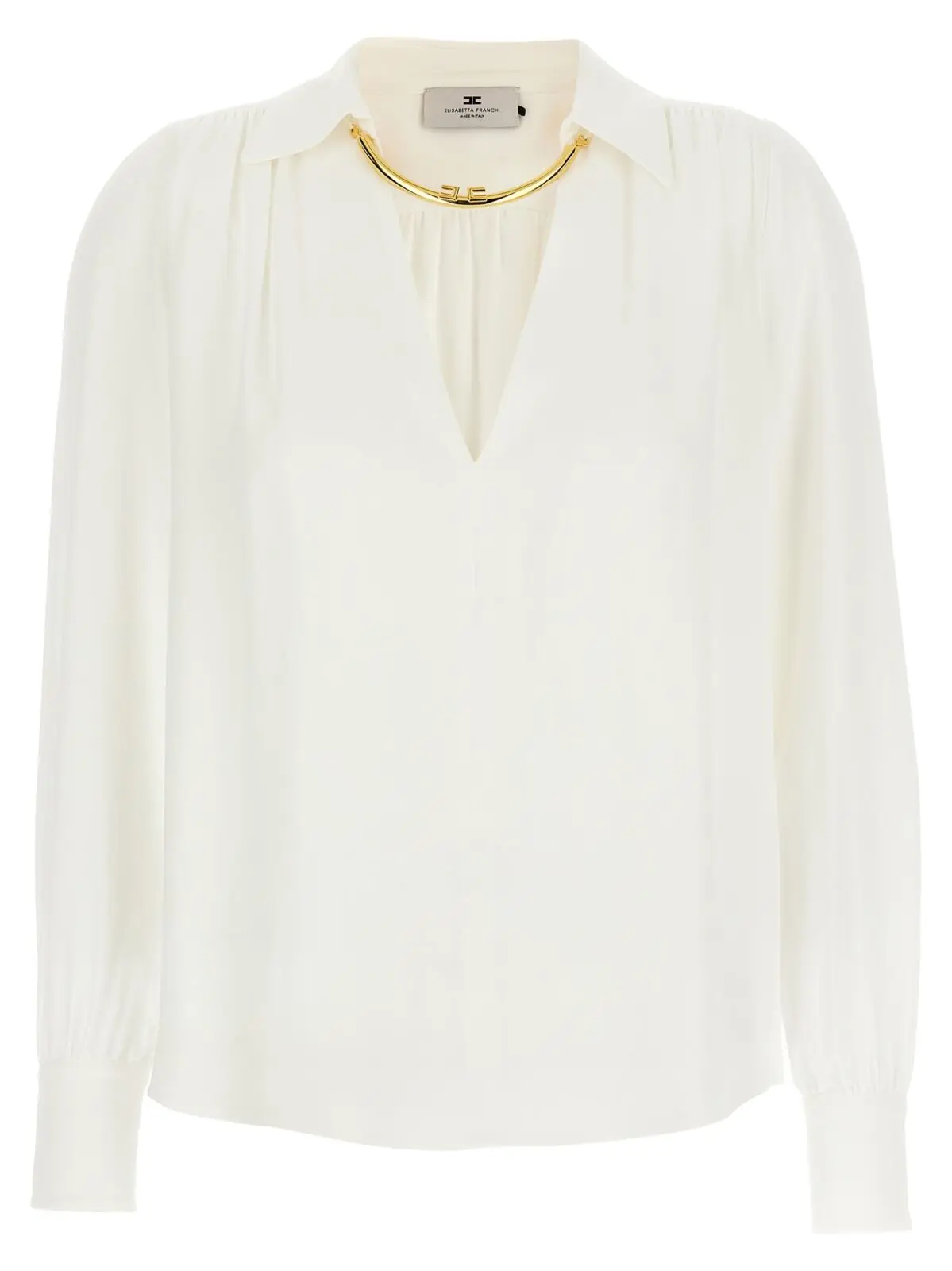 Елегантна жіноча сорочка з віскозного георгжету білого кольору, з вишуканим V-подібним вирізом та комірцем, прикрашеним знімним металевим намистом. Особливістю моделі є витончені рюші на плечах і довгі манжети, що підкреслюють неперевершений стиль і статус, поєднуючи комфорт та інноваційний дизайн.