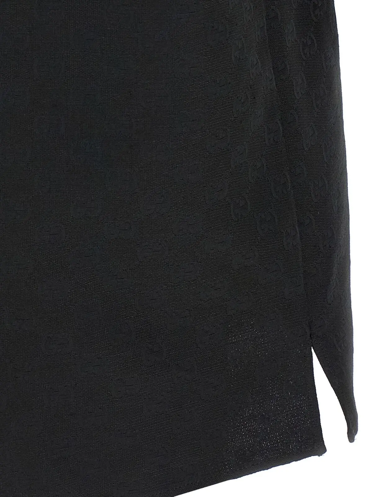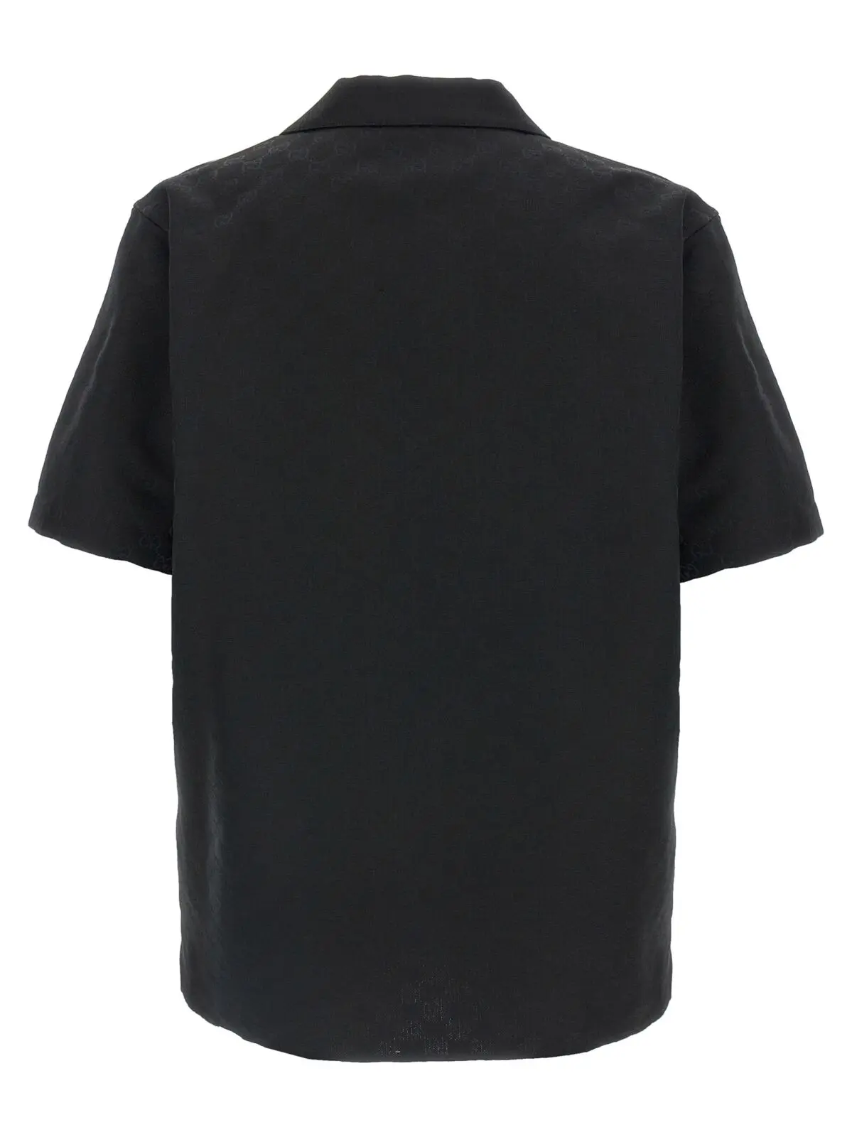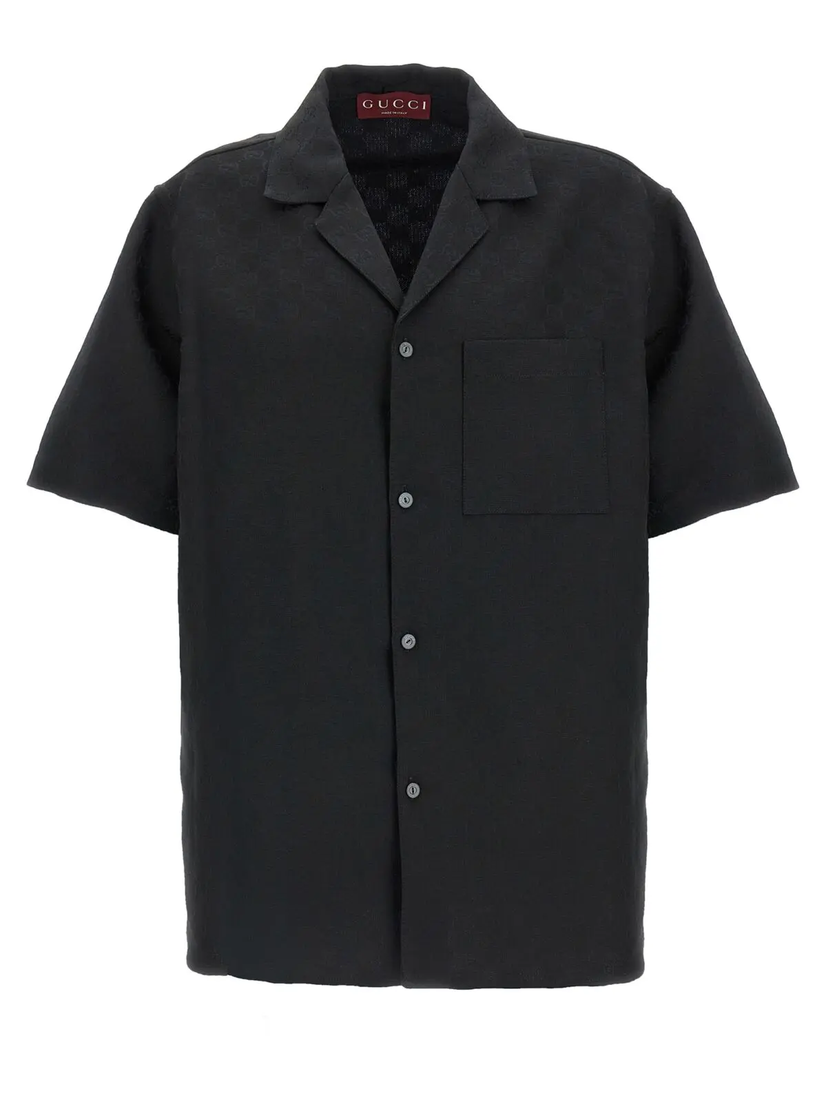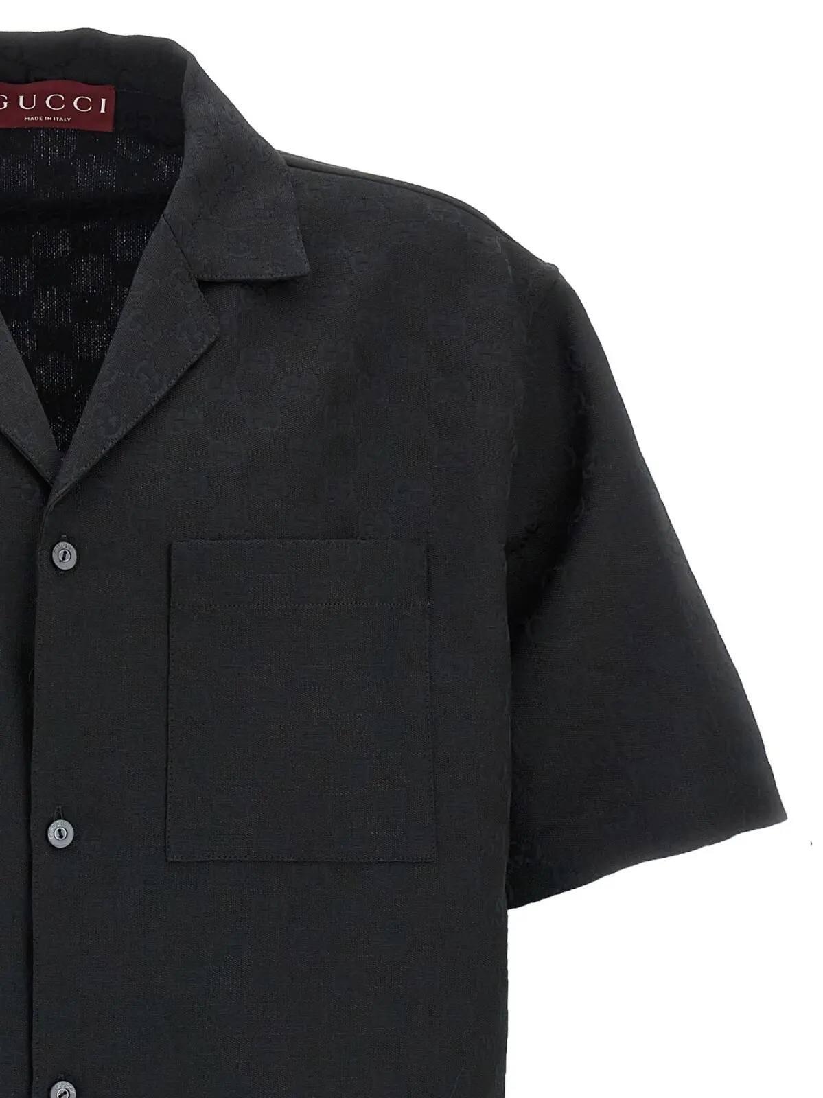 Чорна чоловіча сорочка з жакардової тканини з візерунком GG поєднує елегантність і комфорт завдяки високоякісному льону з домішком поліестеру. Вільний крій з V-подібним вирізом і лацканами, функціональна застібка на ґудзики, нагрудна кишеня та бокові розрізи створюють універсальний образ для стильних і впевнених у собі чоловіків.