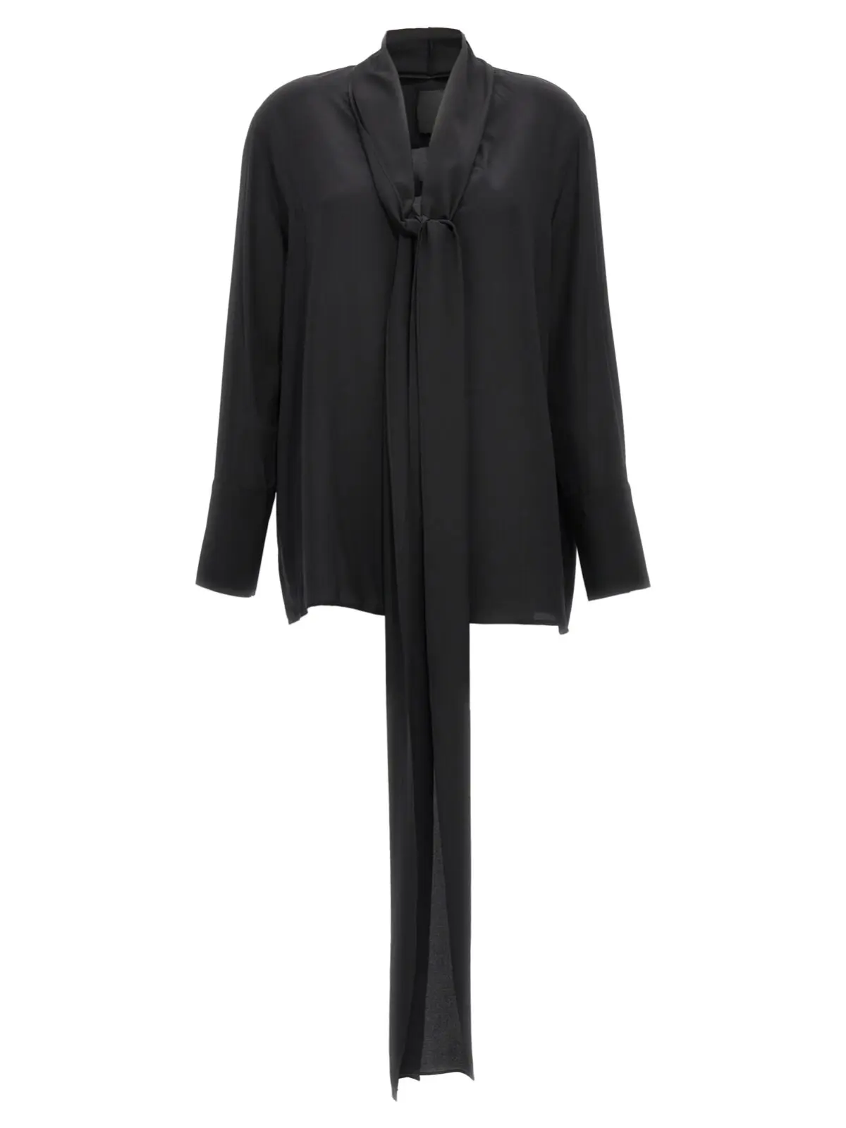 Елегантна чорна жіноча сорочка Givenchy, виконана з ніжного шовку crêpe de Chine, прикрашена стильним коміром-лавалльє. Модель має глибоке V-подібне декольте та довгі рукави з манжетами. Виріб повністю виготовлений з 100% шовку, що забезпечує високий рівень комфорту та елегантності.