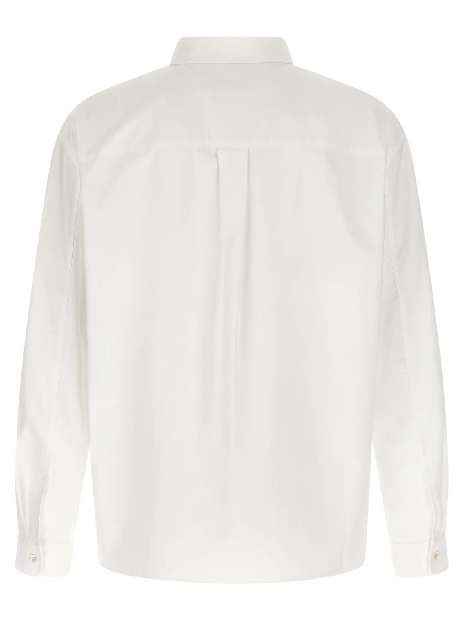 Асиметричний поділ та подовжена спинка трансформують звичний силует, додаючи делікатну графічність класичному крою. Натуральна бавовна забезпечує м’яку структурність, тоді як контрастна вишивка на нагрудній кишені стає впевненим візуальним акцентом. Високі манжети та комір на ґудзиках завершують лаконічний образ, де функціональність межує з витонченим змістом.