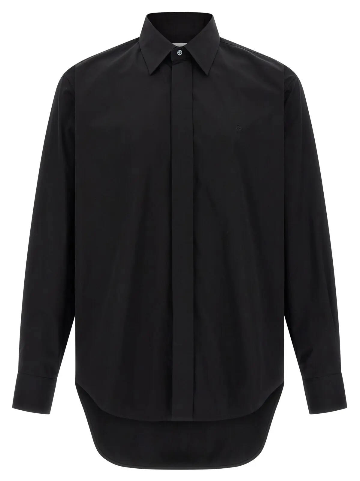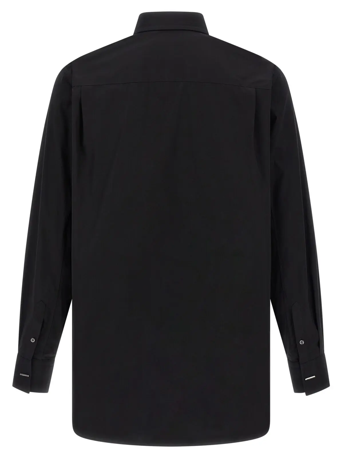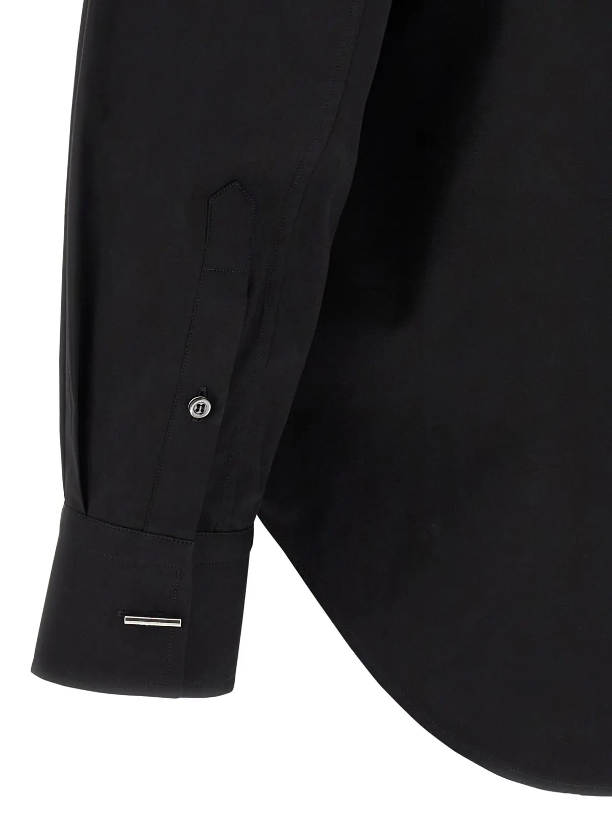 Чорна чоловіча сорочка з поплінової бавовни, прикрашена витонченим тон-в-тон вишитим логотипом, поєднує бездоганну якість із сучасним дизайном. Конструкція з прихованою застібкою та довгими манжетами для запонок підкреслює елегантність і універсальність, створюючи образ статусу та стильної впевненості.
