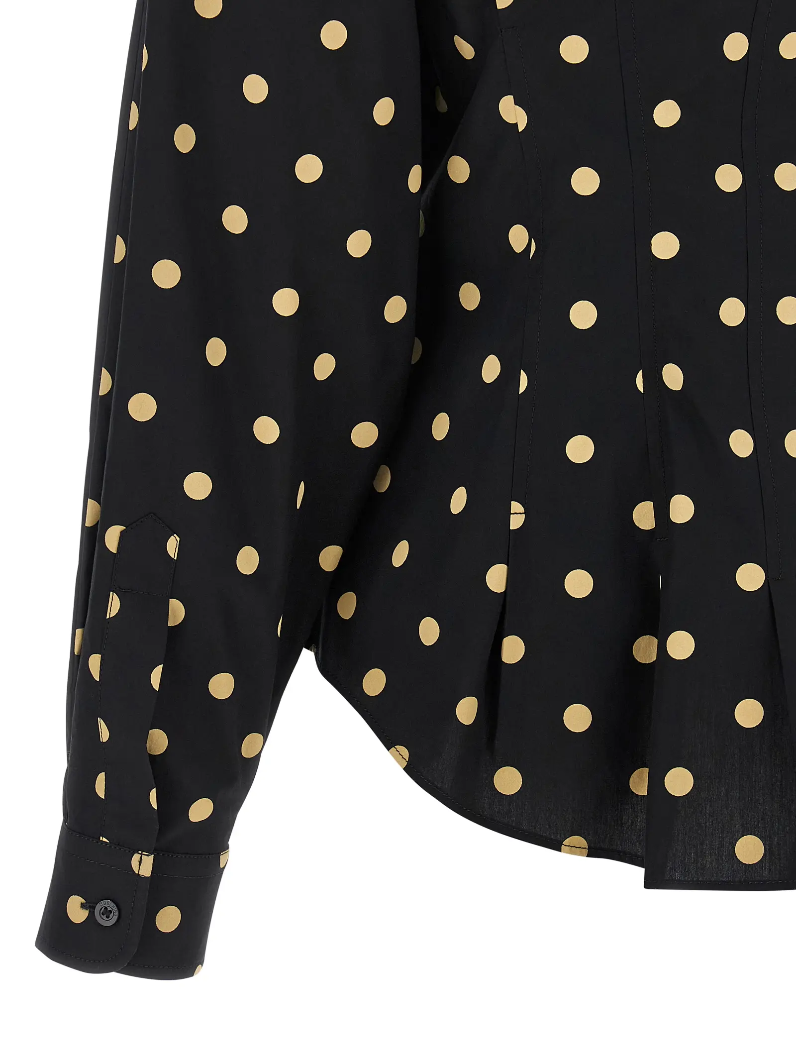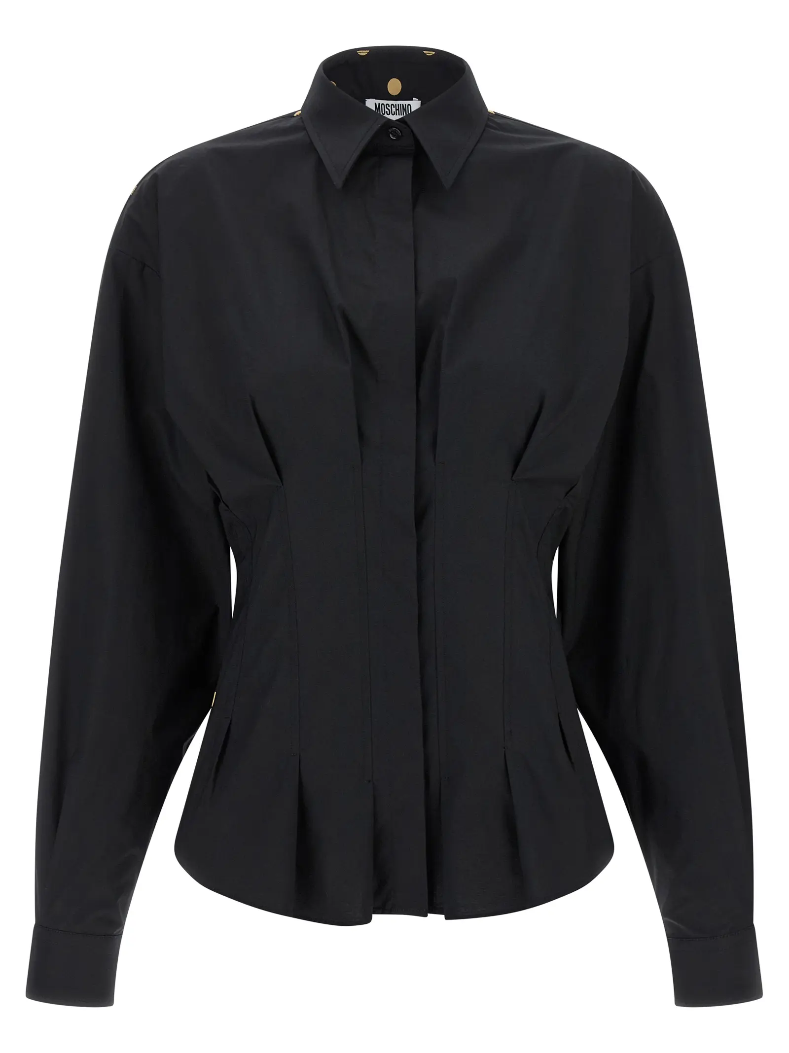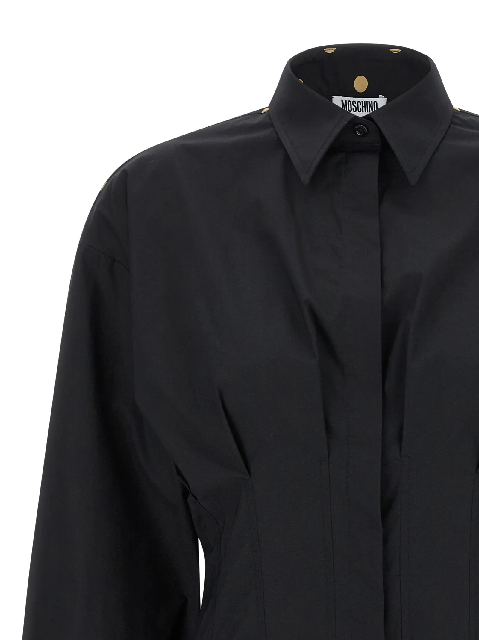 Чорна жіноча сорочка з 100% бавовни від Moschino поєднує в собі вишуканий дизайн із гороховим принтом, коміром та розкльошеною талією з плісе, що підкреслює жіночність і стиль. Довгі рукави з манжетами та застібка на ґудзики забезпечують комфорт і універсальність, створюючи неповторний статусний образ.