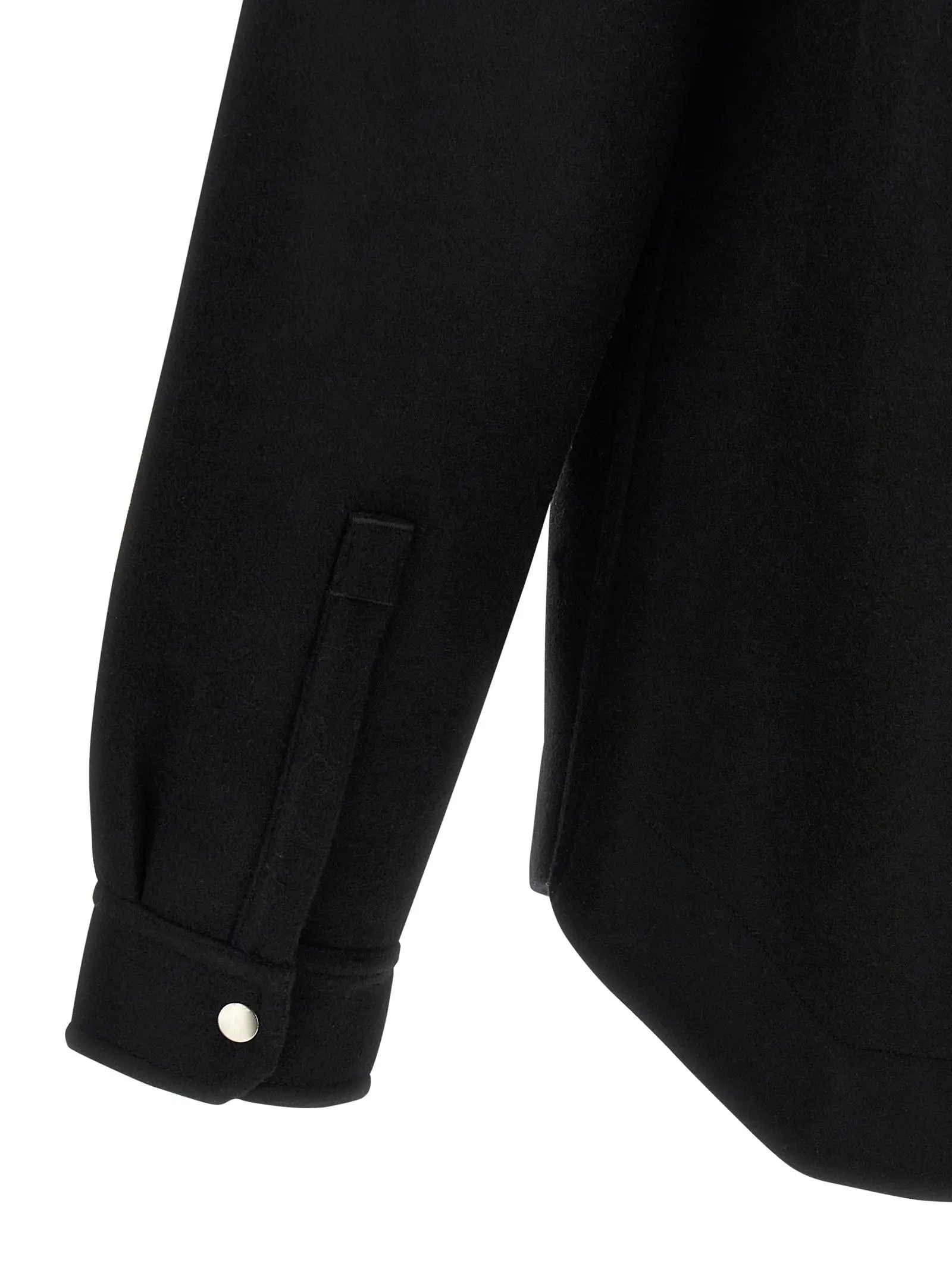 Чорна чоловіча сорочка з колекції Rick Owens виготовлена з високоякісної 100% вовни, поєднує елегантний дизайн з функціональністю: передня застібка на кнопки, практичні кишені, довгі манжети та унікальна деталь у вигляді бавовняного ремінця з заклепками на спинці підкреслюють інноваційність і статусний стиль.