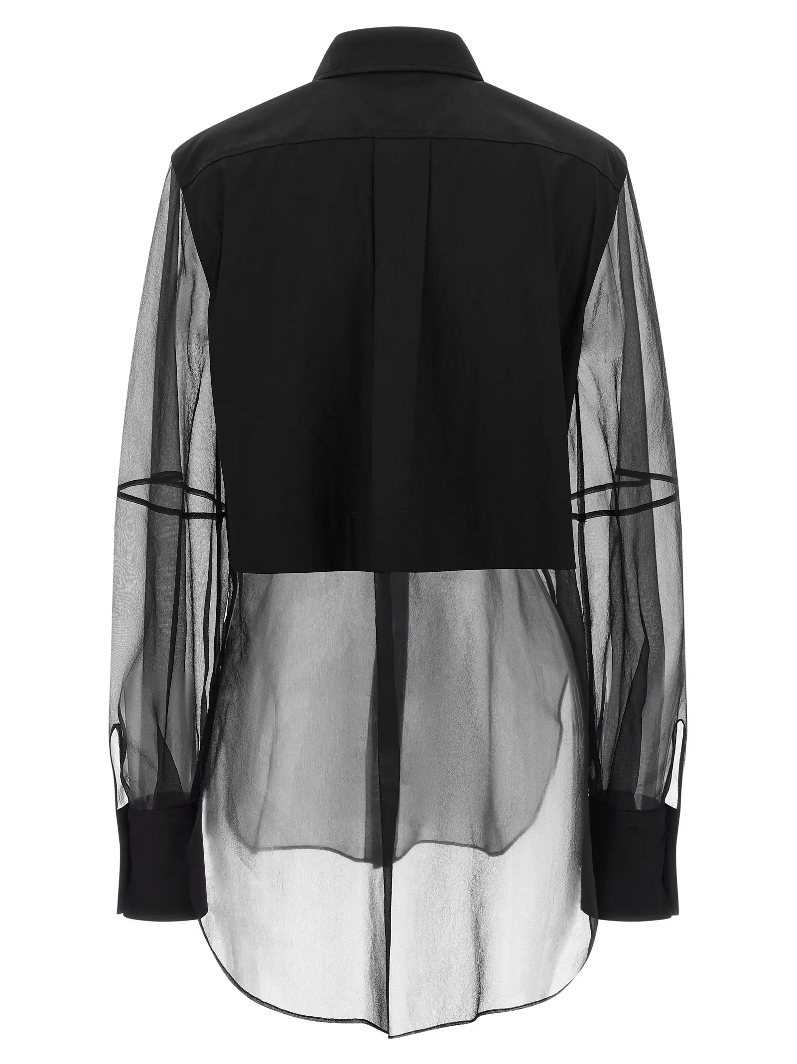 Стильна сорочка з поєднанням бавовняного попліну та напівпрозорого шовку. Передня застібка на приховані ґудзики з декоративною деталлю Monile Shiny Trims. Довгі широкі рукави з манжетами. Склад тканини складається з 72% бавовни, 23% поліаміду та 5% еластану.