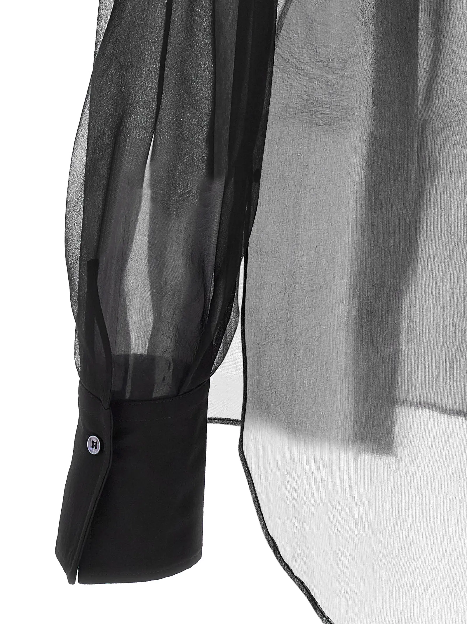 Стильна чорна жіноча сорочка, виконана з поєднання бавовняного попліну та напівпрозорого шовку, що забезпечує неперевершену легкість і комфорт. Елегантний дизайн з прихованою застібкою та декоративною деталлю надає виробу унікального шарму, а широкі довгі рукави з манжетами підкреслюють вишуканий силует. Сорочка поєднує інноваційність матеріалів і бездоганну якість, створюючи образ, який випромінює статус і стиль у будь-якій ситуації.