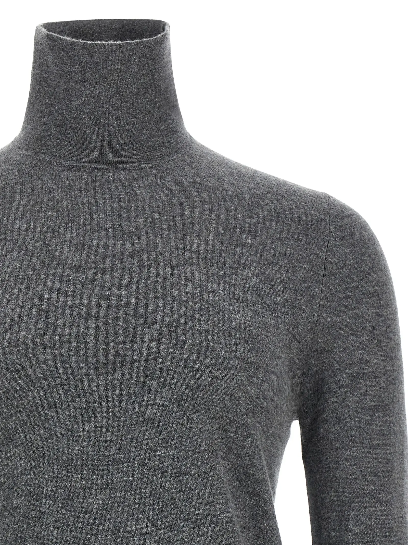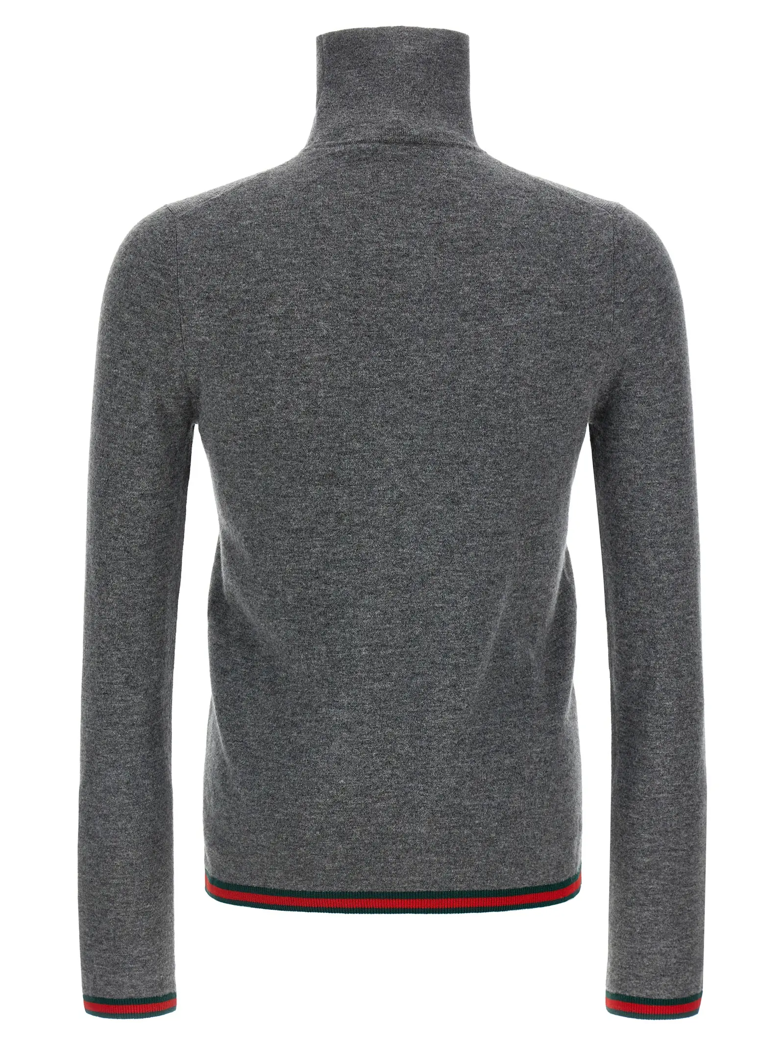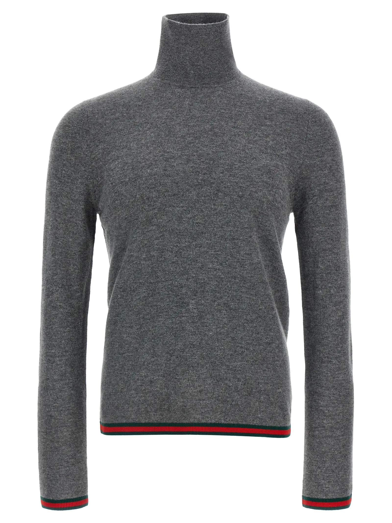 Виготовлений зі 100% кашеміру. Має високу горловину. Оснащений довгими рукавами. Внизу прикрашений стрічкою з тканого матеріалу.