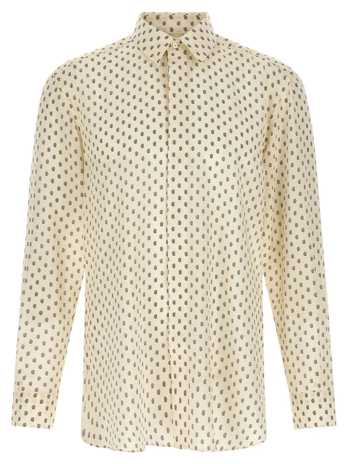Текстурний шовковий крепдешин із суцільним принтом пейслі. Склад 100% натуральний шовк. Потайна планка на ґудзиках та довгі рукави з манжетами.