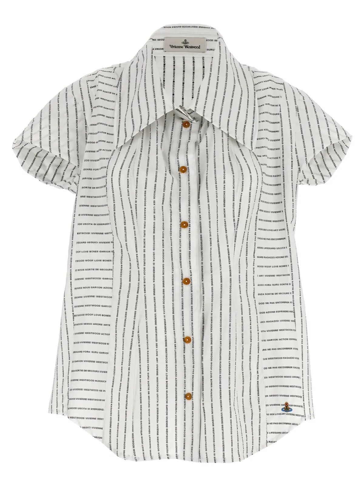 Чорно-біла жіноча сорочка Twisted Bagatelle від Vivienne Westwood. Бавовняна модель з повторювальним логотипом по всій поверхні. Вона має застібку на ґудзики, максі-комір та короткі закручені манжети. Виготовлена зі 100% бавовни.