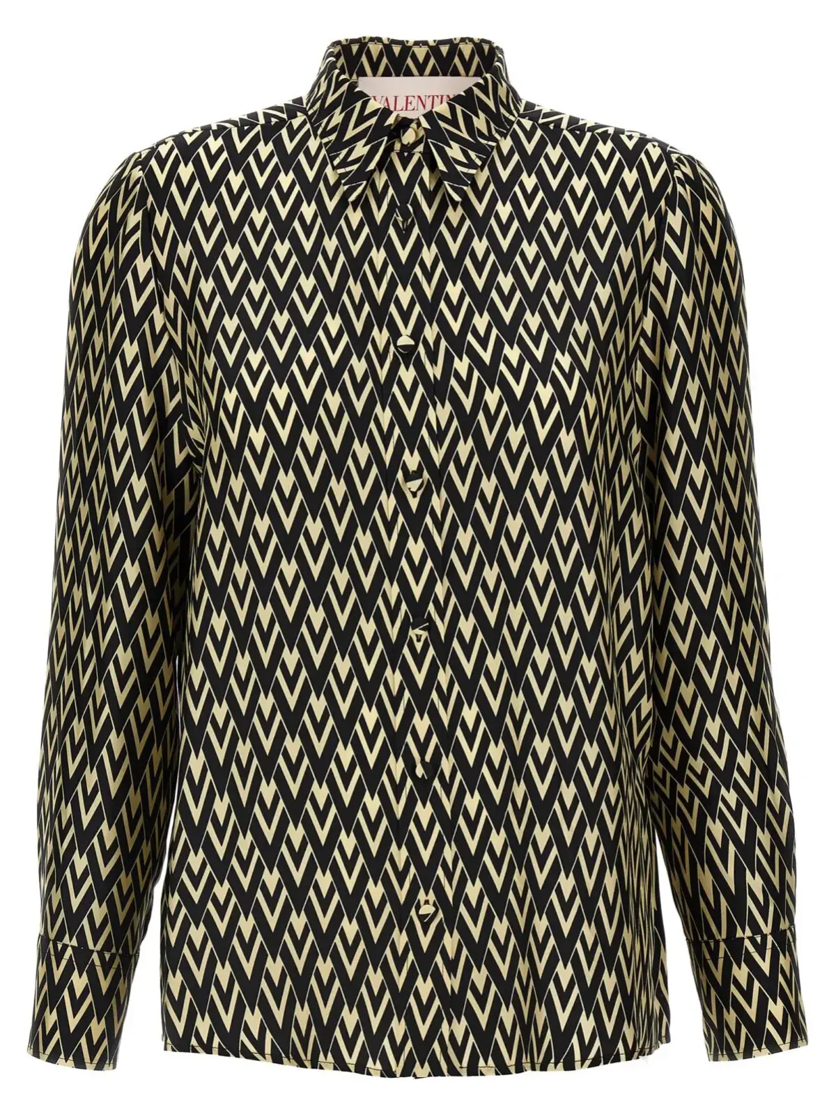 Сорочка Valentino Garavani Toute la V вражає елегантністю завдяки унікальному дизайну з чорно-білим принтом, що відображає фірмовий стиль бренду. Виконана з 100% шовку, вона дарує незрівнянний комфорт і розкіш. Довгі рукава з манжетами підкреслюють жіночність, а гудзикова застібка додає практичності. Ця сорочка стане ідеальним доповненням до будь-якого гардеробу, надаючи статусу та стилю в кожному образі.
