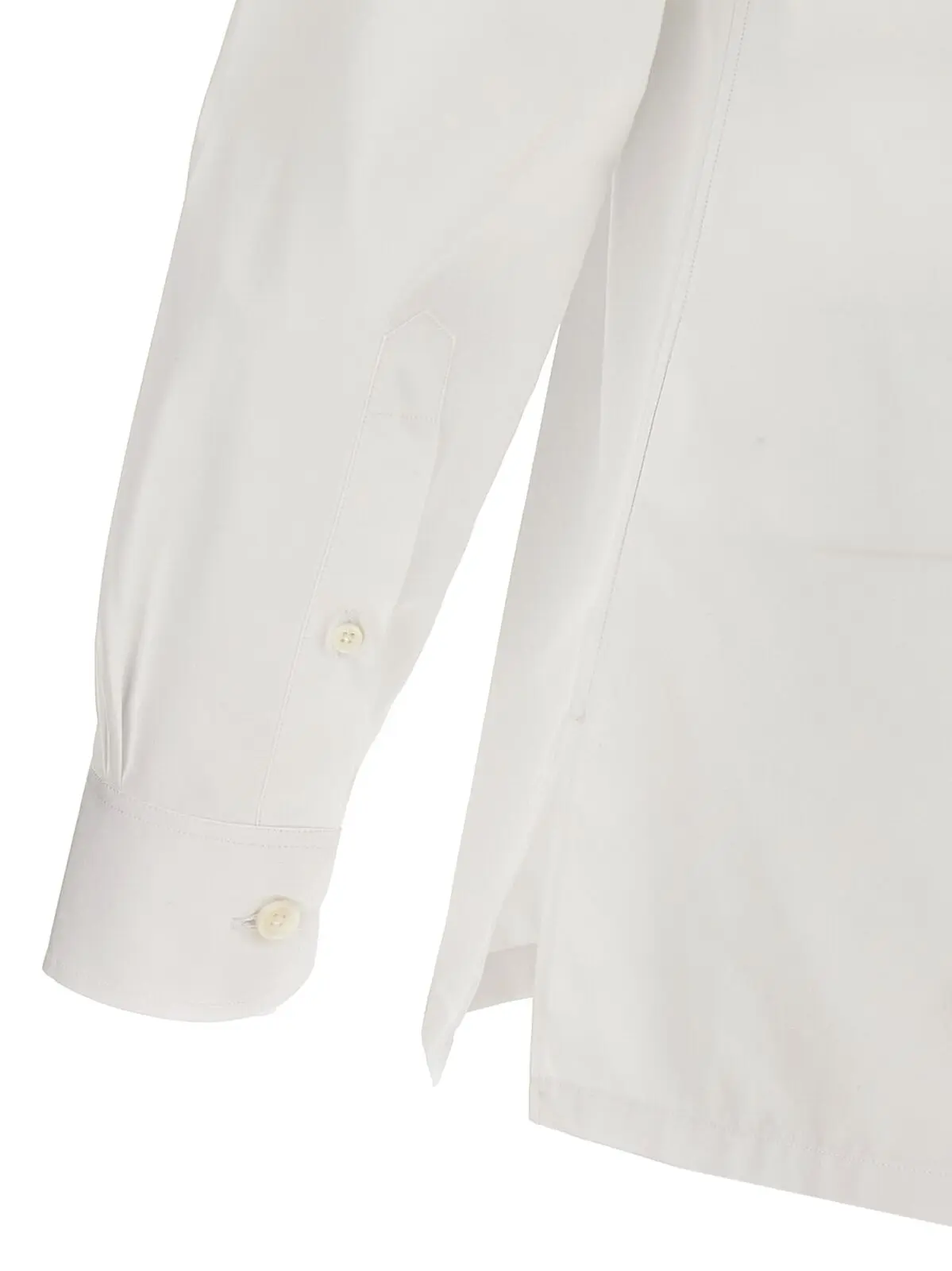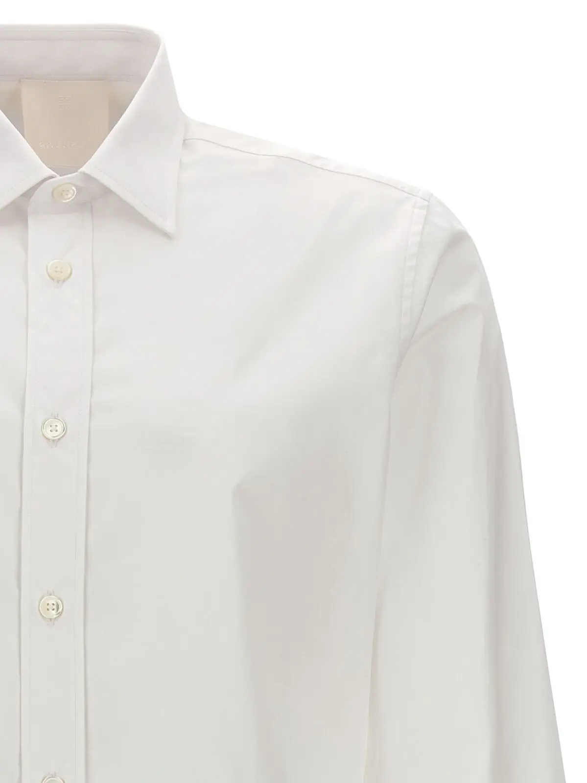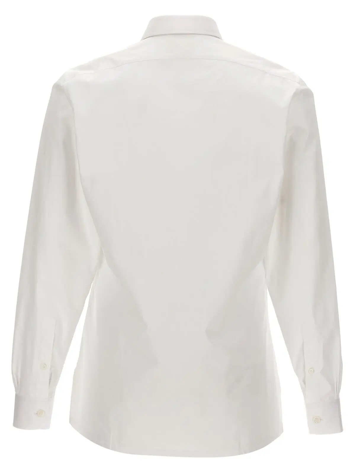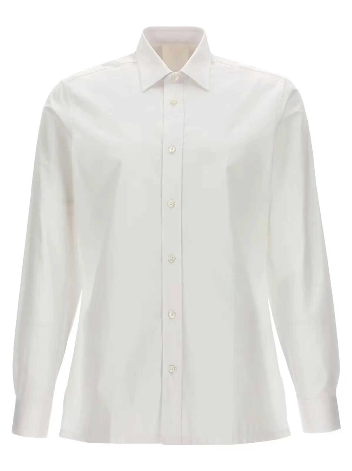 Елегантна біла чоловіча сорочка Givenchy, виконана з високоякісної бавовни, прикрашена тон-у-тон вишитим логотипом марки. Модель має довгі рукави з манжетами та застібається на ґудзики, що забезпечує класичний та витончений вигляд.