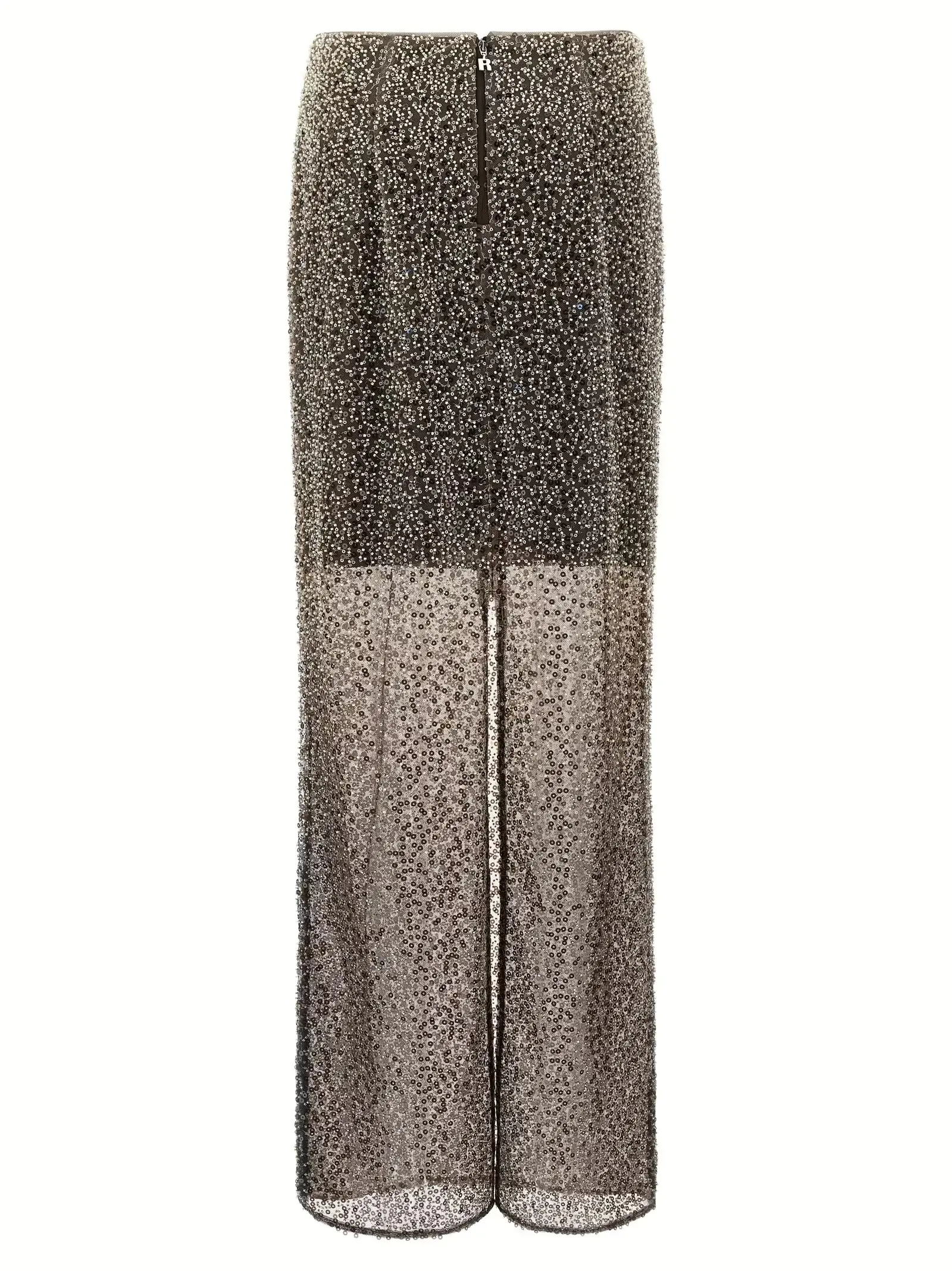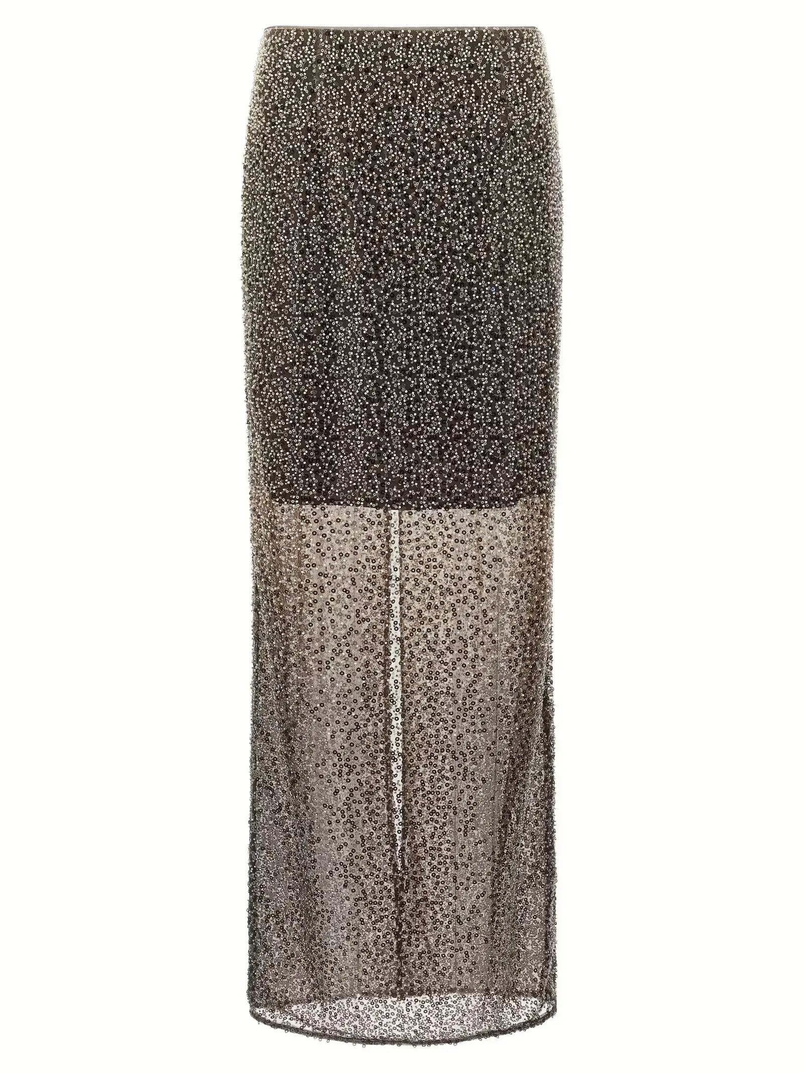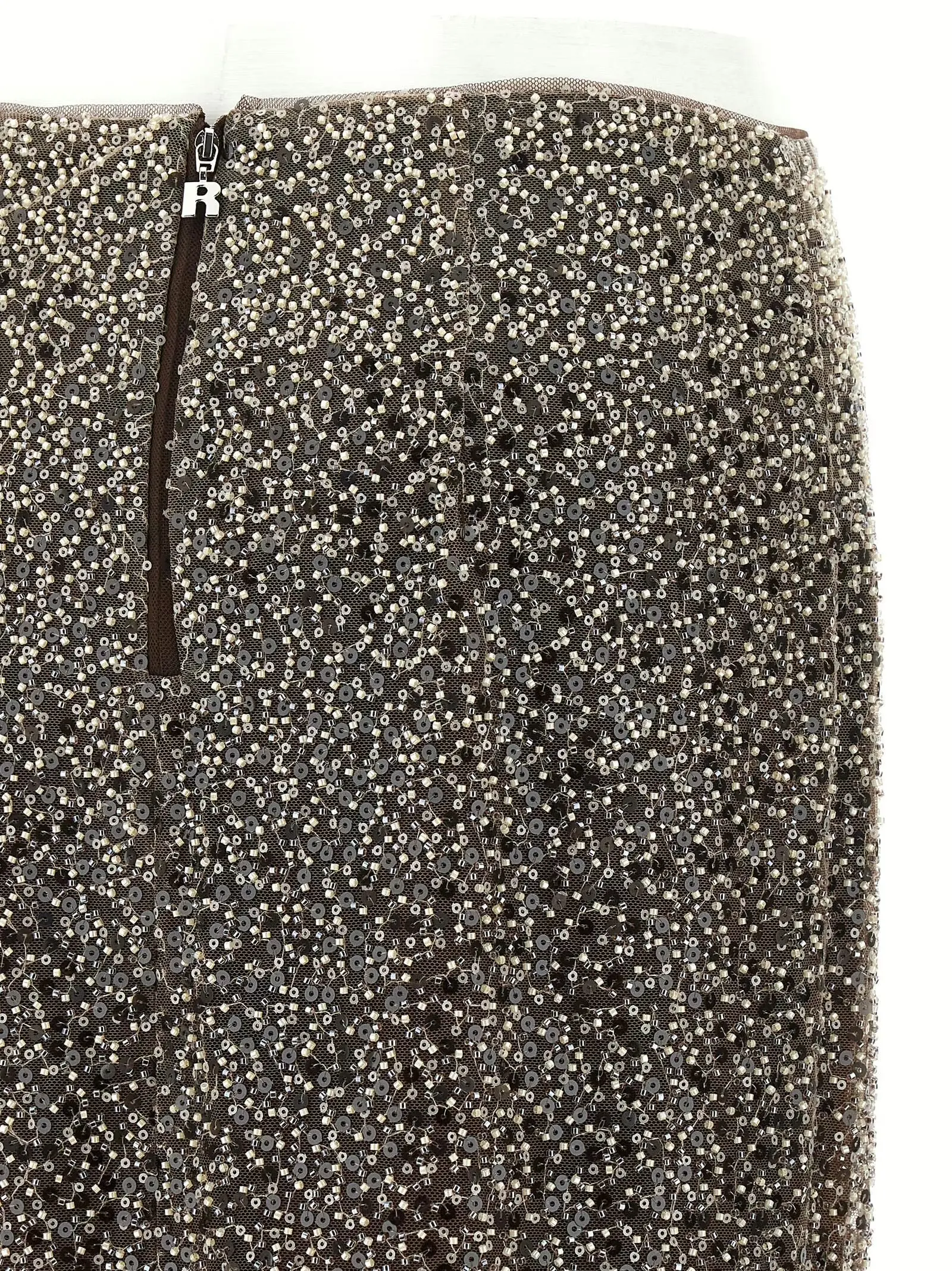 Ця довга коричнева спідниця з високою талією виготовлена з напівпрозорої тканини з вишуканим оздобленням паєтками та бісером, що створює неповторний блиск і текстуру. Модель поєднує інноваційність та екологічність завдяки використанню переробленого поліестеру, забезпечуючи комфорт і стиль. Ідеальний вибір для створення витонченого образу з акцентом на елегантність і статус.