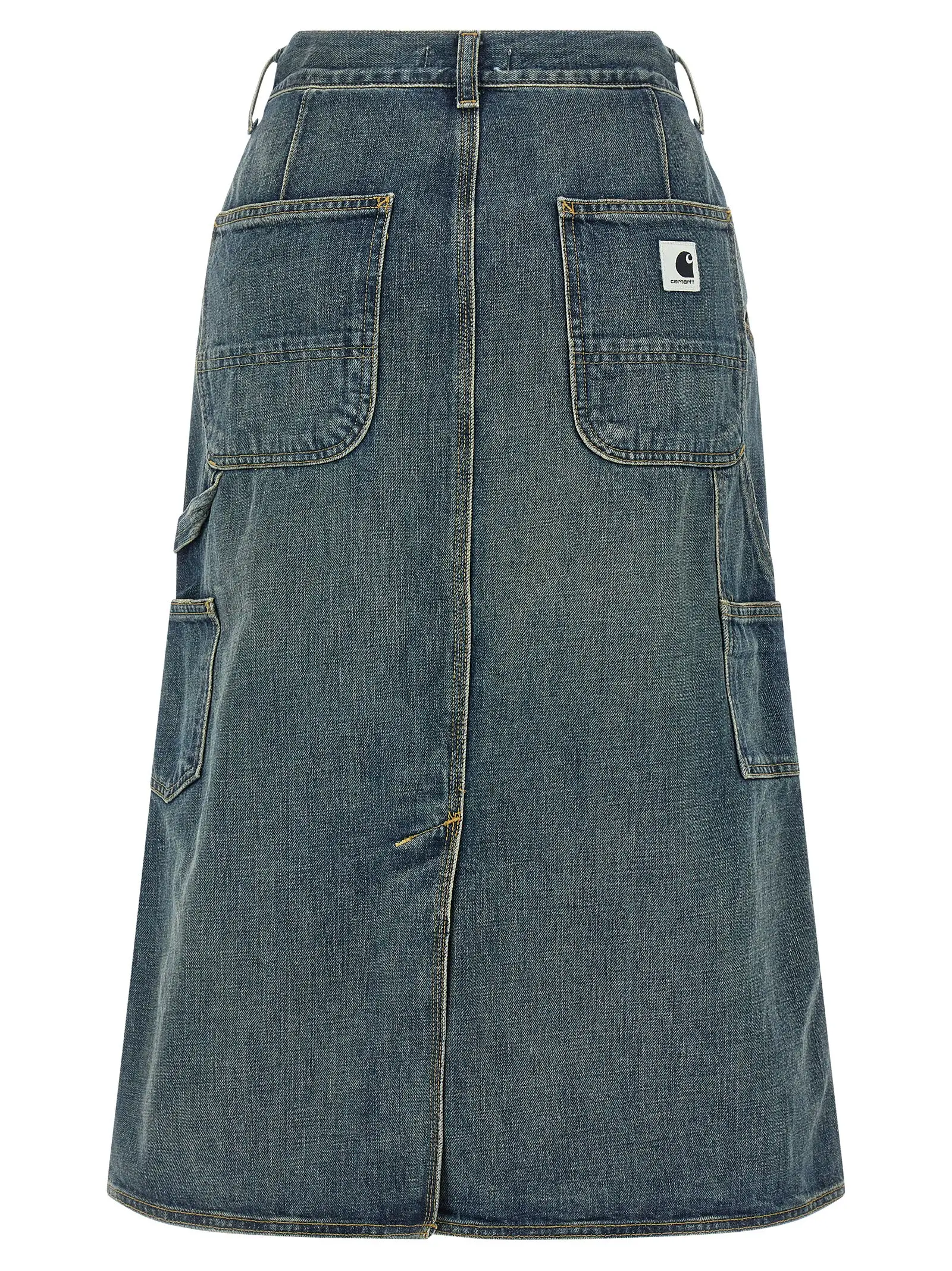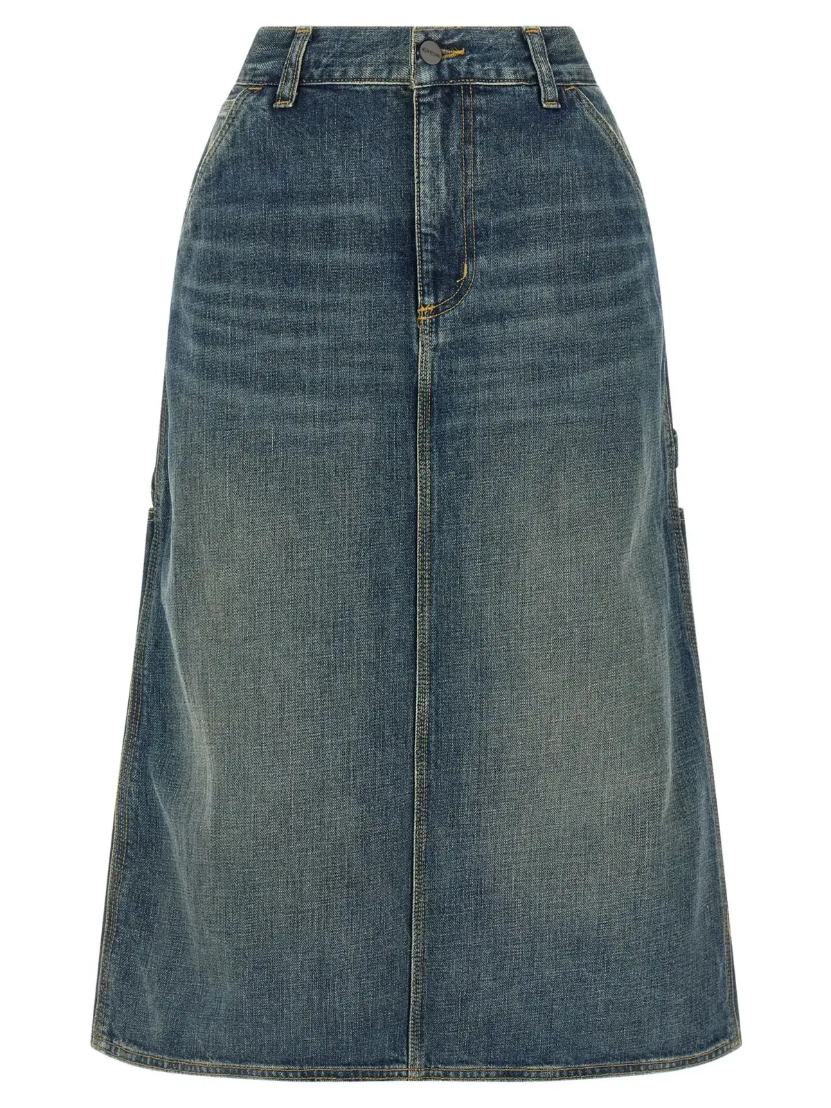 Спідниця з деніму середньої довжини виготовлена з міцної камано-вареної бавовни високої якості, має елегантний трохи розкльошений силует, контрастні шви та практичні п’ять кишень. Дизайн поєднує сучасність і класичну універсальність, підкреслюючи статус і витончений стиль власниці.