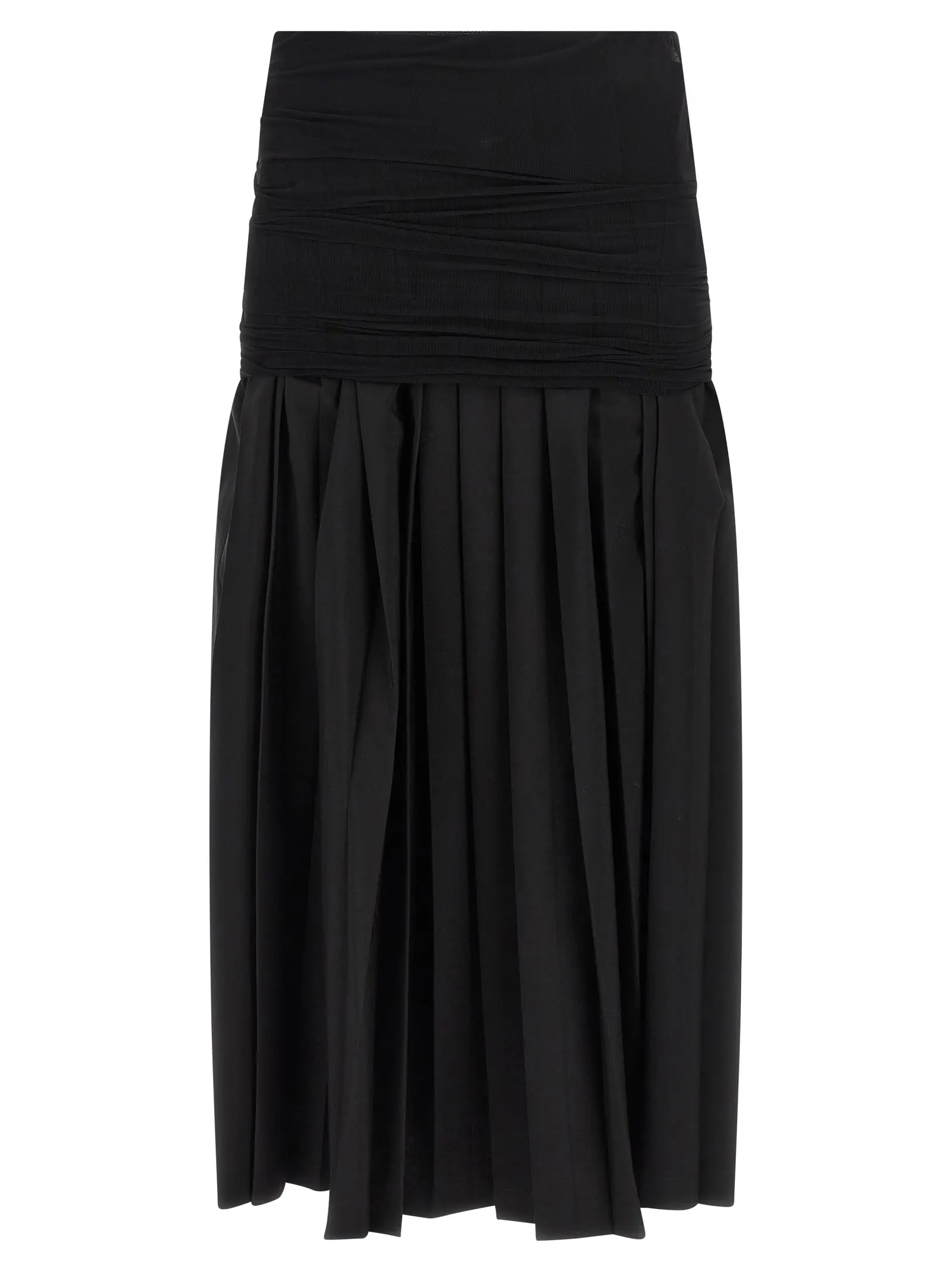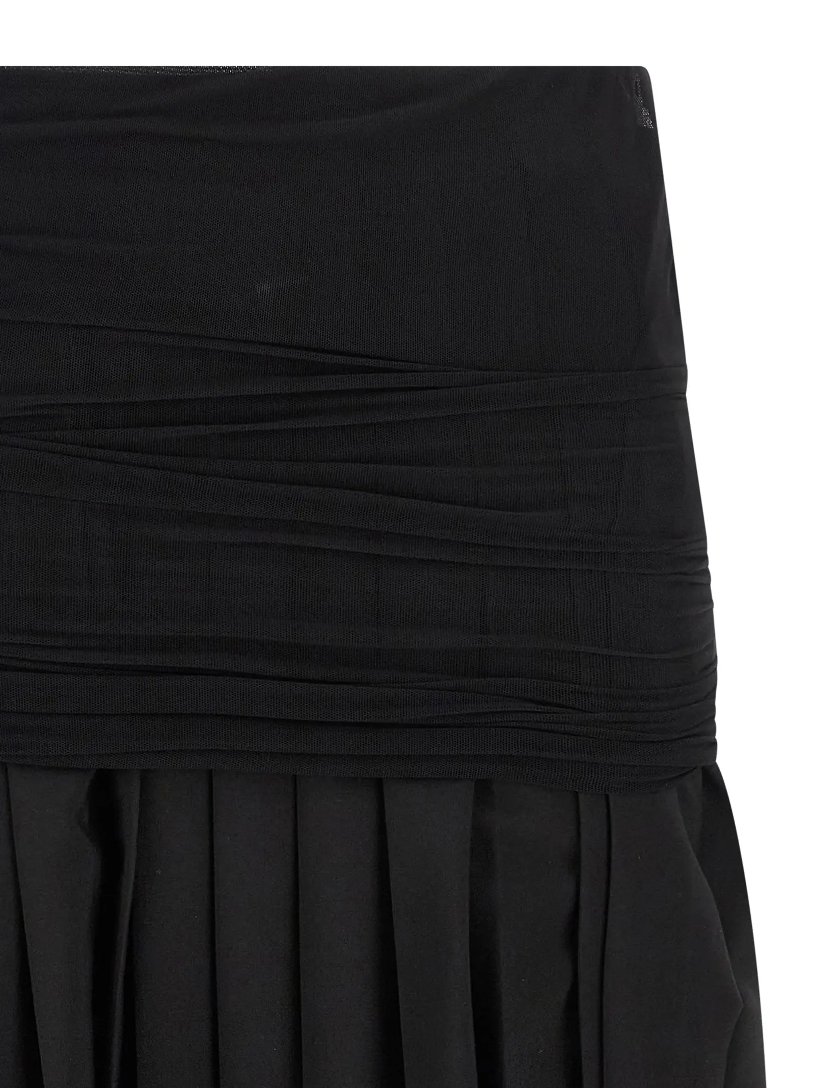 Чорна міді спідниця з подвійним шаром, виготовлена з високоякісної вовняної суміші з поліестером, поєднує елегантний плісировний дизайн із розкльошеним силуетом. Вставка з тонкого тюлю додає витонченості та дозволяє регулювати образ, забезпечуючи універсальність і неперевершений стиль для впевнених у собі жінок.