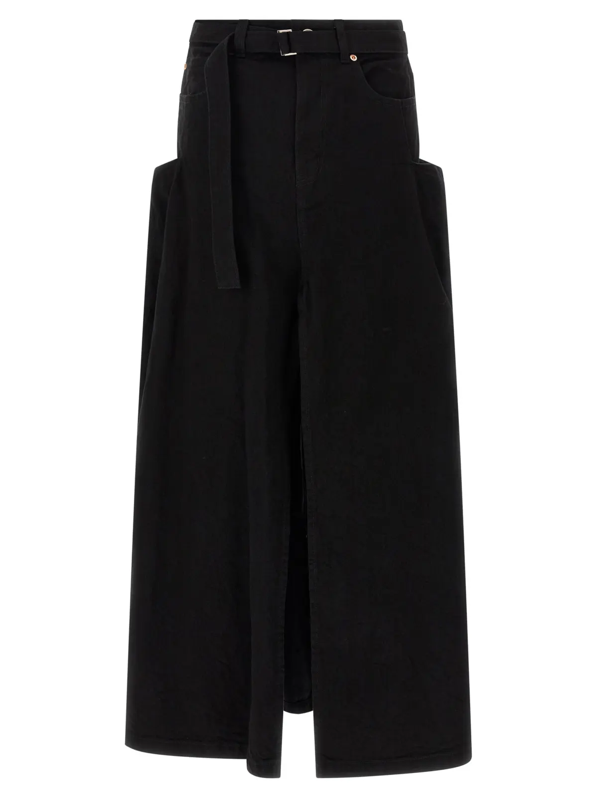 Довга чорна джинсова спідниця з інноваційним дизайном у вигляді брюк з ефектом обману зору, виготовлена з 100% натуральної бавовни з фарбуванням у готовому виробі. Вишукані деталі — передня блискавка, ґудзик, практичні кишені, широкі розрізи спереду та ззаду, а також знімний пояс, що підкреслюють універсальність і стиль. Цей витвір моди поєднує бездоганну якість із статусом, даруючи неповторну елегантність і сучасність кожному образу.