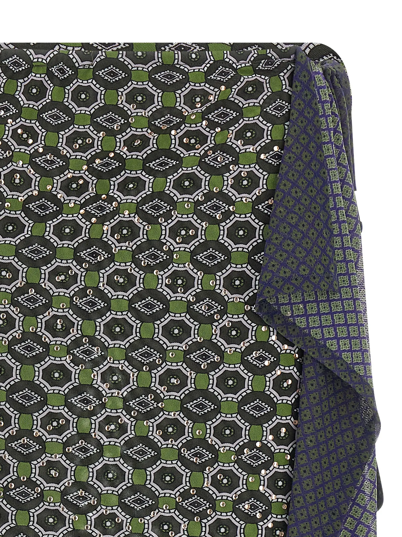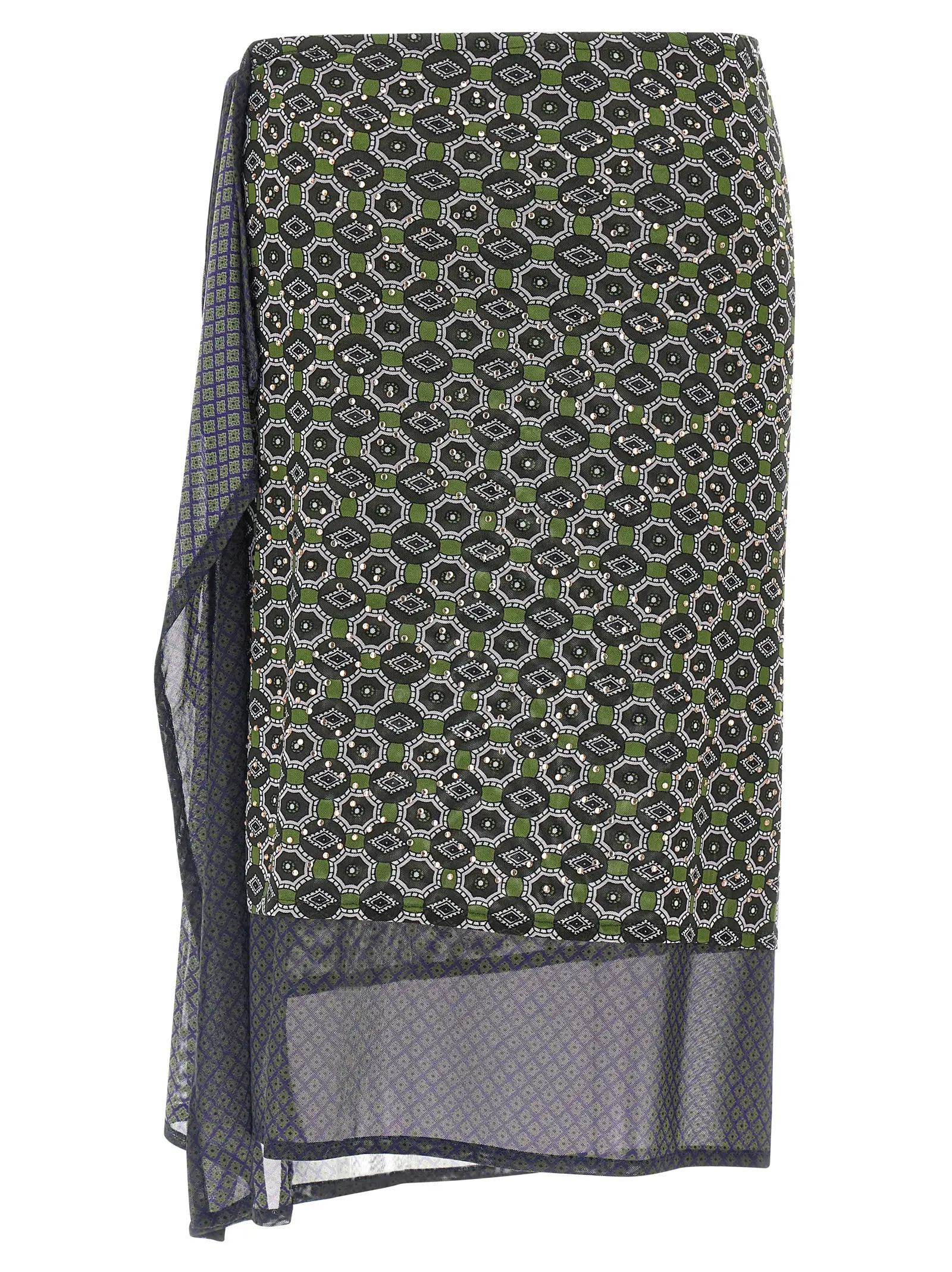 Елегантна міді спідниця з двома накладними шарами з напівпрозорого тюлю з візерунком, прикрашена вишуканими кристалевими аплікаціями, що підкреслюють інноваційність дизайну. Виготовлена з високоякісного поліаміду та еластану, з боковими зав’язками для ідеальної посадки, ця модель поєднує стиль, комфорт і статус у будь-якому образі.
