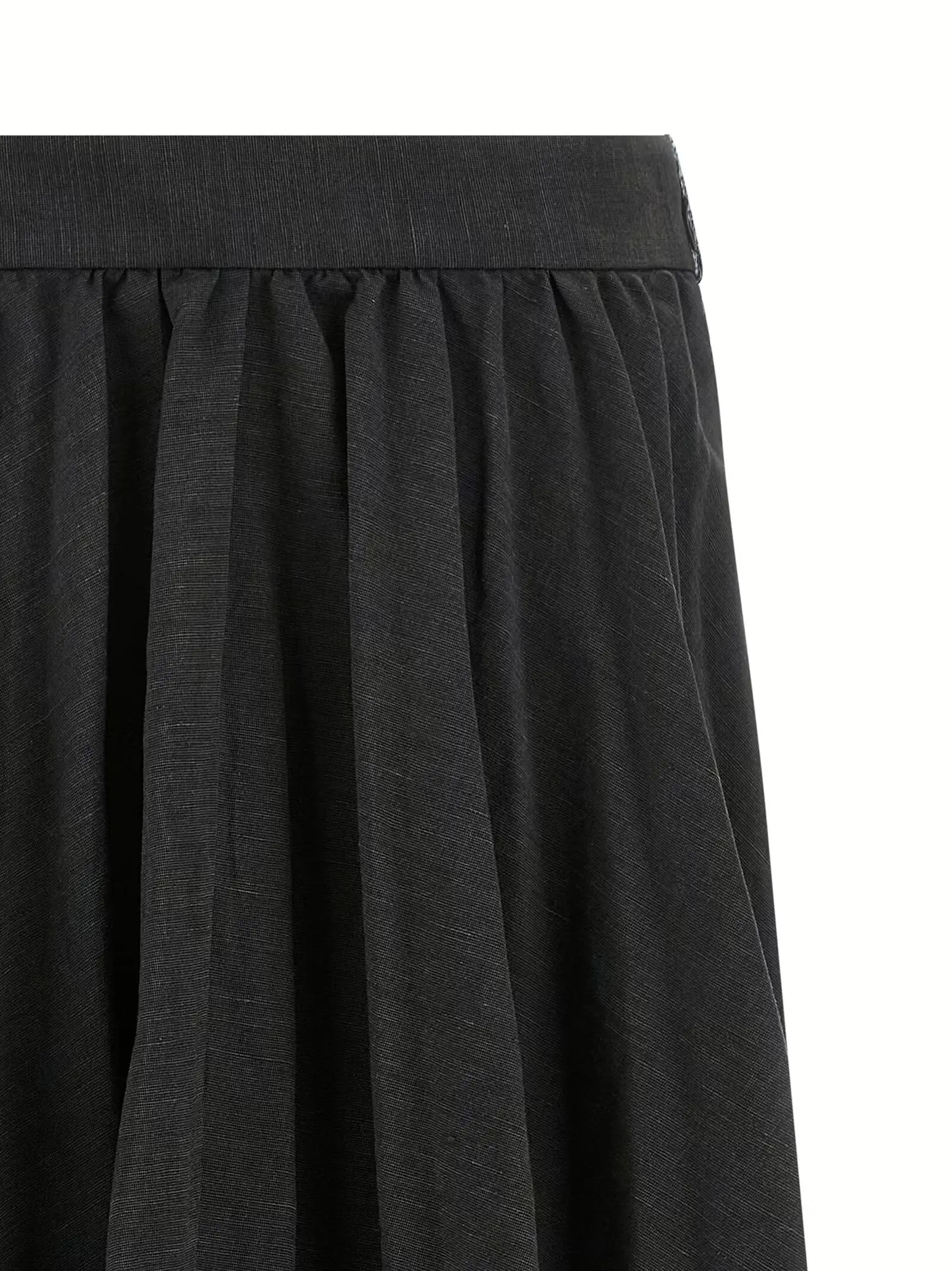 Ця преміальна чорна спідниця міді поєднує натуральний льон та бавовну, створюючи витончену текстуру з ефектом stonewashed плісирування. Елегантний дизайн з боковою застібкою, функціональними кишенями та вишуканою деталлю ззаду підкреслює статус і універсальність, гармонійно доповнюючи будь-який стиль.