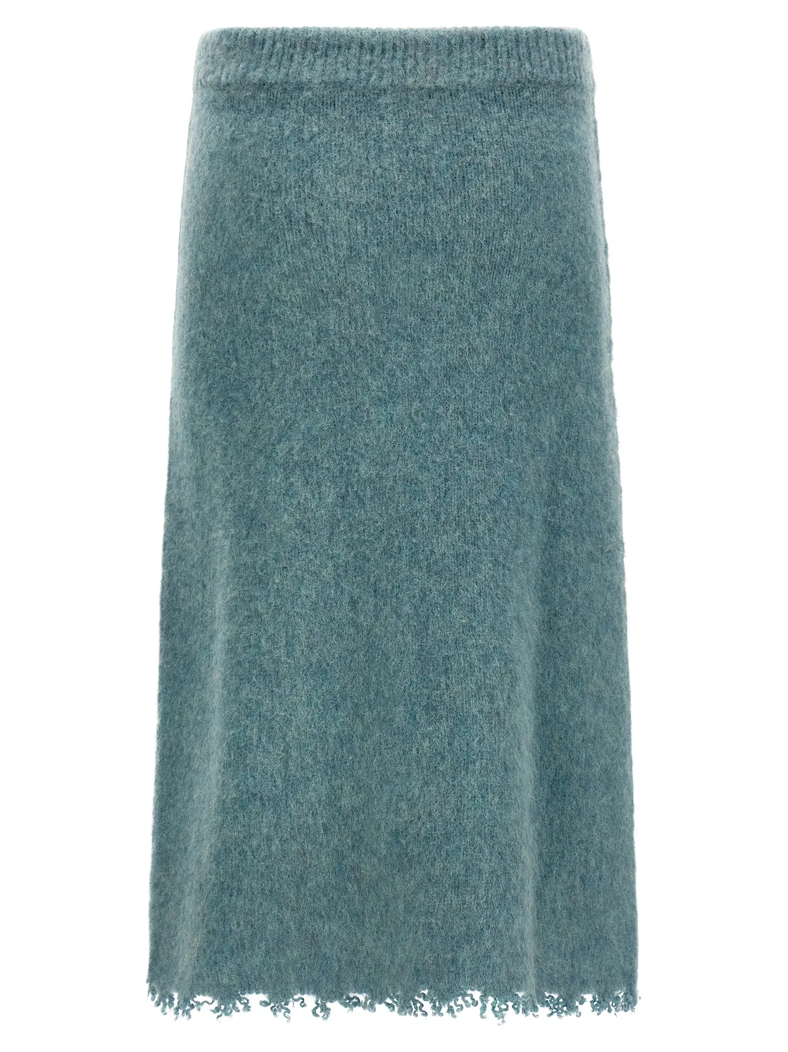 Ця спідниця міді з м’якої вовни шетландського сорту в блакитному відтінку поєднує в собі бездоганну якість та інноваційний дизайн з елегантним високим еластичним поясом і натуральним необробленим низом, що підкреслює універсальний стиль і статус, створюючи витончений образ для впевнених у собі жінок.
