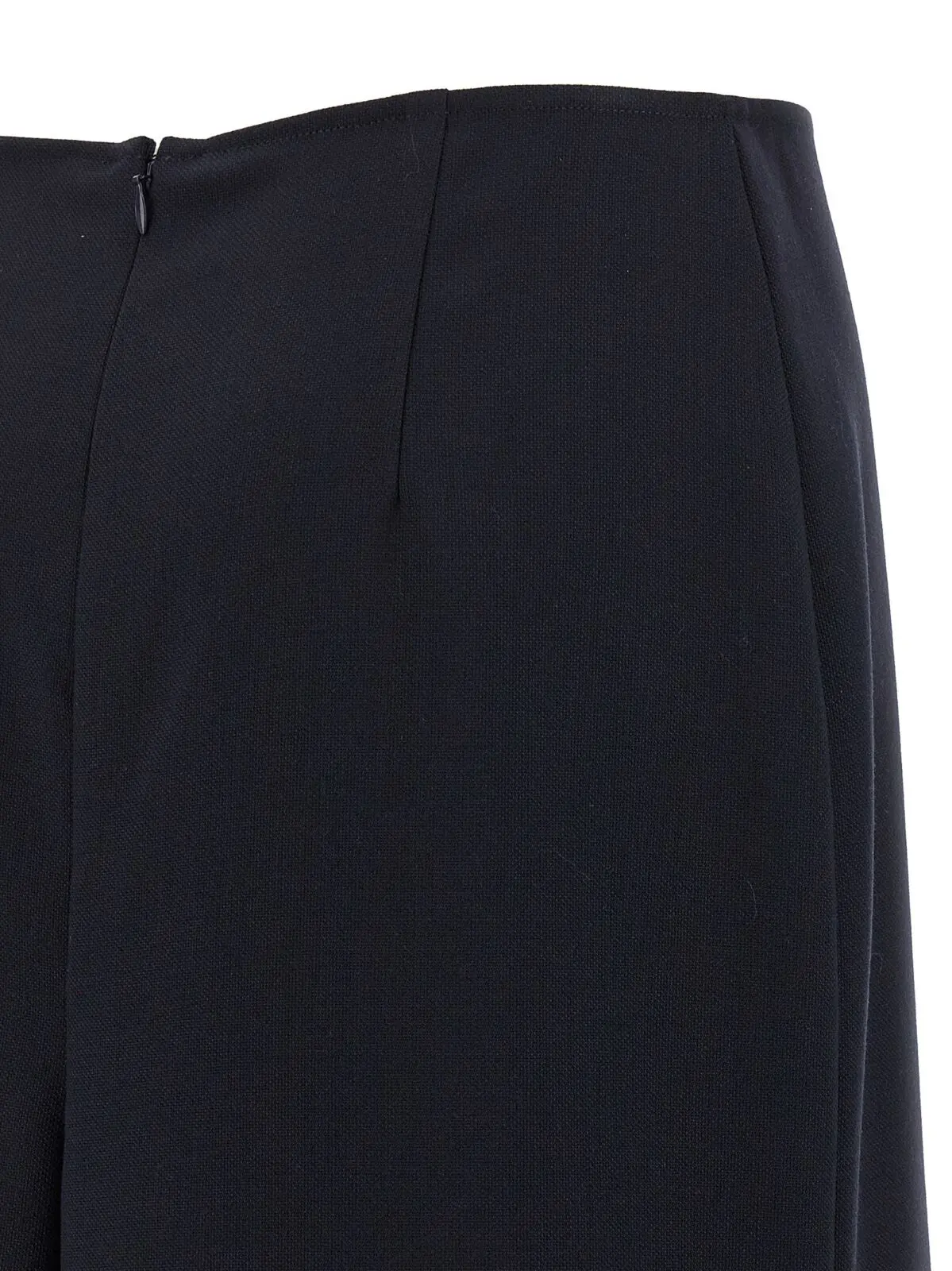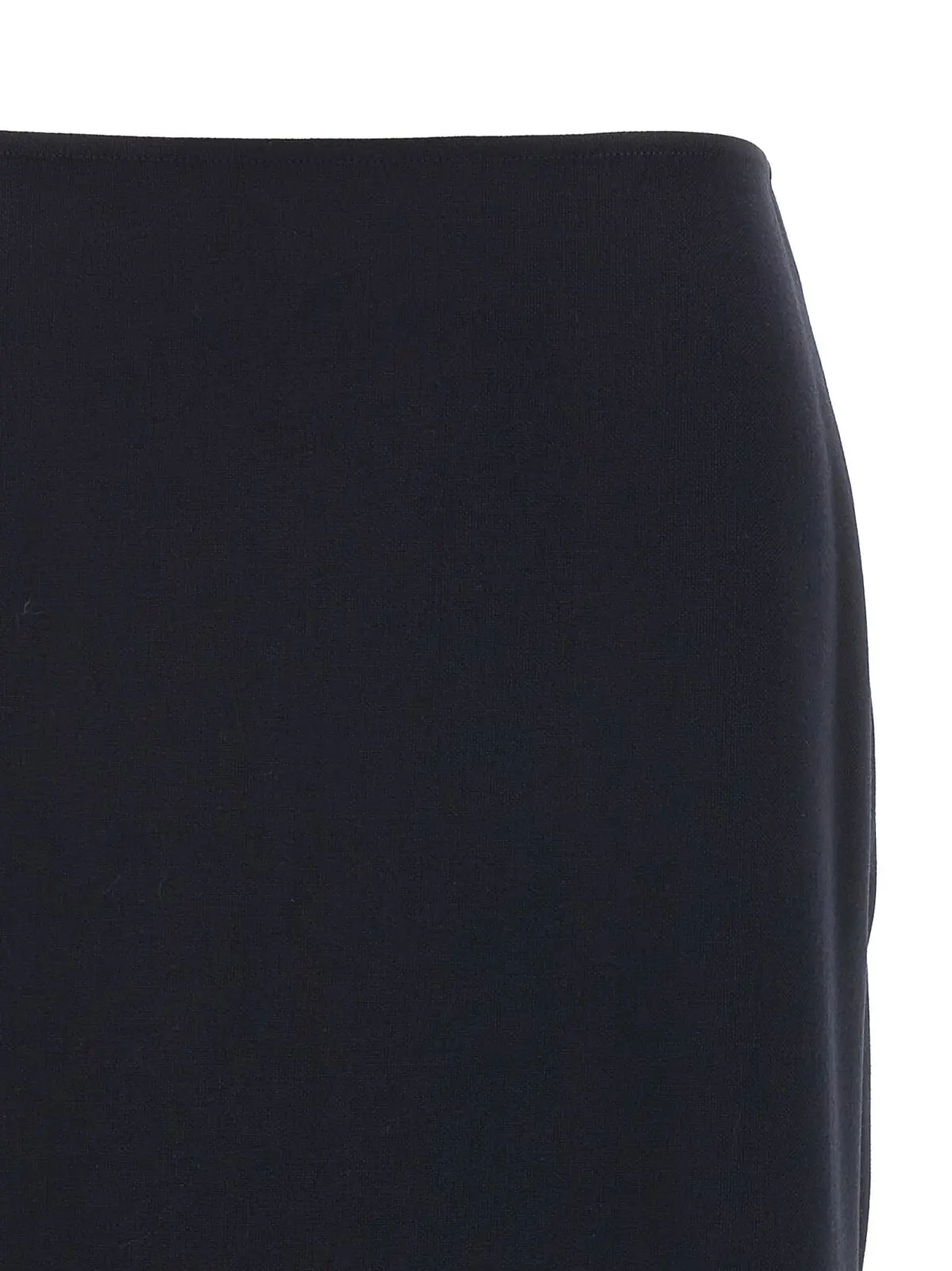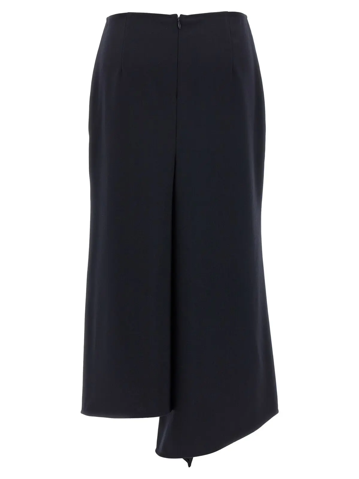 Елегантна синя спідниця з вовняного крепу зі складом 55% поліестеру, 43% натуральної вовни та 2% еластану поєднує інноваційність матеріалів і витончену А-силуетну форму з асиметричним подолом та легкою шлейфою, підкреслюючи статус і неповторний стиль, забезпечуючи комфорт і витончену функціональність для будь-яких подій.