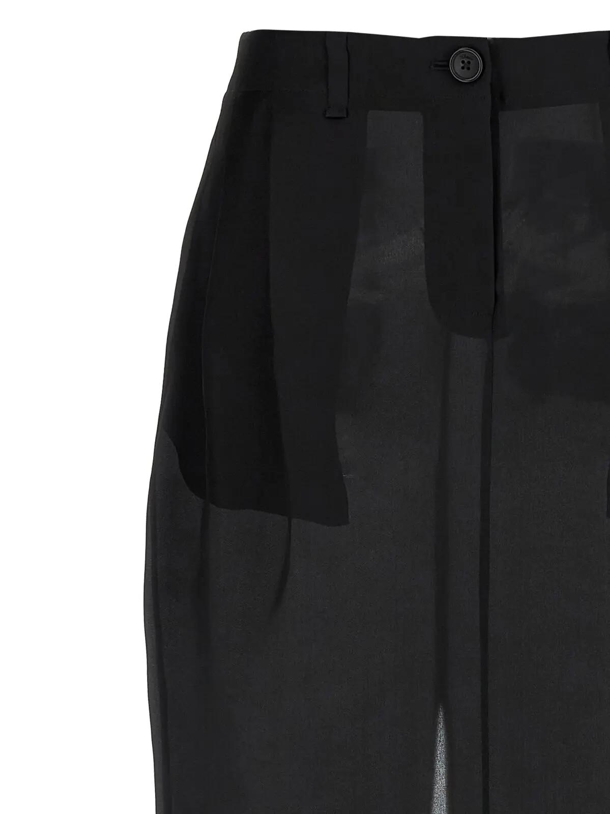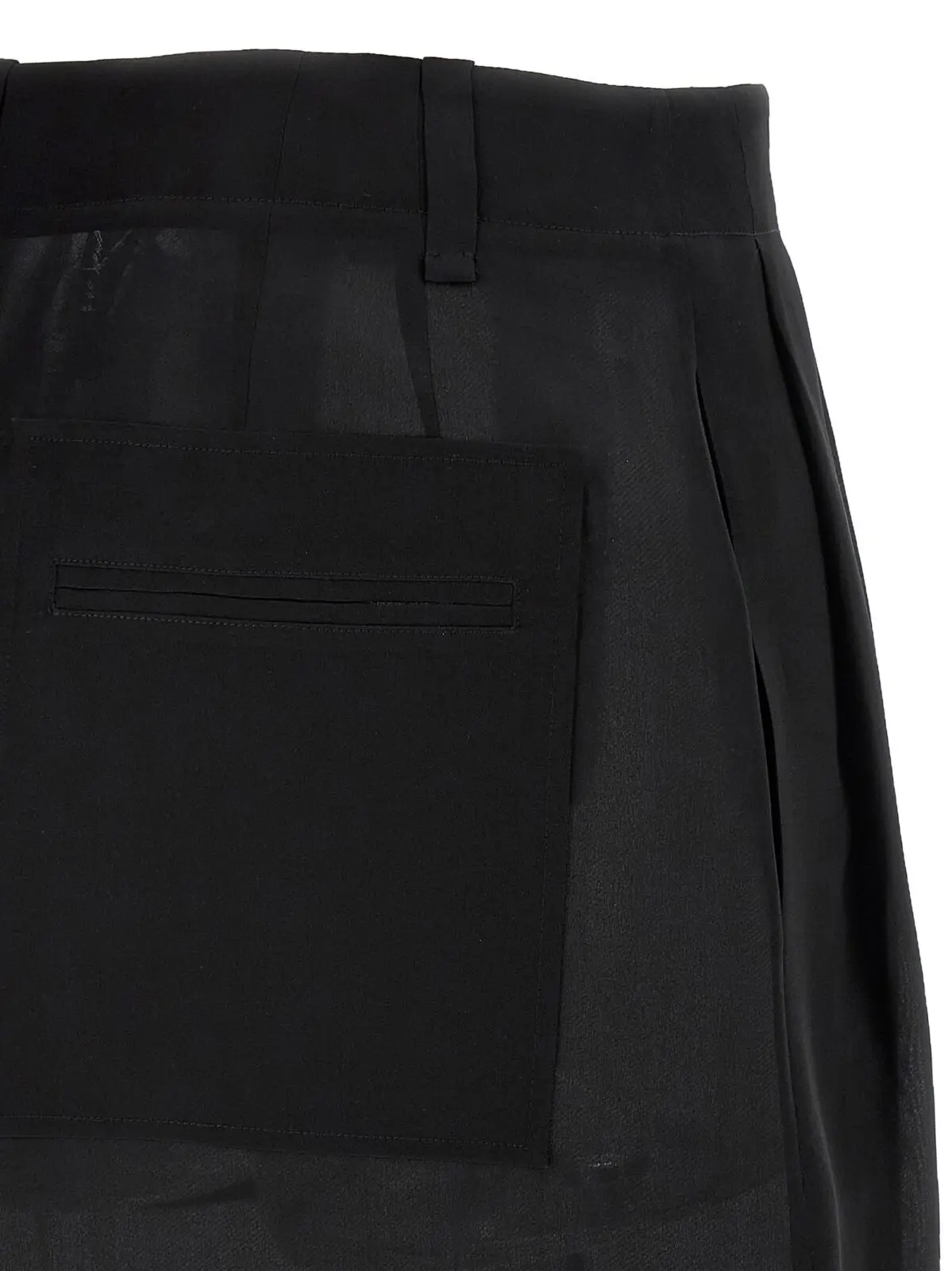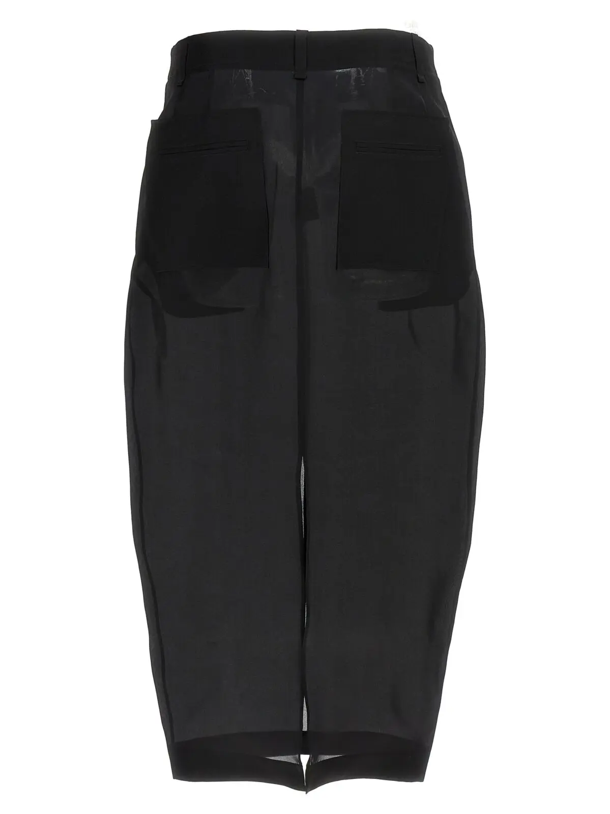 Ця чорна спідниця міді виготовлена з напівпрозорої натуральної шовкової органзи, що дарує неперевершену легкість і вишуканість. Витончені складки спереду, практичні кишені, застібка на блискавку та ґудзик, а також розріз ззаду підкреслюють інноваційний дизайн і універсальність, створюючи образ бездоганного стилю та статусу.