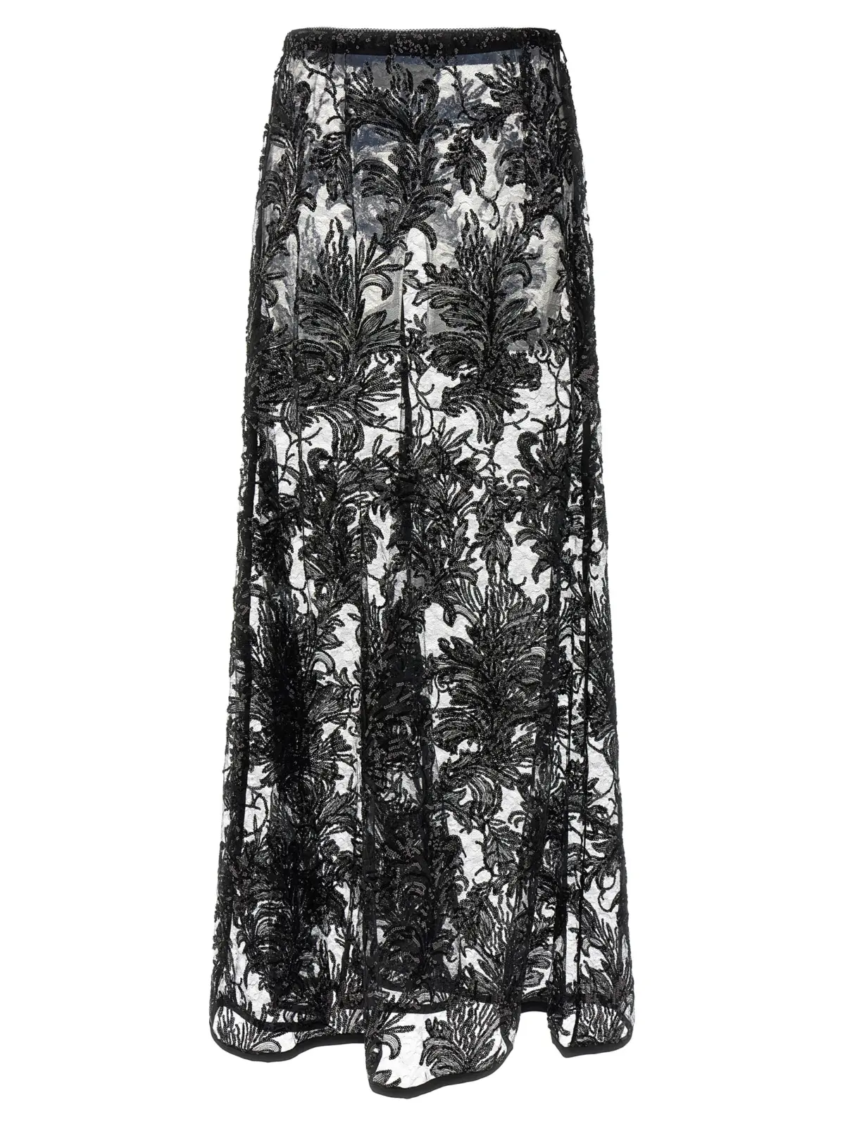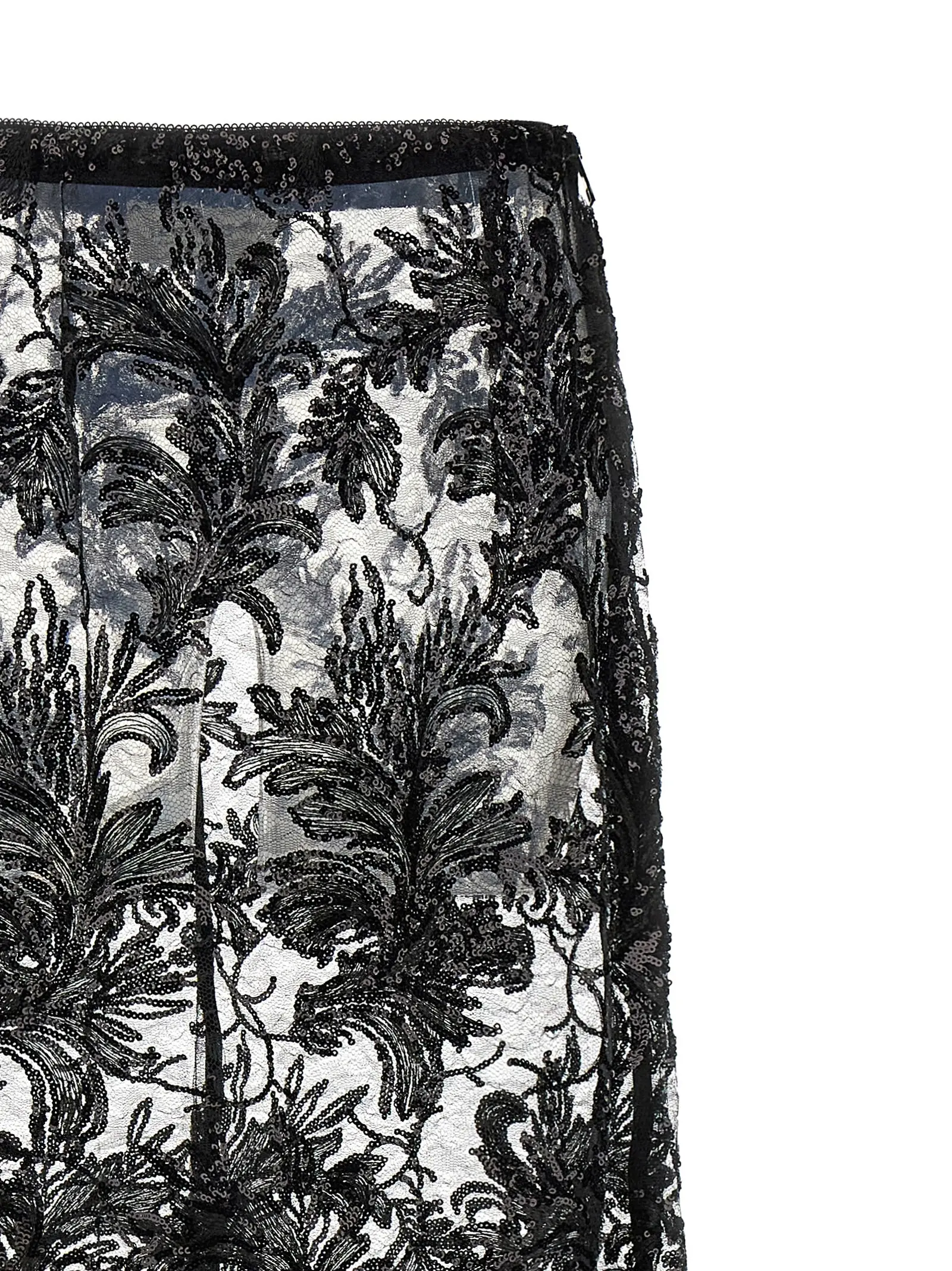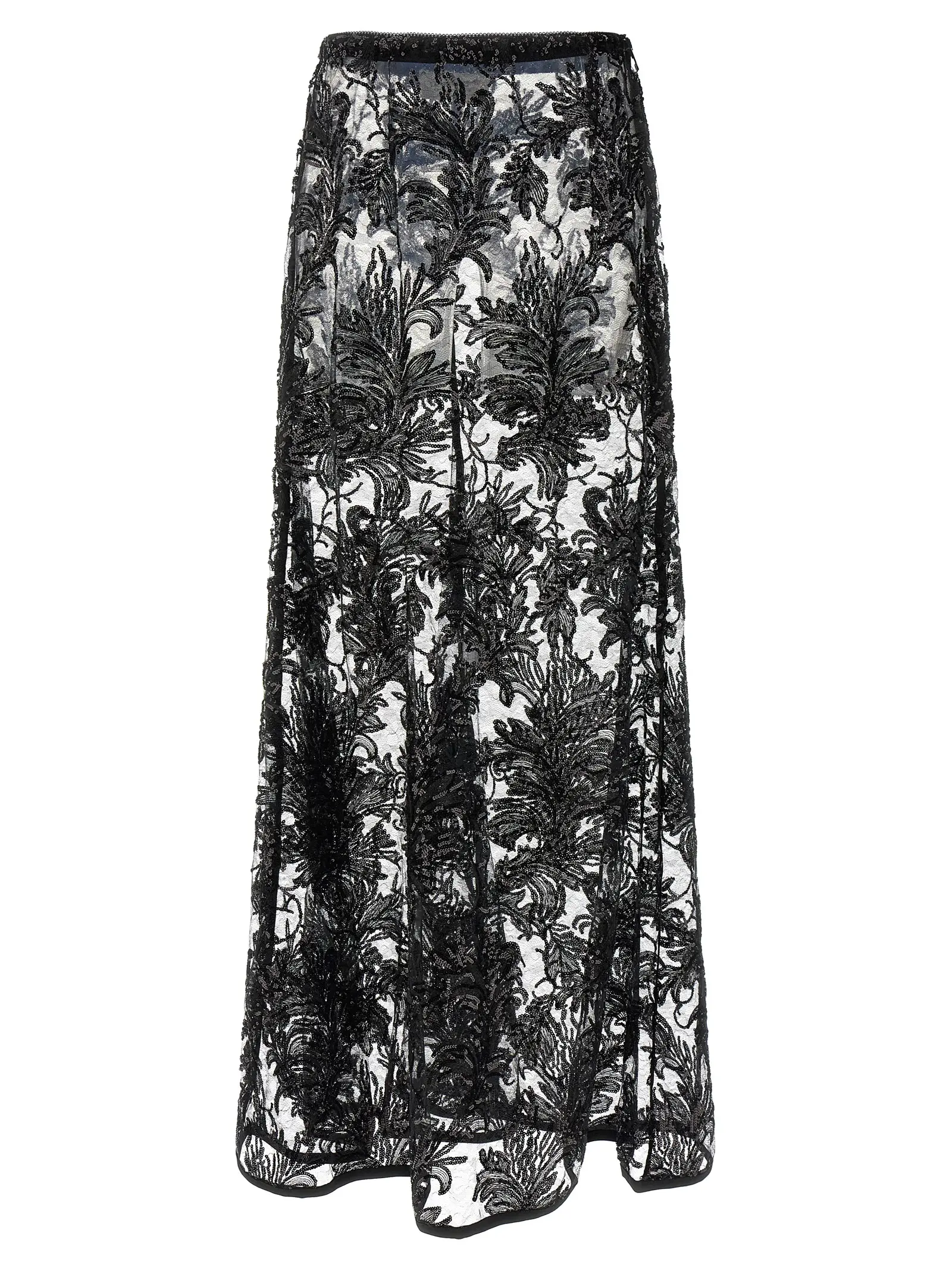 Вишукана максі спідниця чорного кольору з напівпрозорого мереживного матеріалу, оздоблена вишуканою вишивкою з паєток, що додає неповторного блиску. Розширений низ створює граціозний силует, а бокова застібка на блискавку з гачком забезпечує ідеальну посадку. Цей витончений виріб втілює поєднання розкоші, інноваційного дизайну та універсальної елегантності, підкреслюючи статус і бездоганний стиль власниці.