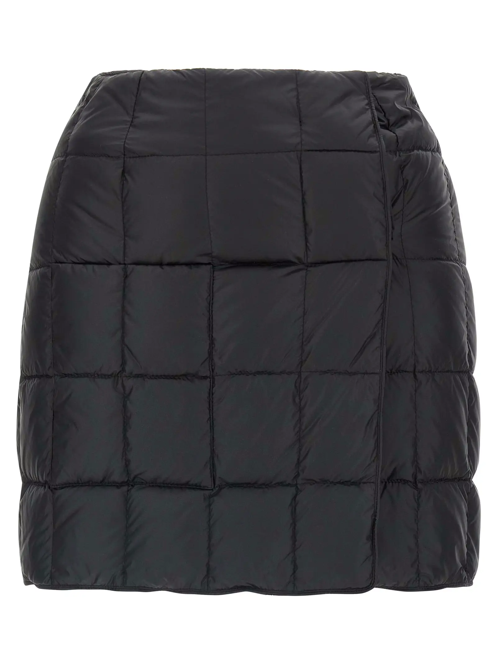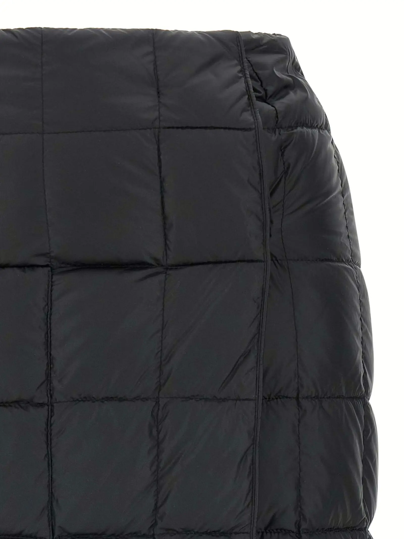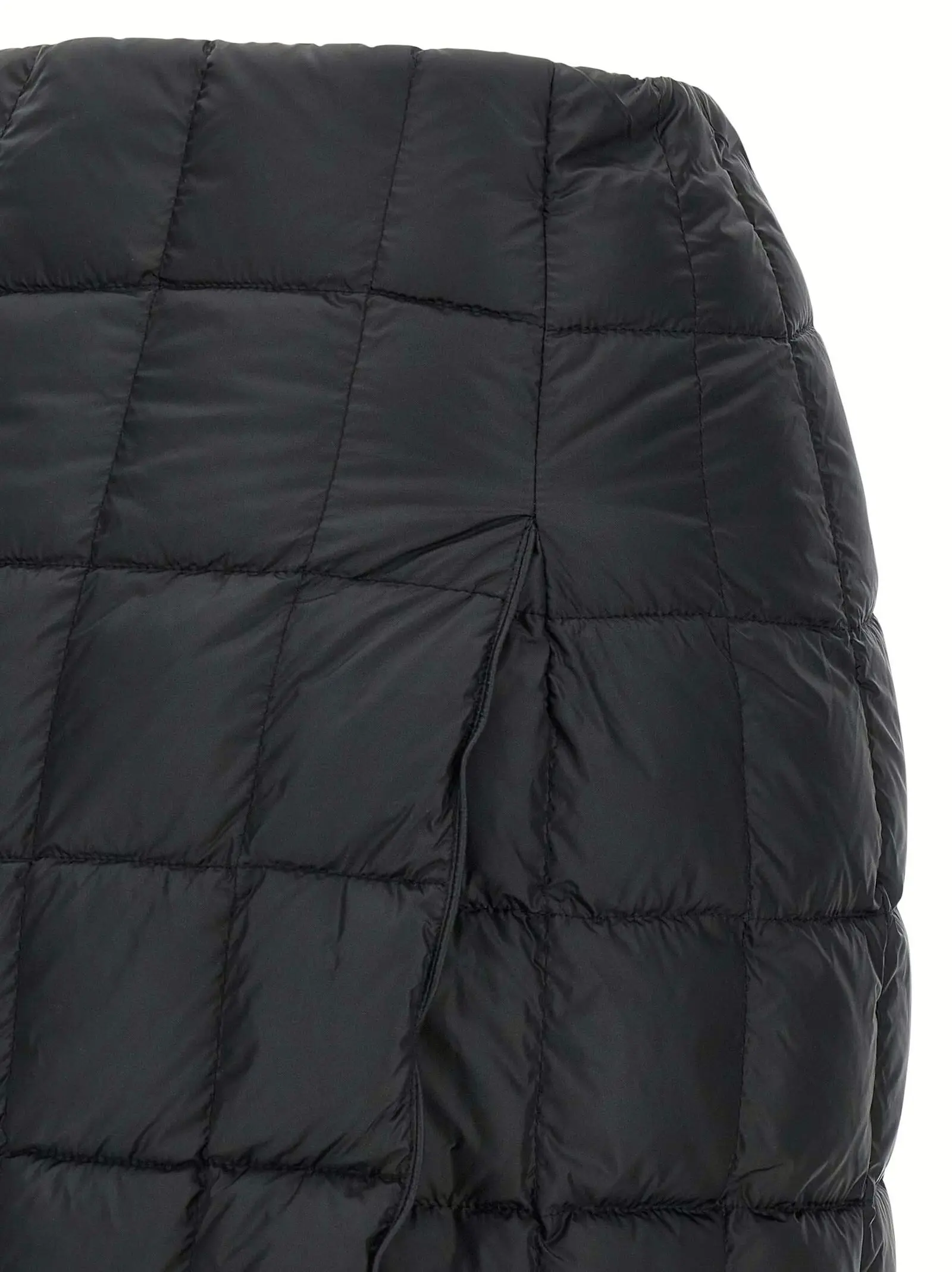 Чорна міні-спідниця з плащової тканини з наповнювачем із гусячого пуху поєднує інноваційність і елегантність, забезпечуючи легкість і тепло. Високий пояс, передня кишеня та застібка на кнопках підкреслюють стиль і функціональність, створюючи універсальний елемент розкоші для сучасного гардероба.