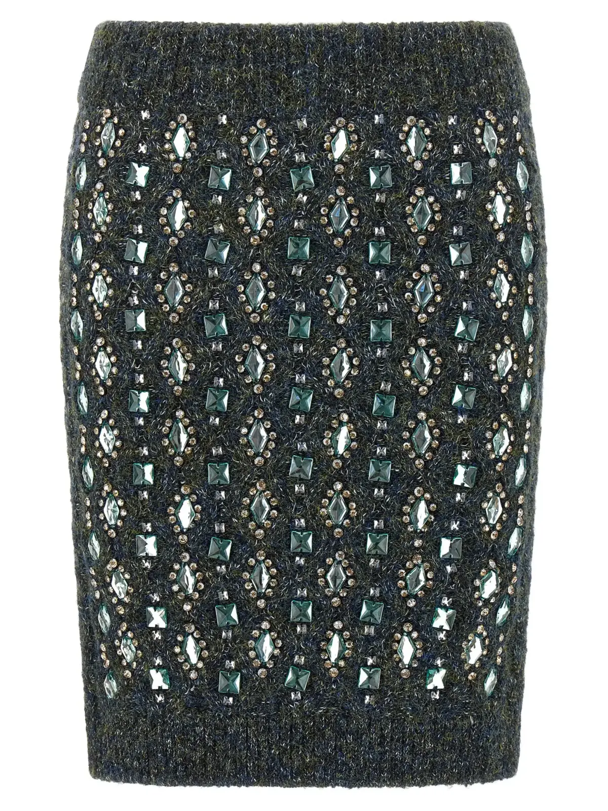 Елегантна багатокольорова мініспідниця, створена з високоякісної суміші поліестеру, акрилу та еластану, поєднує в собі інноваційний трикотаж з геометричними візерунками зі стразів і перлин. Витончений дизайн з еластичним поясом і фірмовою емблемою на спині підкреслює статус і бездоганний стиль, роблячи цей виріб універсальним вибором для сучасної модниці.