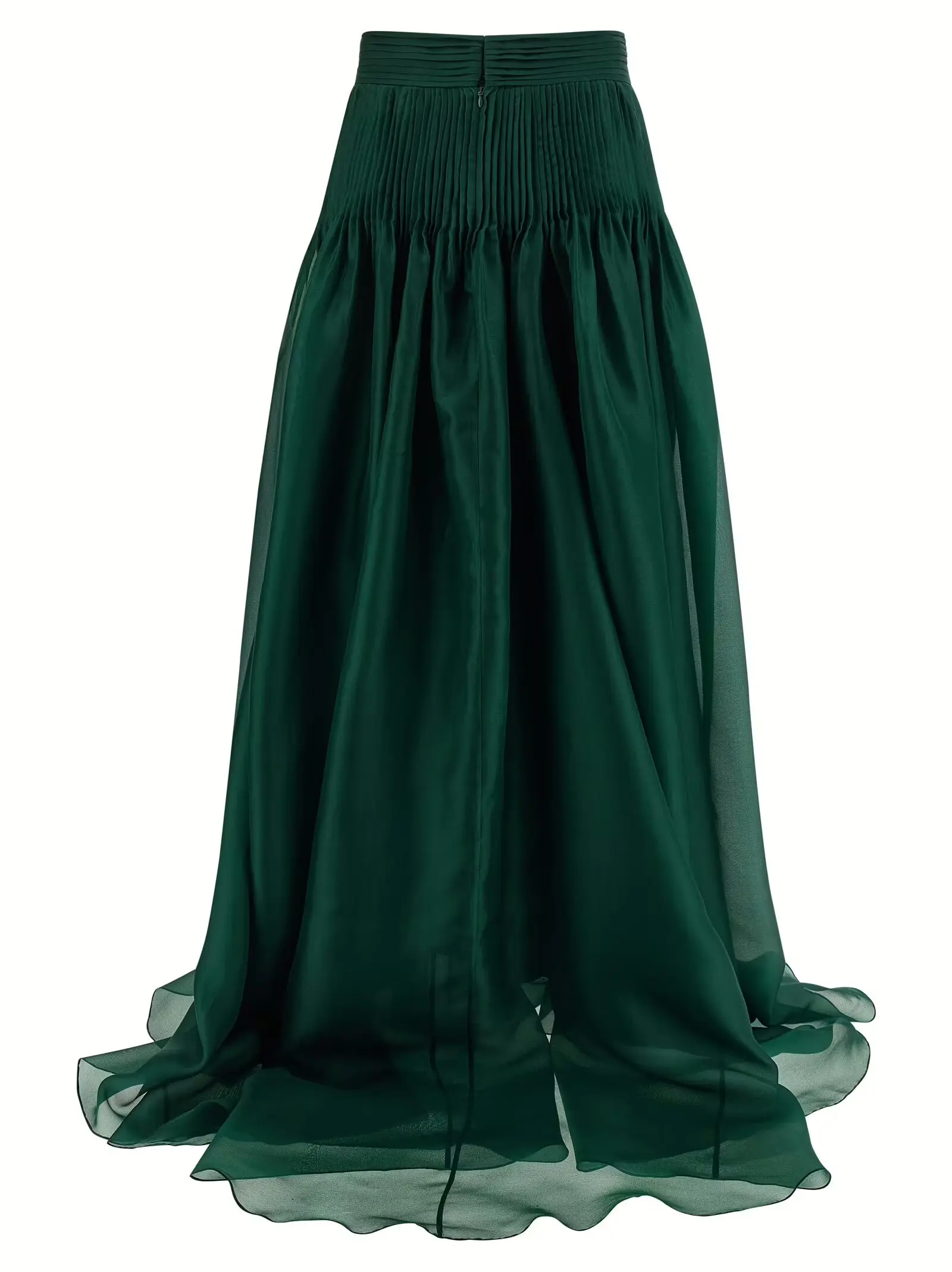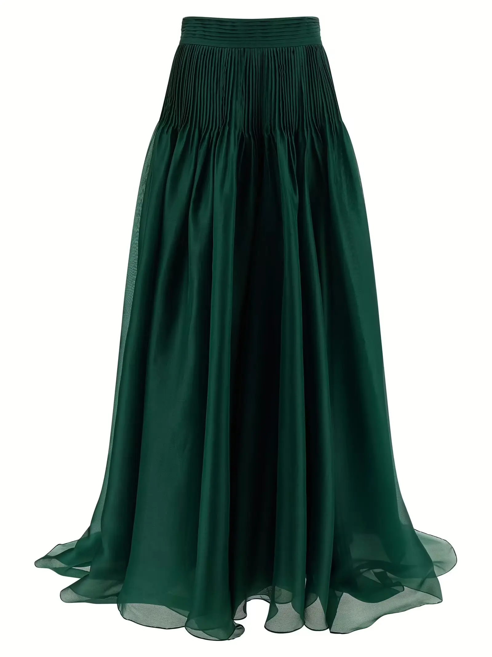 Елегантна спідниця з прозорої шовкової органзи насиченого зеленого відтінку, виконана з 100% шовку, вирізняється витонченими плісе на талії, об’ємною, легкокрилою силуетом з подолом і високою талією. Ідеальний вибір для створення вишуканого образу з акцентом на статус і неперевершений стиль.