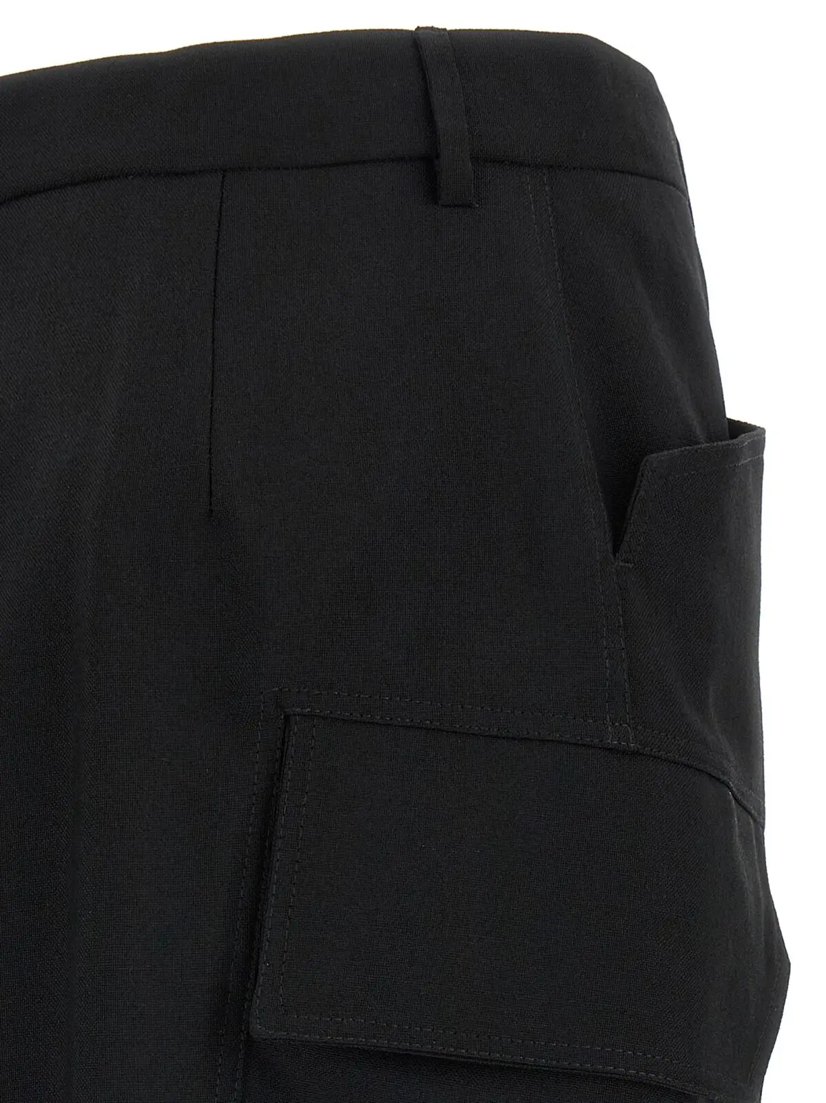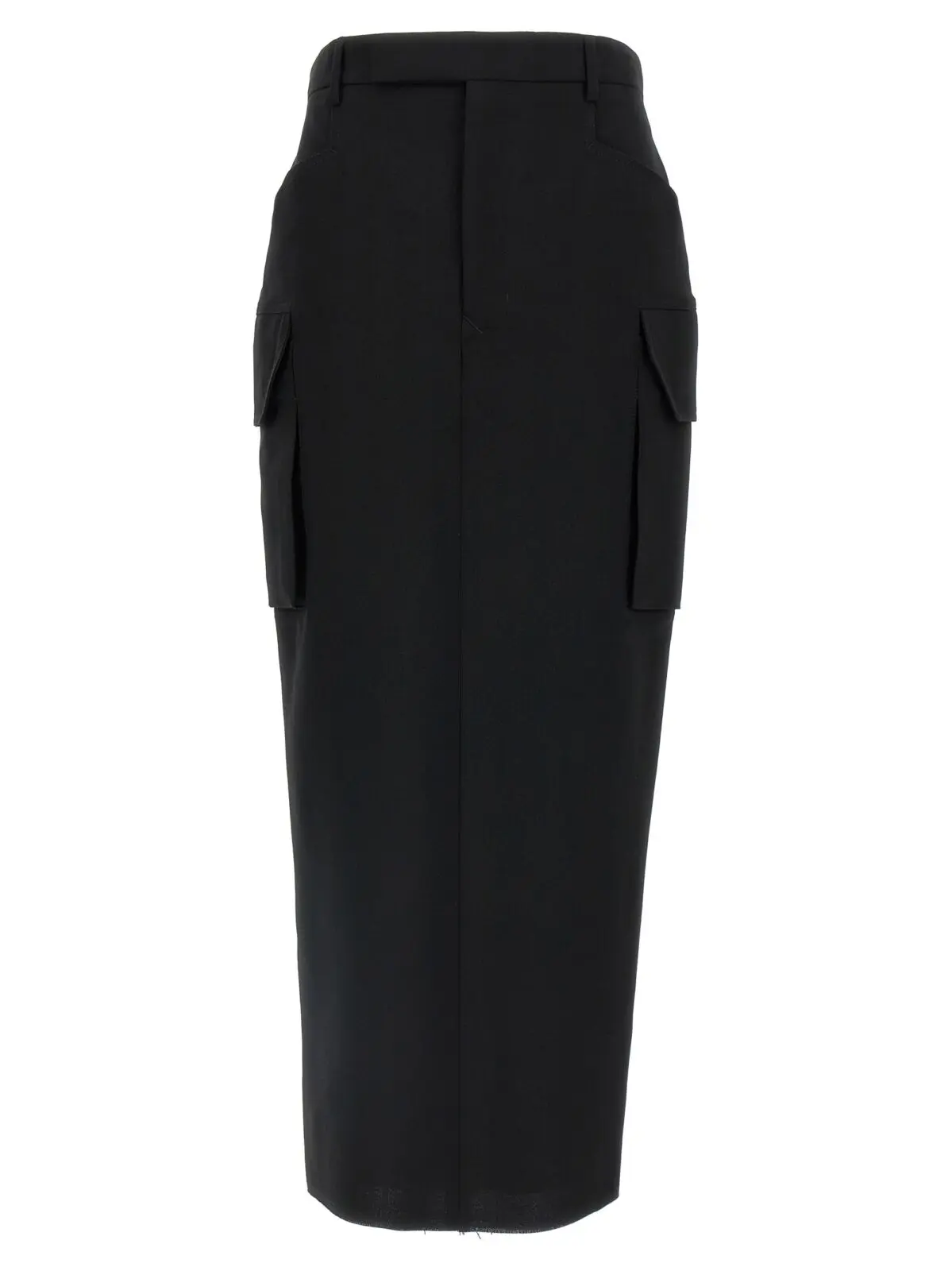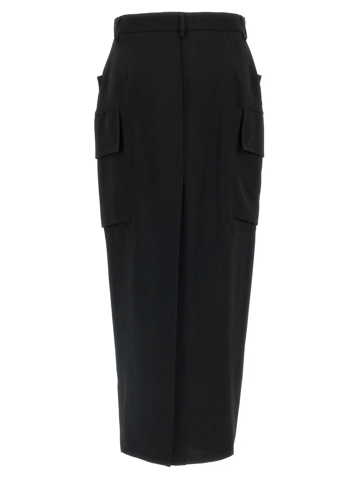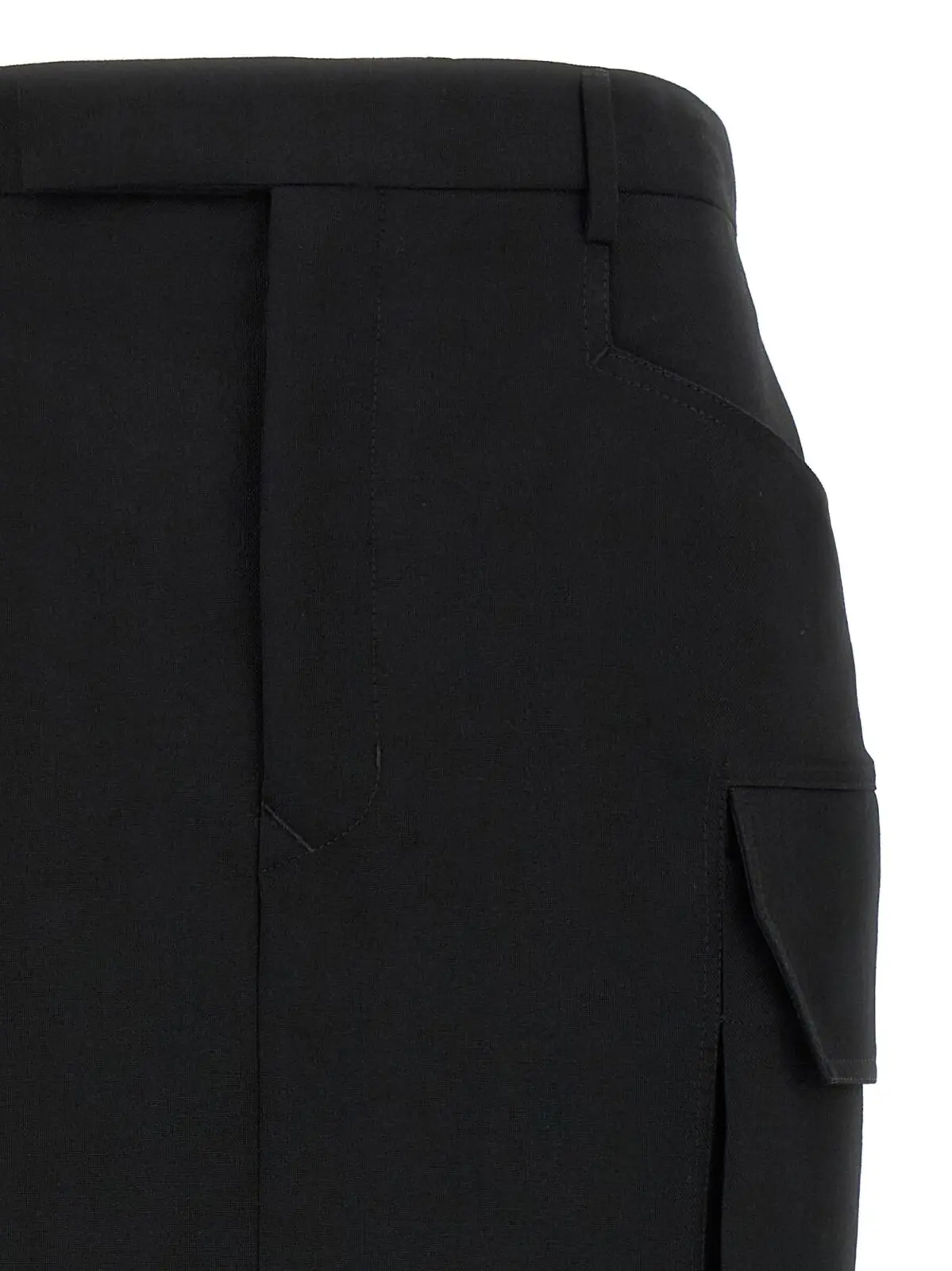 Чорна міді спідниця з колекції Firebanks виготовлена з 100% вовни з підкладкою з купро, поєднує сучасний карго-дизайн із функціональністю бокових кишень, застібкою на блискавці та гачку і широким розрізом ззаду. Вишукана, інноваційна та універсальна модель підкреслює статус і бездоганний стиль.