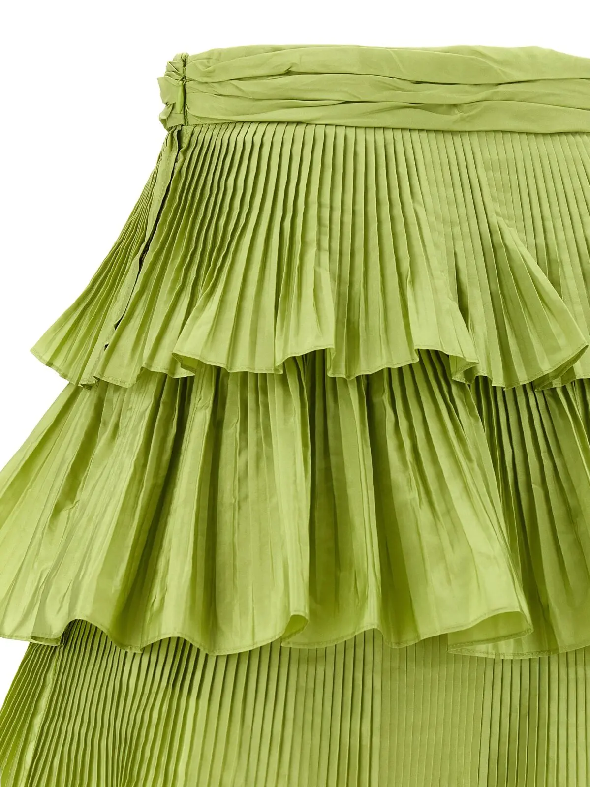 Ця зелена мініспідниця з плісированого тафти з воланами виготовлена з 100% шовку, що забезпечує неперевершену легкість і ніжність матеріалу. Вишуканий дизайн поєднує інноваційність і класичну елегантність, підкреслюючи статус і бездоганний стиль власниці.