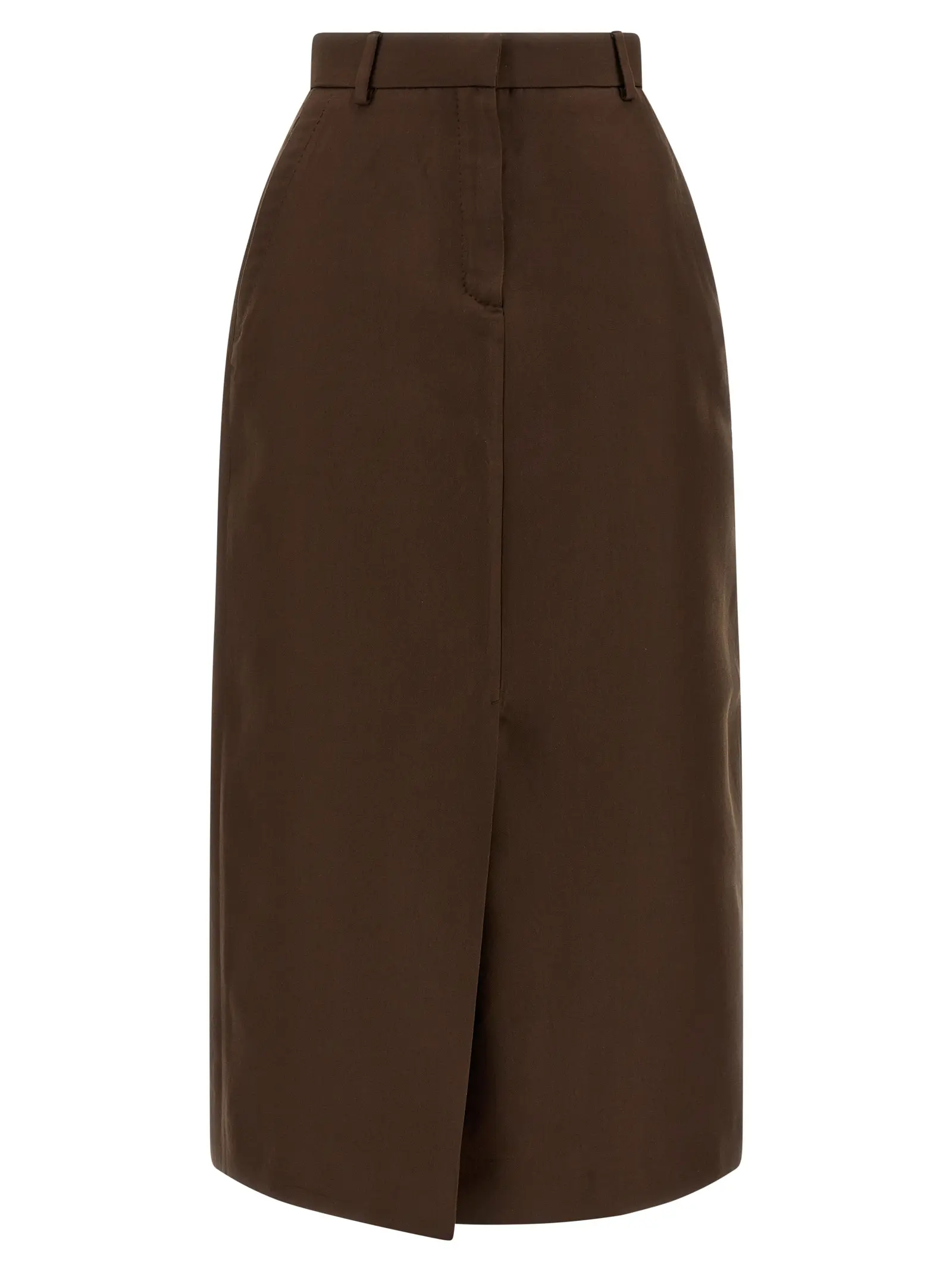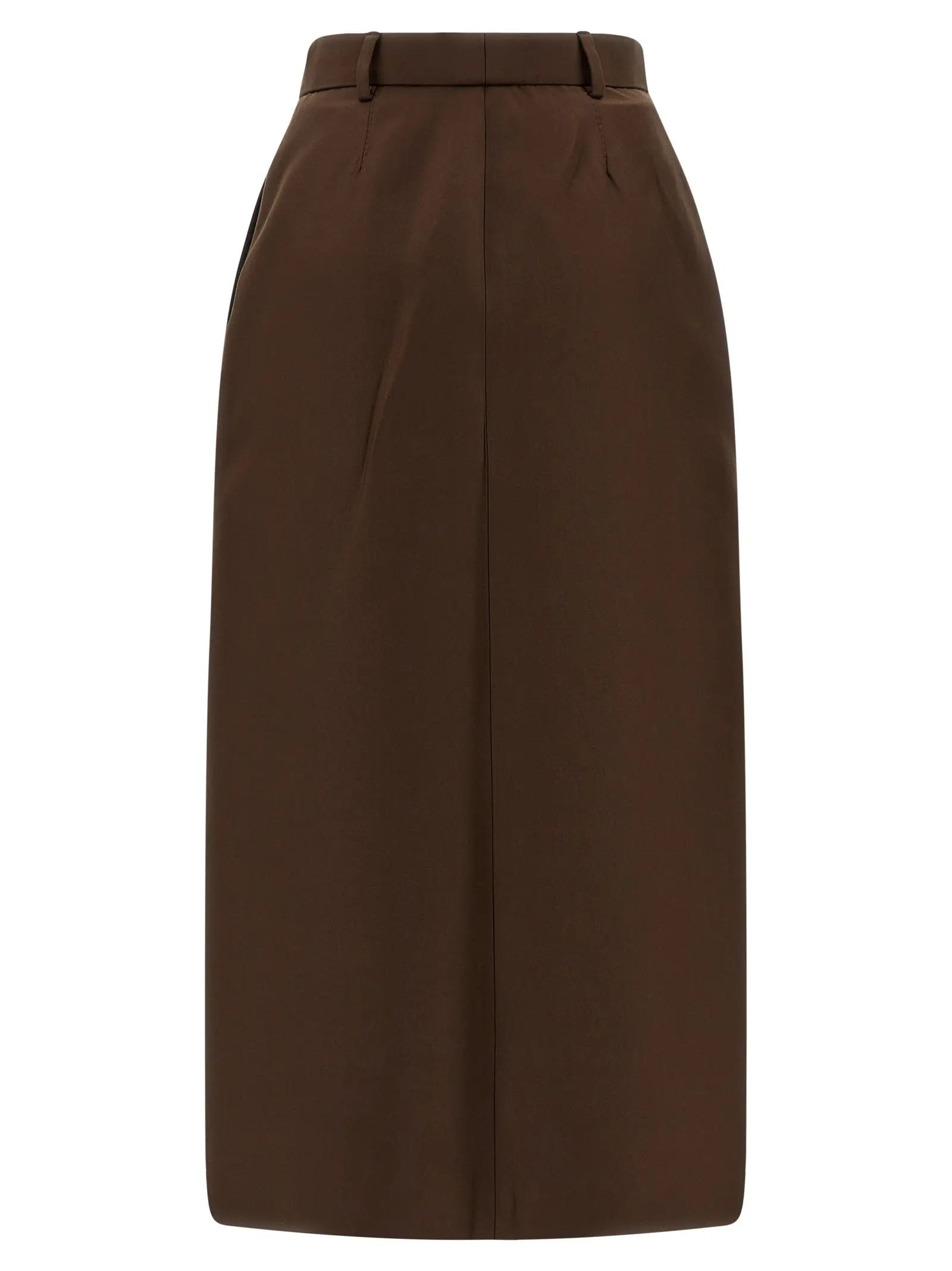 Коричнева спідниця міді з натурального шовку з підкладкою з купро поєднує в собі вишуканість і комфорт, має прямий силует із застібкою на блискавку, гачок і передні ґудзики, а також елегантний розріз ззаду, що підкреслює статус і неперевершений стиль.
