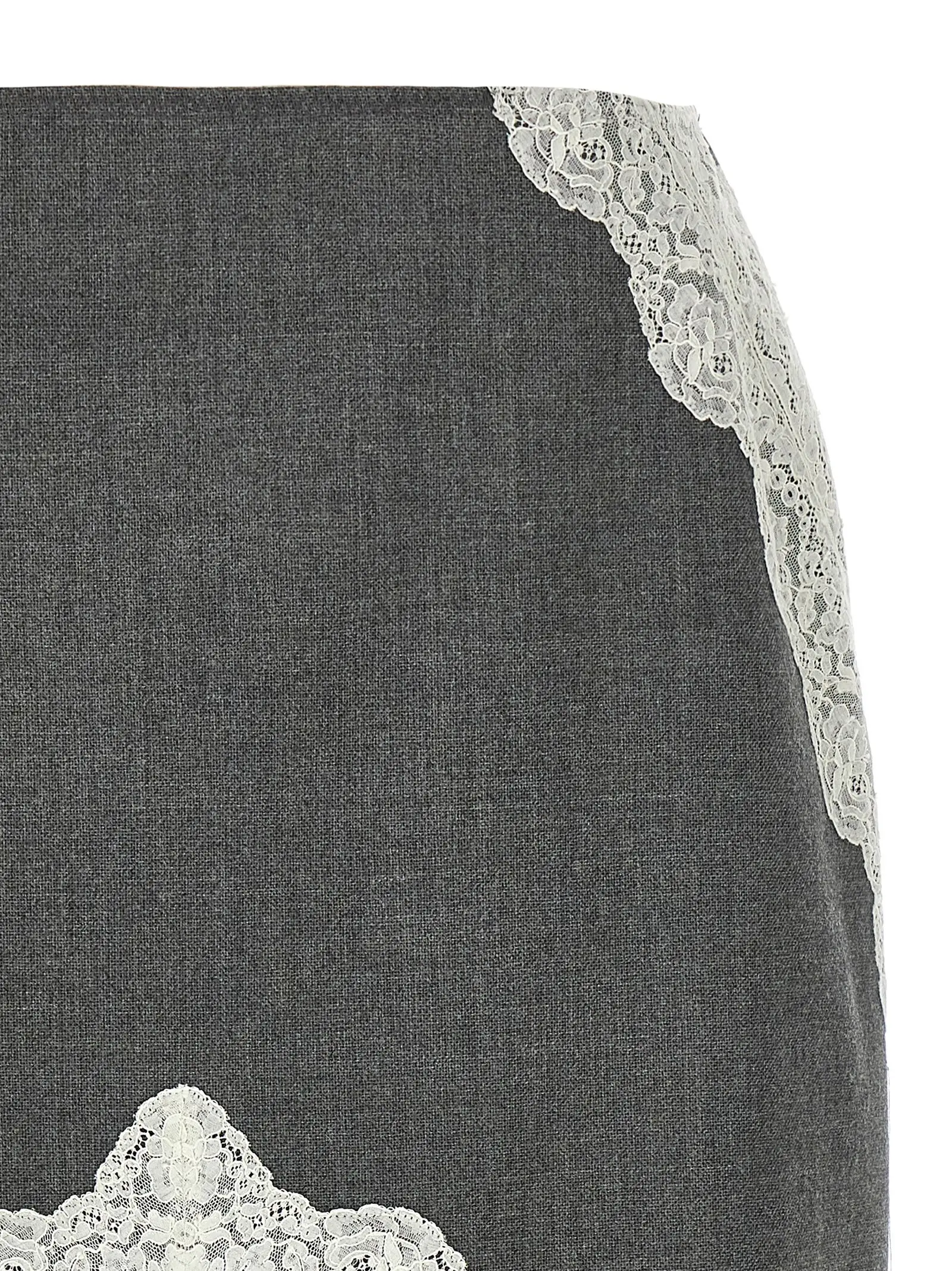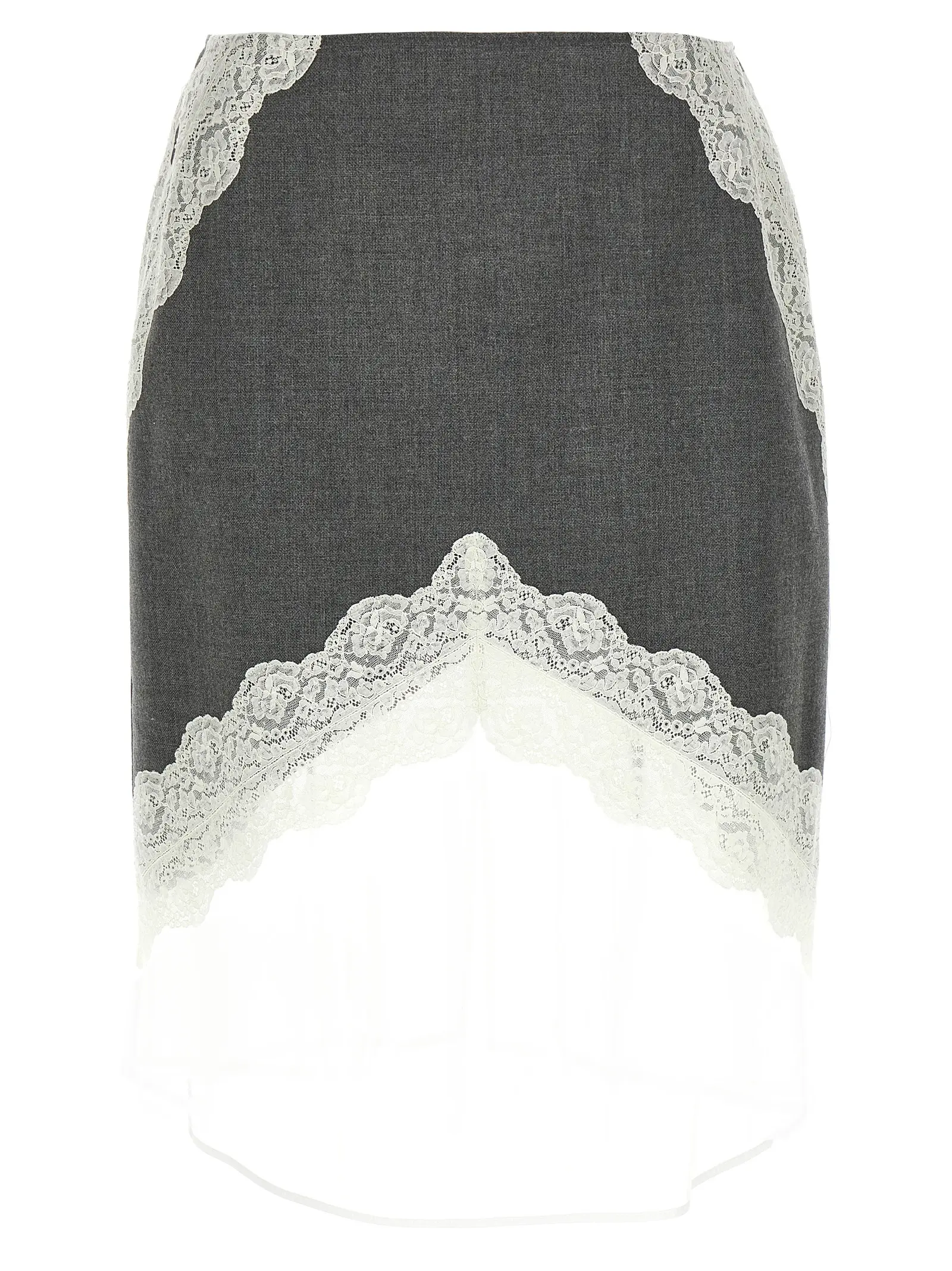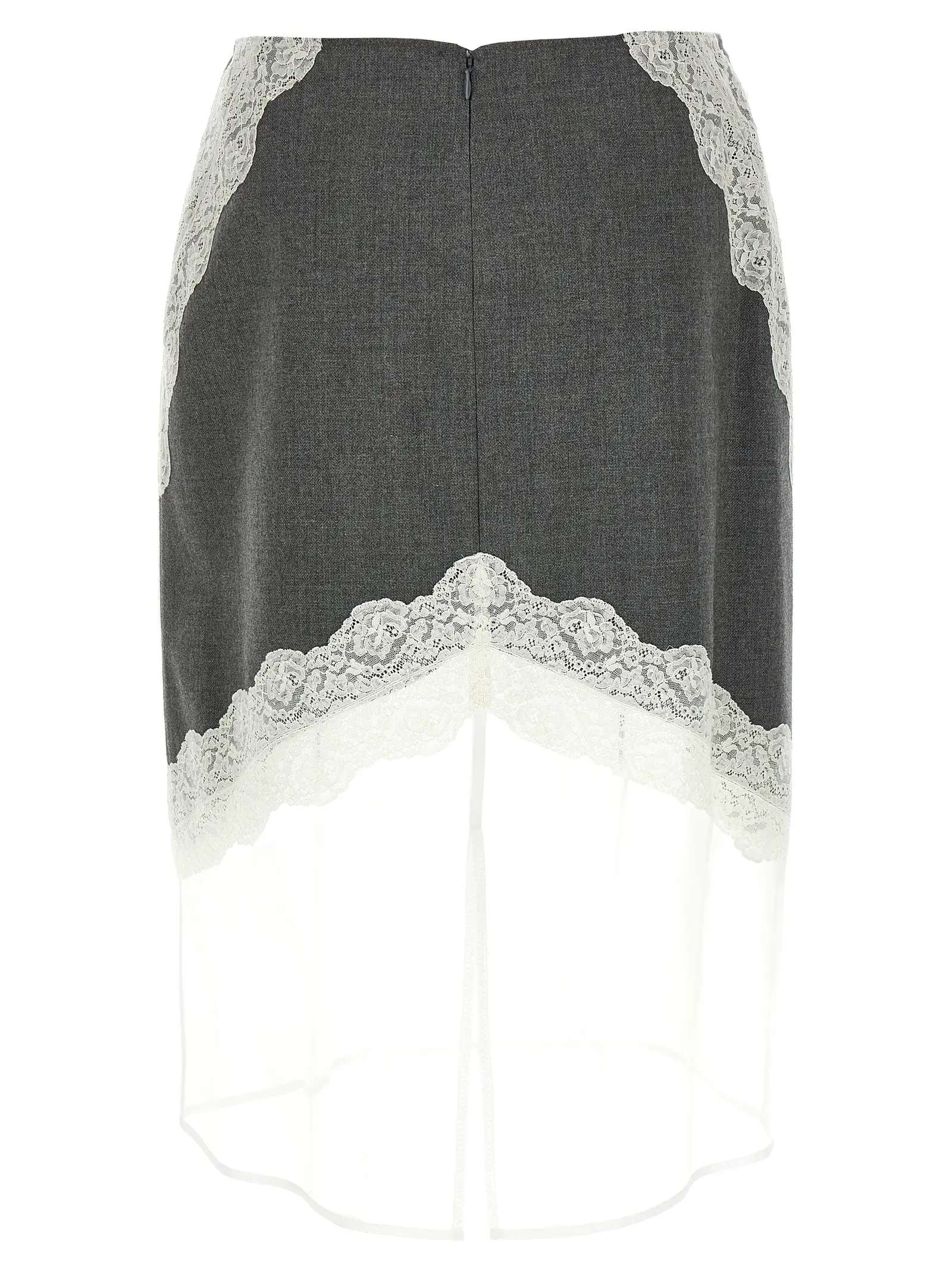 Спідниця міді з вовняного канвасу з вставками з мережива та низом з органзи. Прямий крій злегка завищена талія. Застібка на блискавку та розріз ззаду. Підкладка з віскози. Матеріал 100 відсотків поліестер.
