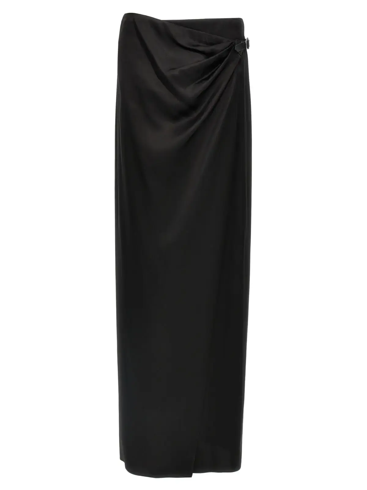 Чорна спідниця довжини максі з подвійного шовкового сатину дарує неперевершену легкість і розкіш, підкреслену шкіряним поясом із металевою пряжкою та елегантною обробкою талії стрічкою гросгрейн. Цей виріб поєднує інноваційний дизайн і бездоганну якість, створюючи статусний образ, який ідеально пасує для вишуканих та універсальних стильових рішень.