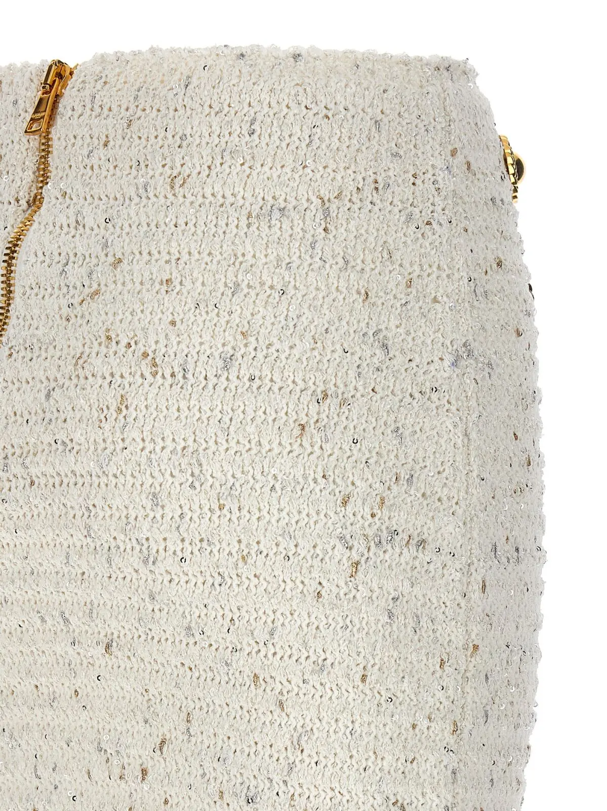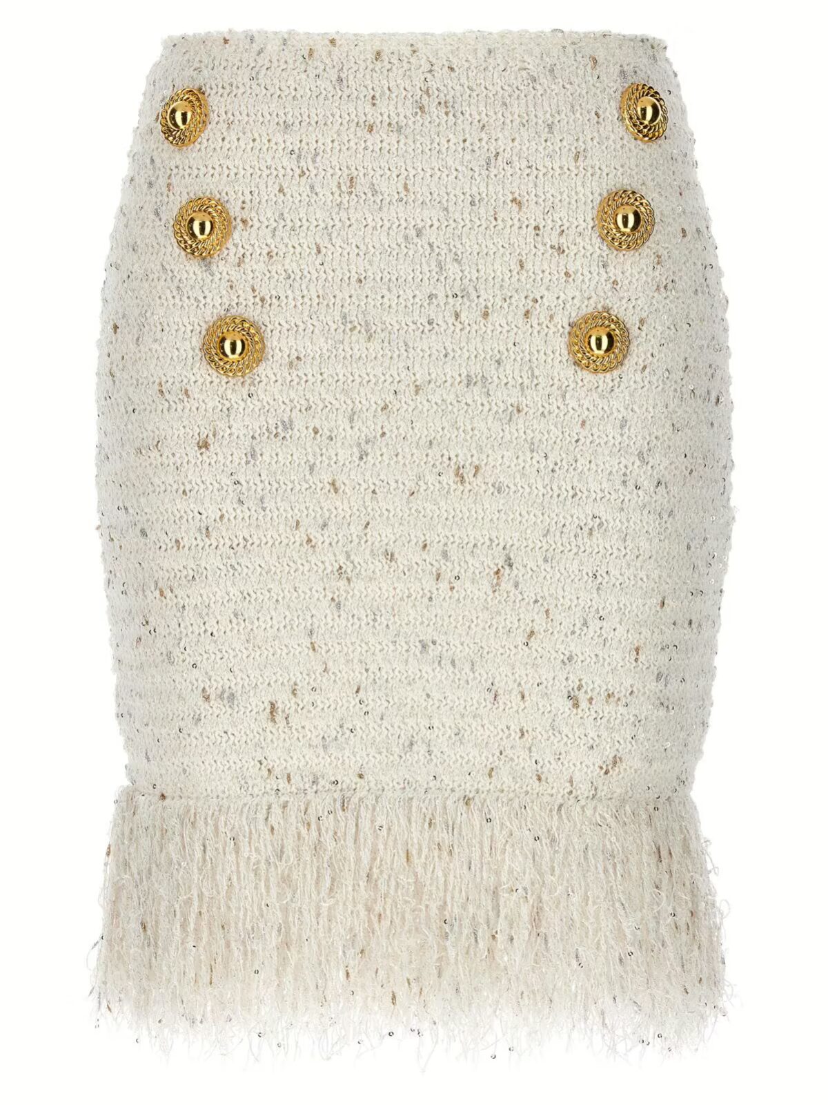 Спідниця з бахромою з твіду Balmain Білий жіноча Fringed Tweed tweed skirt з пайєтками та бахромою на низу, передні кнопки з логотипом, задній блискавковий застібка.