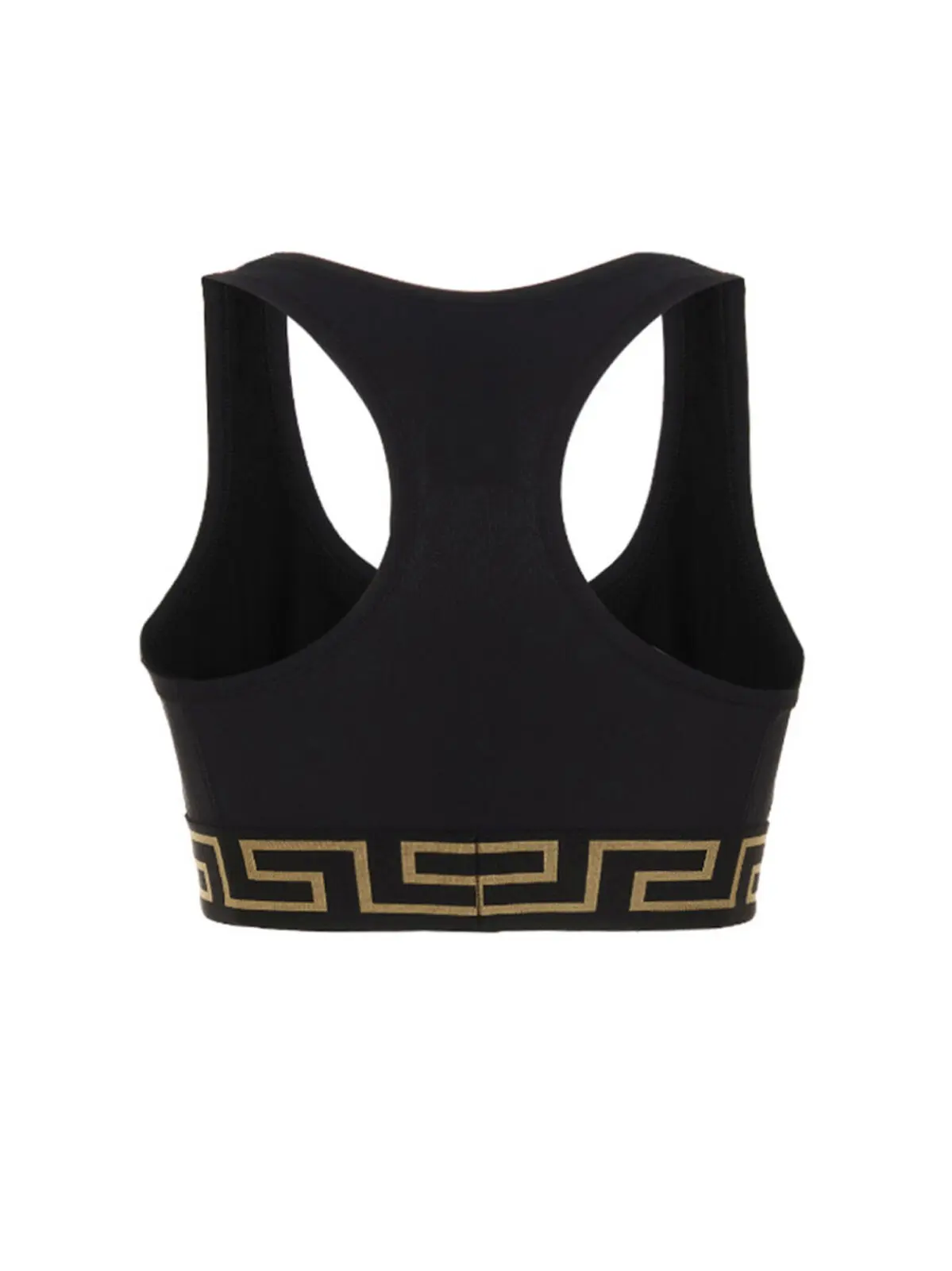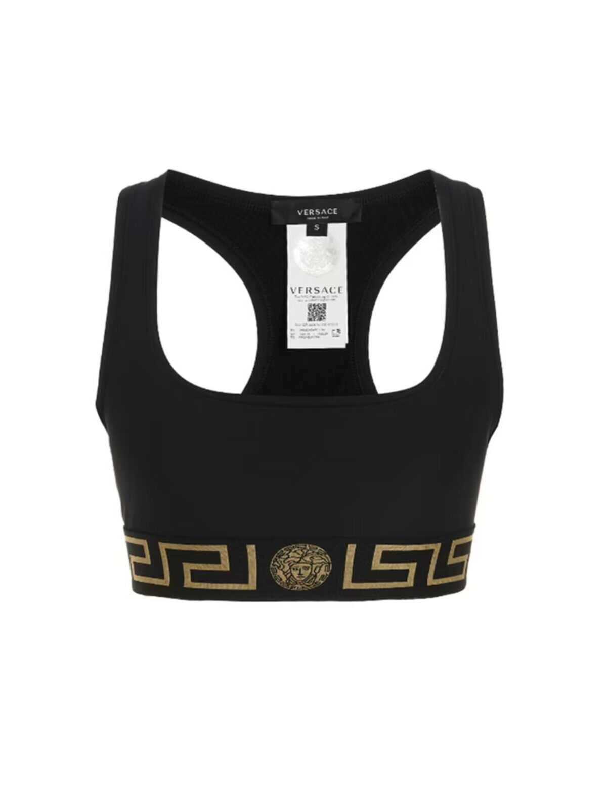 Завдяки спортивному топу Medusa від Versace ви зможете почуватися стильною і впевненою під час тренувань. Чорний колір топу додає йому елегантності і підходить до будь-якого спортивного образу. Виготовлений з лайкри, цей топ забезпечує комфорт і свободу рухів. Його еластична тканина забезпечує підтримку грудей під час фізичних навантажень. Логотип Medusa на еластичній стрічці додає особливого шарму цьому спортивному топу. Він стане незамінним елементом вашого гардеробу для активного способу життя.