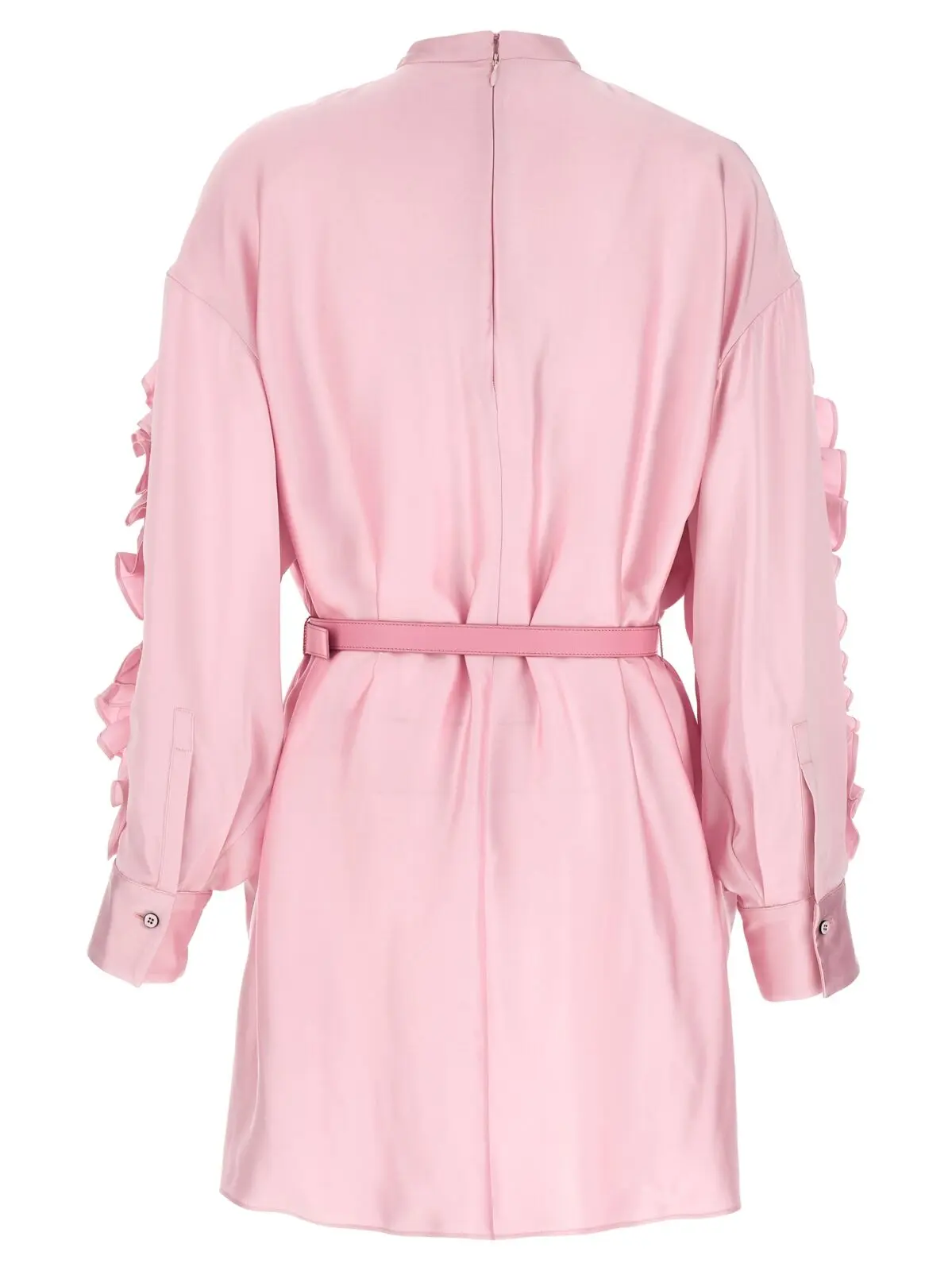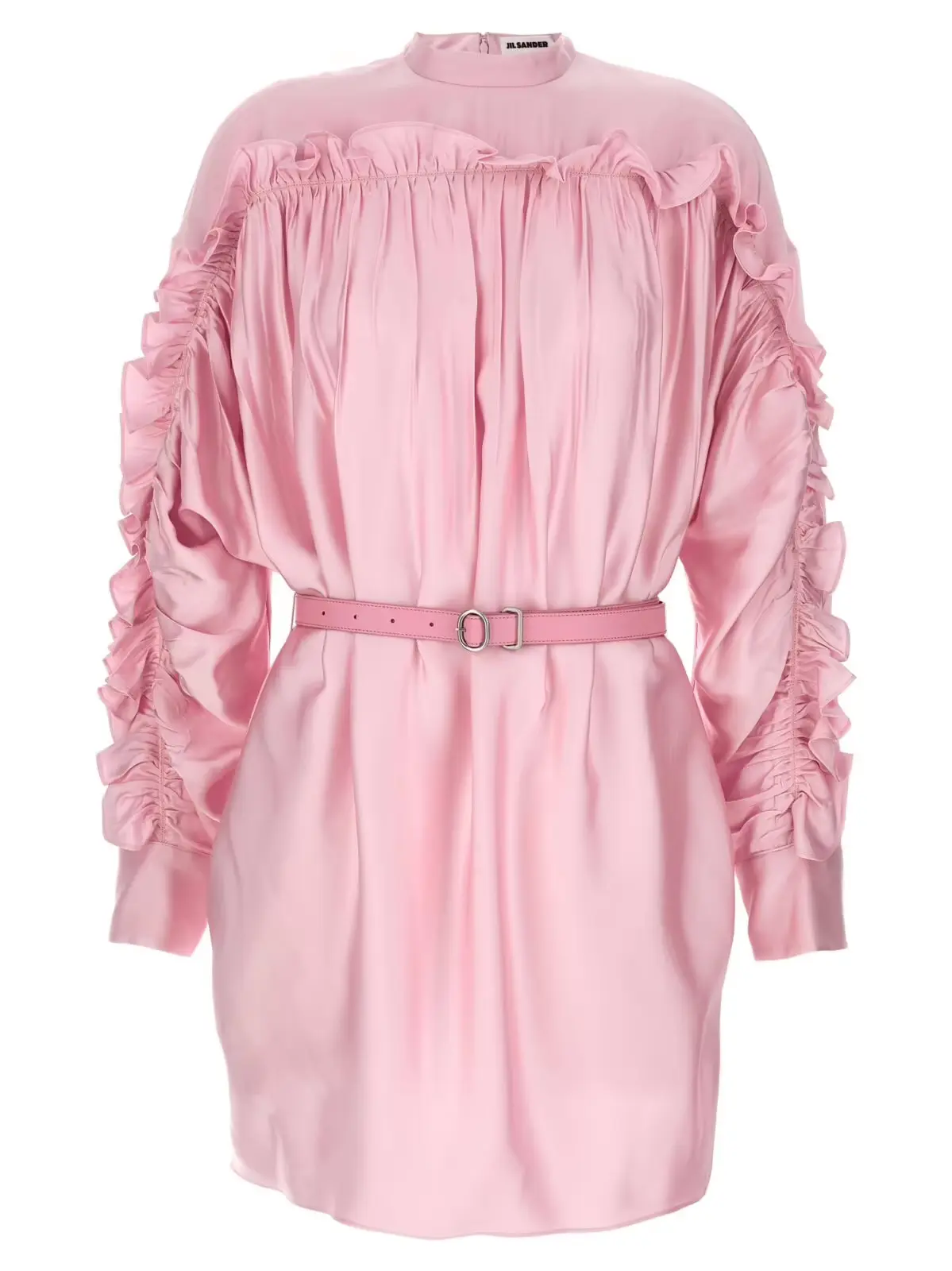 Сукня Jil Sander рожевого кольору – це жіноча сукня зі штучного шовку. Вона має високий комір, довгі рукава, аплікацію з оборками, задню блискавку та кишені. Виготовлена з 100% віскози.