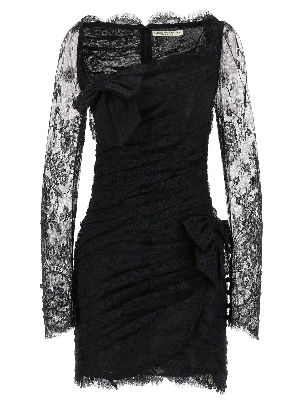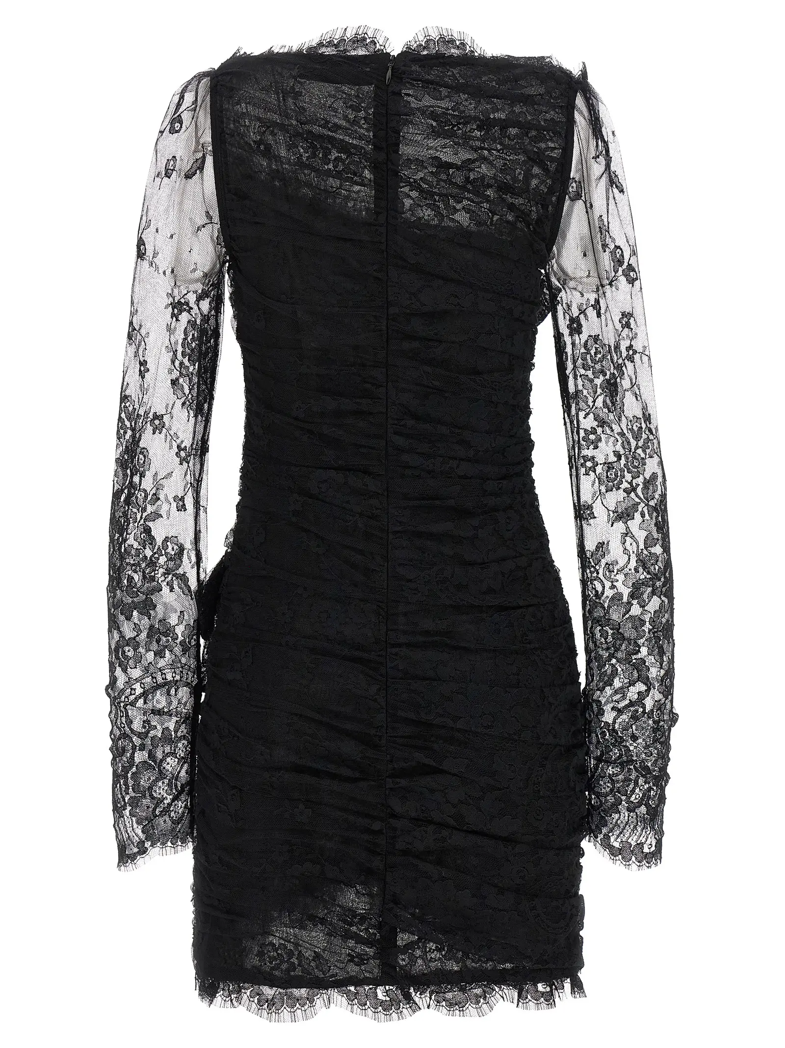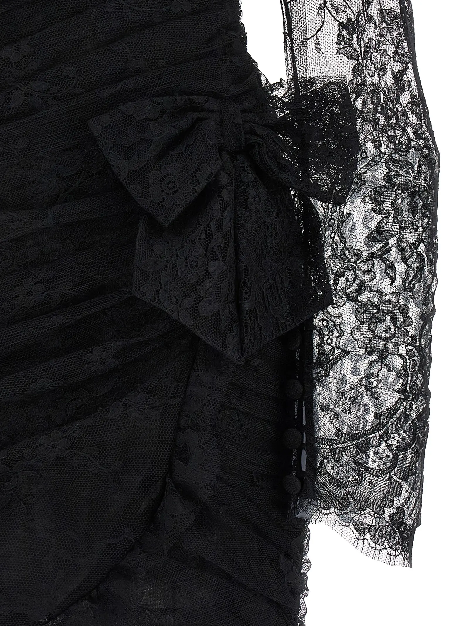 Вишукана чорна міні-сукня з драпіруванням виконана з екологічної органічної бавовни та поліаміду, поєднує прозорі довгі рукави та глибокий виріз, підкреслюючи витонченість і жіночність. Ідеальна для створення статусного образу, що випромінює стиль і сучасну елегантність.