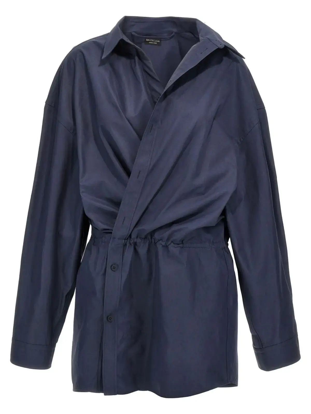 Сукня з високоякісного бавовняного попліну насиченого синього відтінку поєднує інноваційний асиметричний дизайн із витонченістю класики, має регульований пояс для ідеальної посадки та довгі рукави з ефектом заниженого плеча, підкреслюючи стиль і статус у будь-якій ситуації.