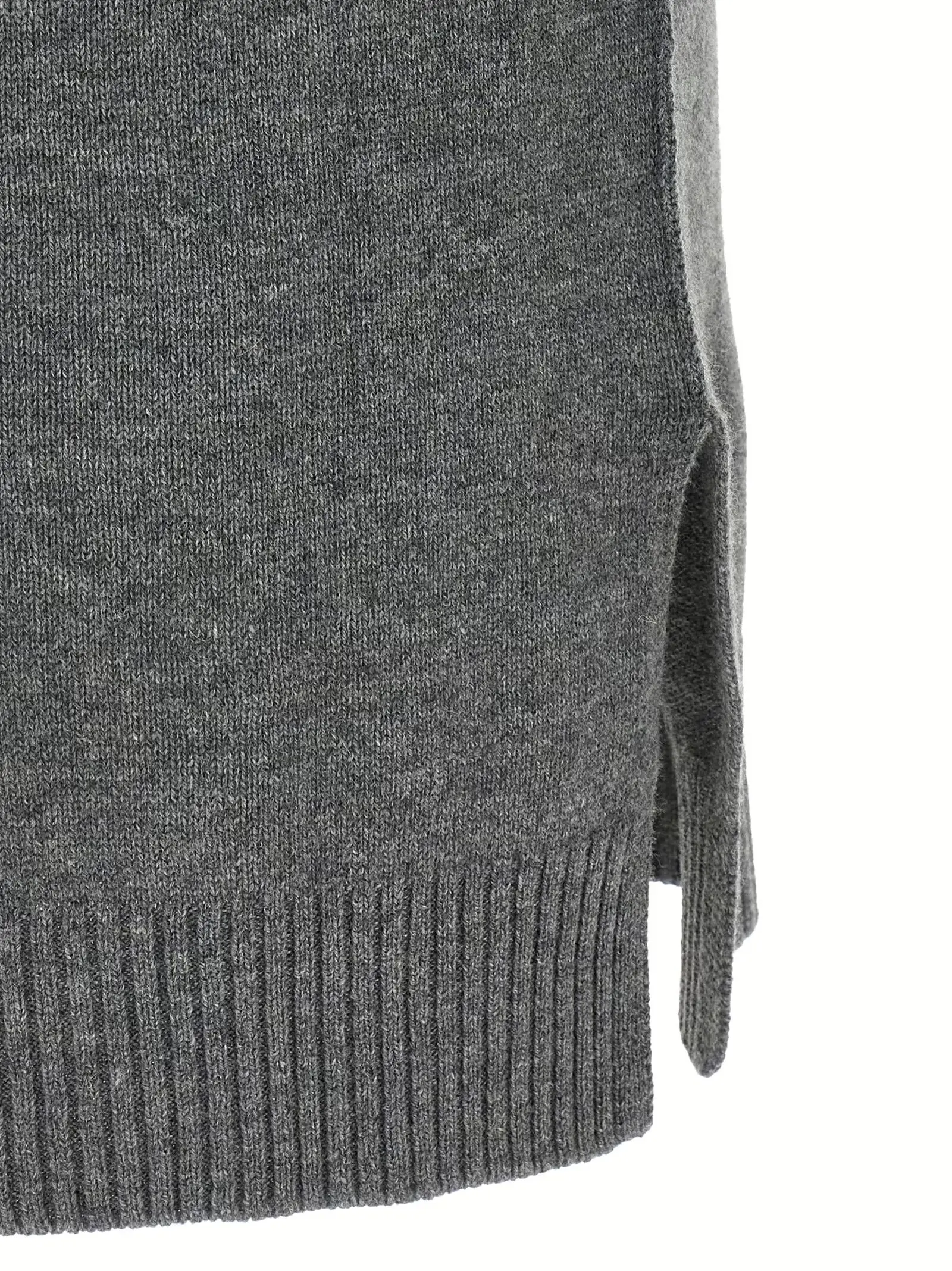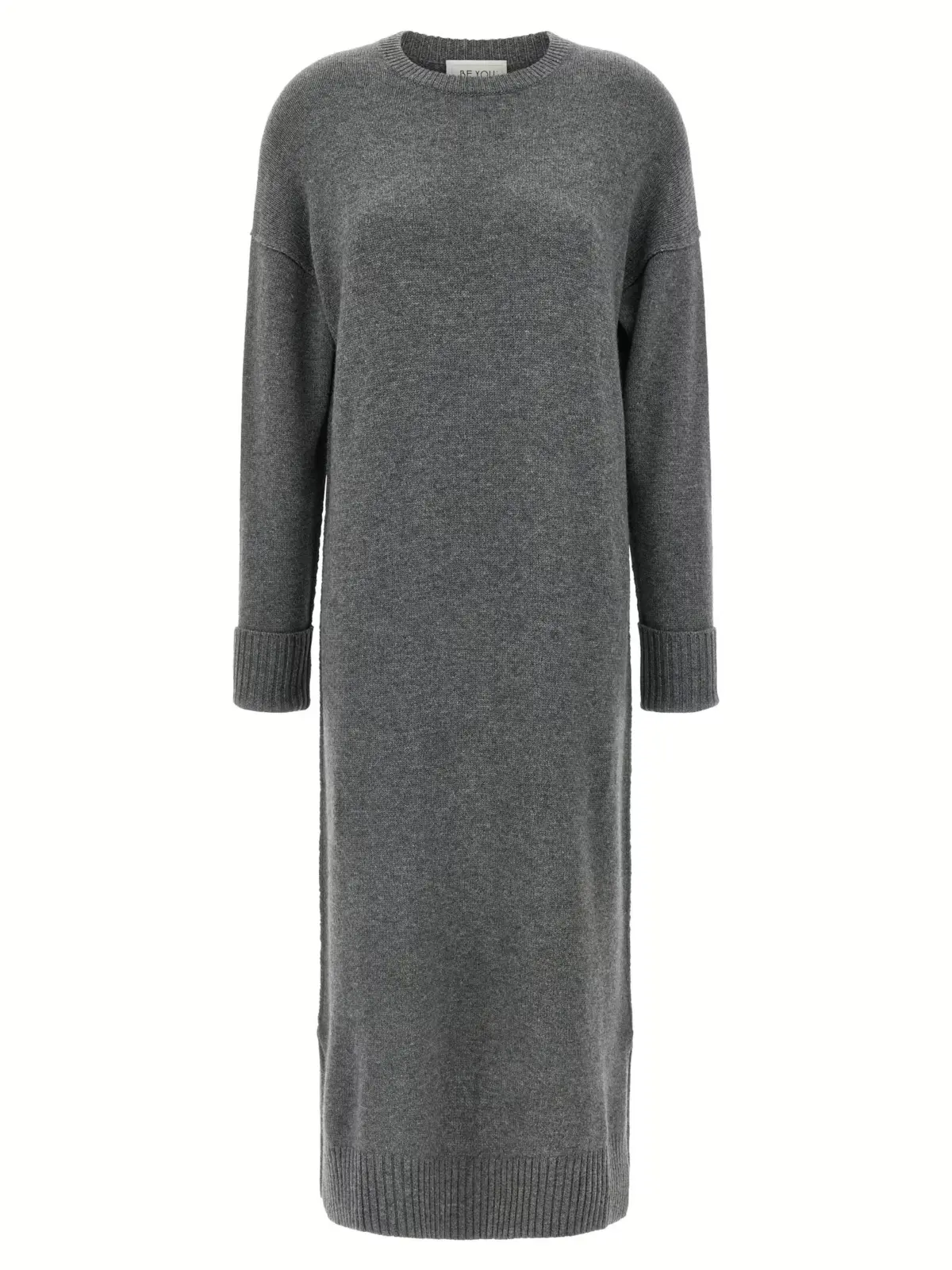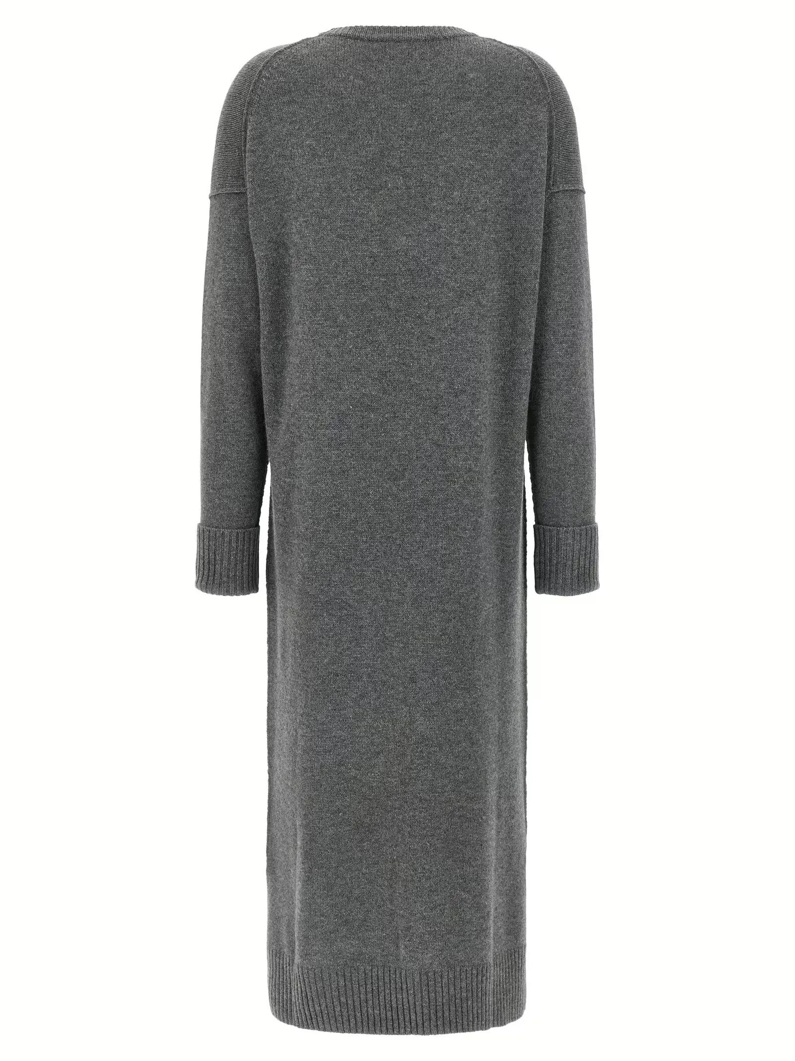 Вишукана сукня з 100% кашеміру сірого відтінку поєднує в собі неперевершену м’якість і бездоганний крій з круглим вирізом, довгими рукавами з підвернутими манжетами та елегантними розрізами з боків, що підкреслюють статус і стиль, даруючи комфорт і універсальність у будь-якій ситуації.