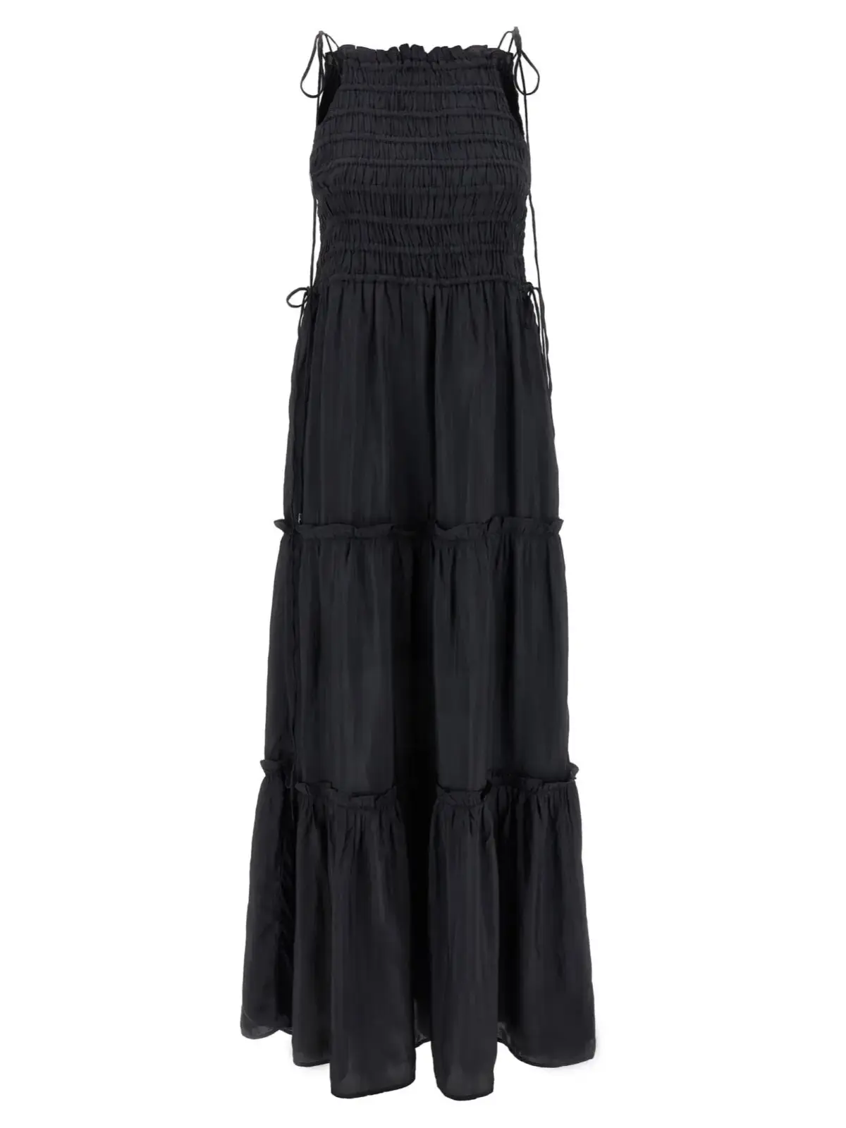 Вишукана сукня з 100% віскози поєднує легкість і комфорт завдяки американському вирізу, елегантній зборці та тонким регульованим бретелям. Розкішний багатошаровий фасон із затяжкою на талії підкреслює жіночність, надаючи образу вишуканого стилю та статусної універсальності.