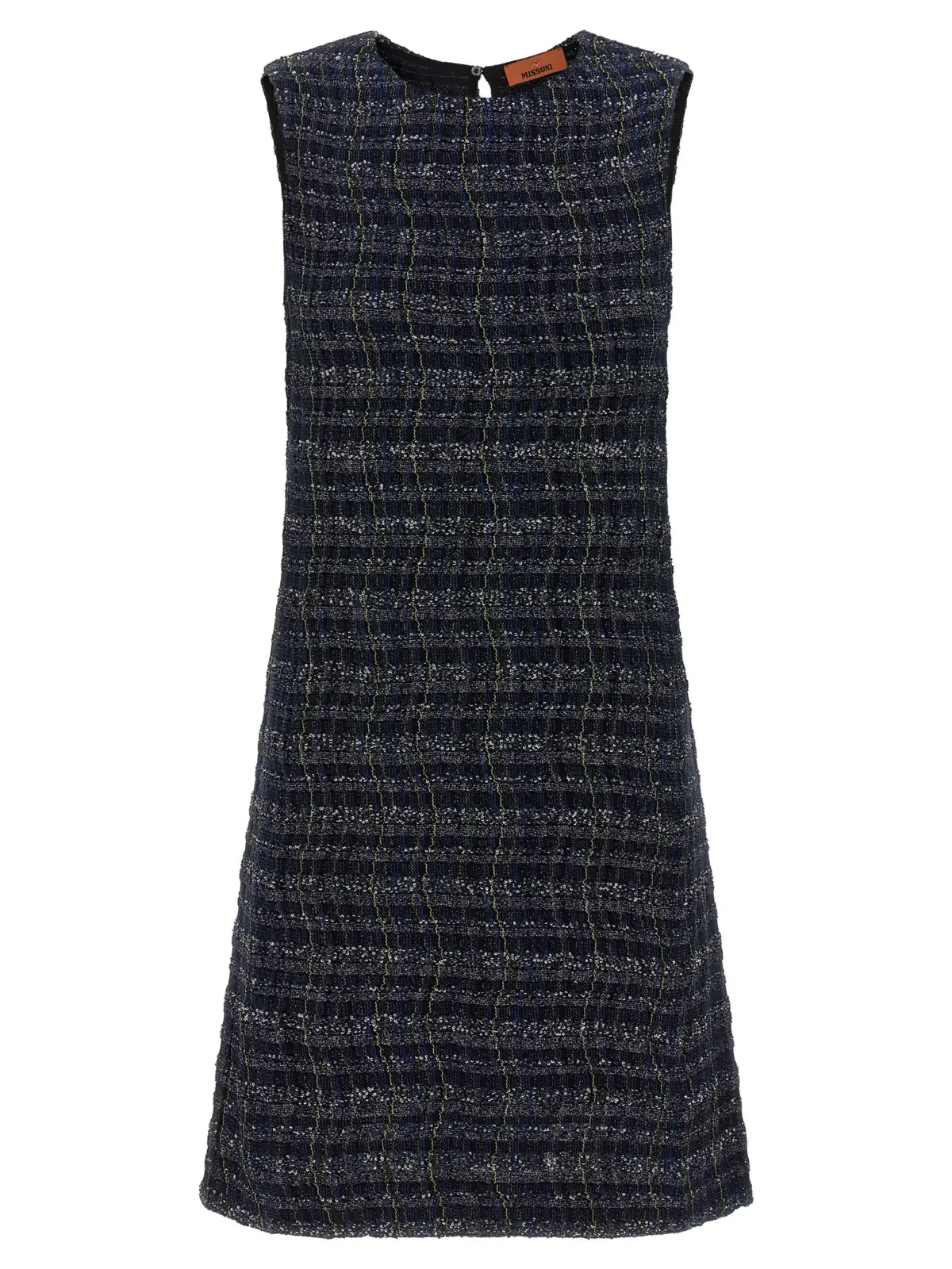 Сукня з короткою довжиною. Матеріал складається з віскози з ламе. Текстурована тканина з хвилястим візерунком у клітинку. Силует розкльошений. Без рукавів. Виріз круглий. Застібка ззаду на ґудзик. Присутній виріз у вигляді краплі. Є підкладка. Склад матеріалу включає віскозу, поліамід, металеві нитки, вовну, бавовну та поліестер.