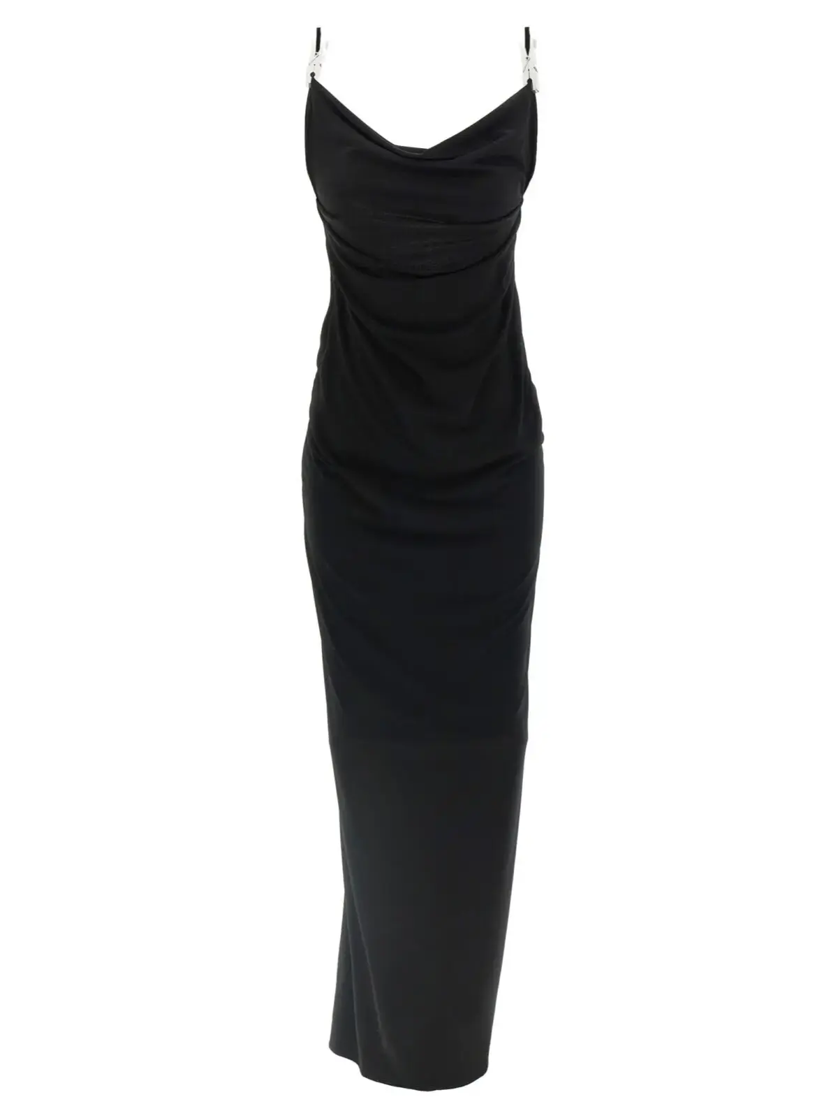 Ця елегантна чорна сукня виготовлена з легкого джерсі, що поєднує 95% поліестеру та 5% еластану, забезпечуючи комфорт і досконалу посадку. Вишуканий драпірований виріз і тонкі бретелі підкреслюють жіночність, а сріблясті металеві застібки на передній та задній частинах додають інноваційного акценту. Асиметричний широкий виріз ззаду та легке розширення спідниці створюють неповторний стиль, який гармонійно пасує для будь-яких урочистих подій, підкреслюючи статус і бездоганний смак.